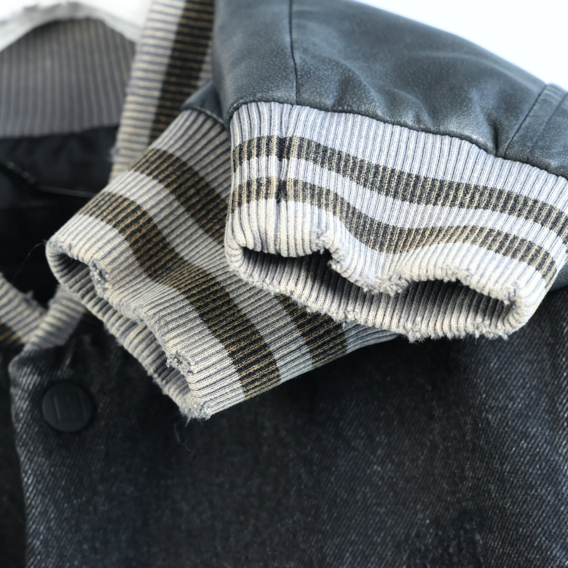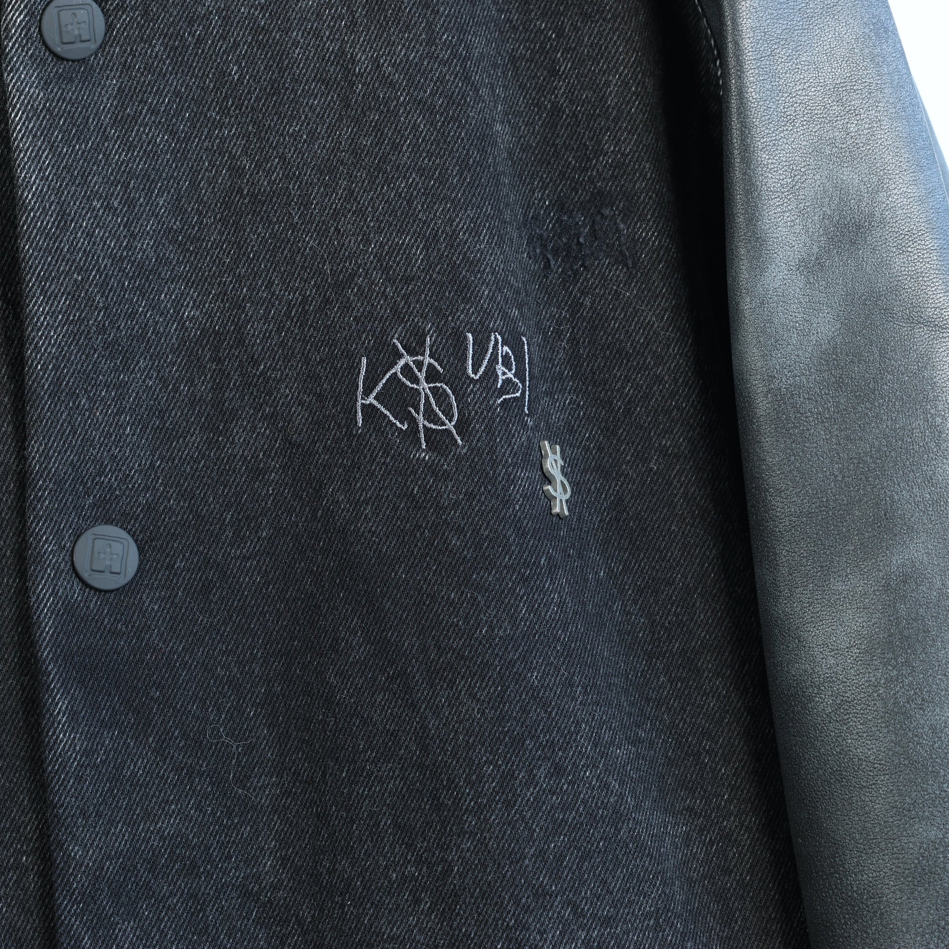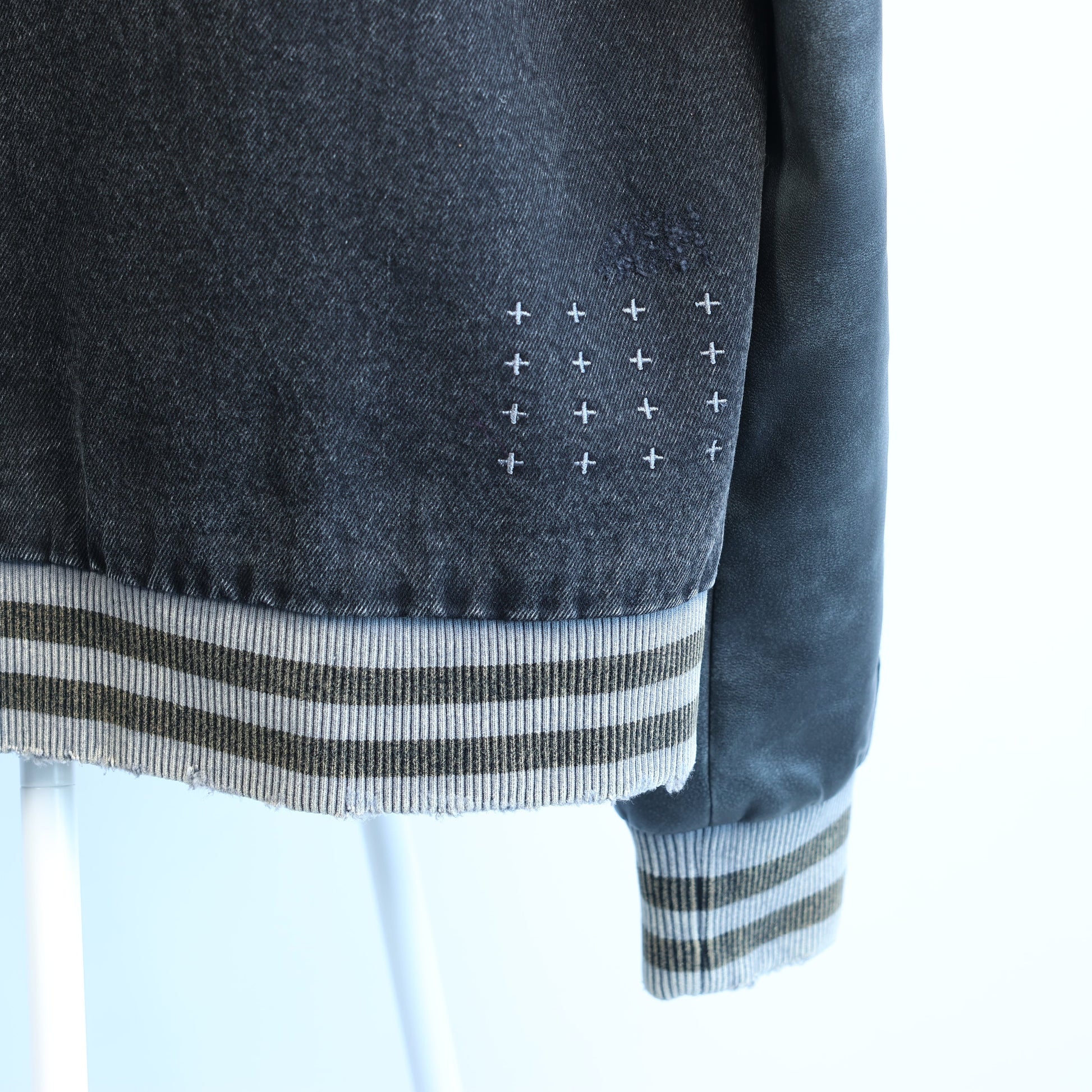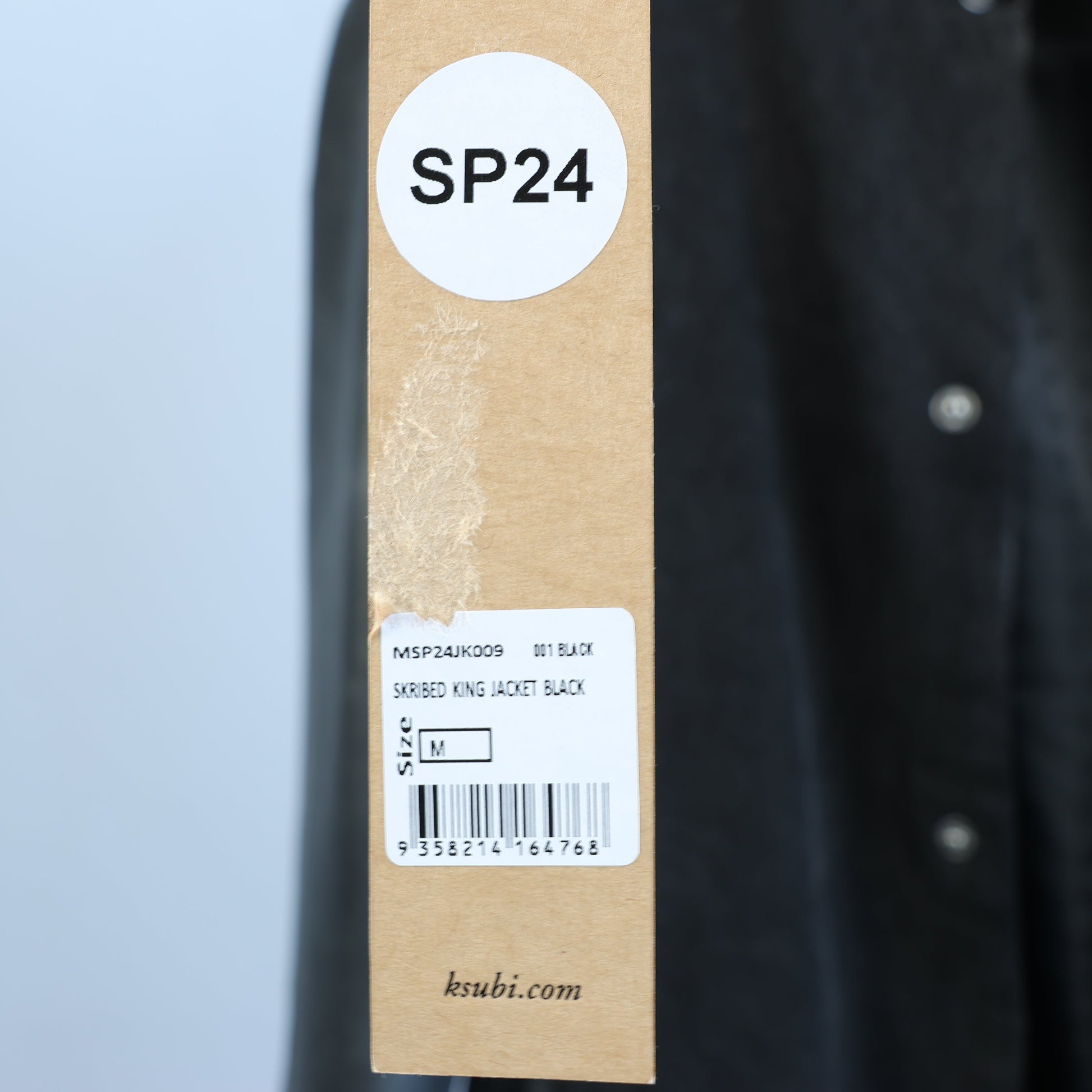 Ksubi Skribed King varsity jacket in black, size M. A statement piece with contrast grey sleeves, embroidered text details, and striped ribbed trims — the perfect fusion of rebellious streetwear and luxury craftsmanship.