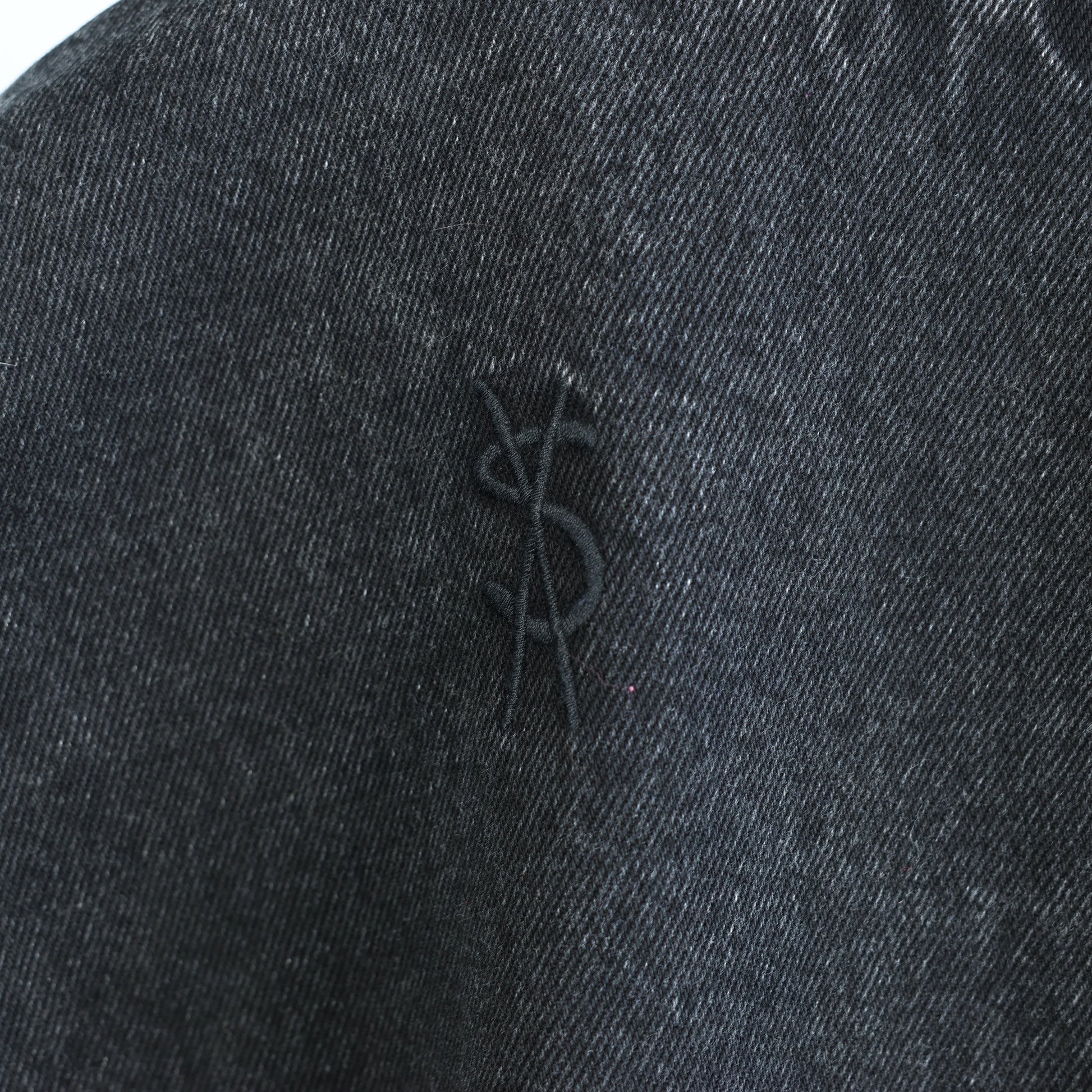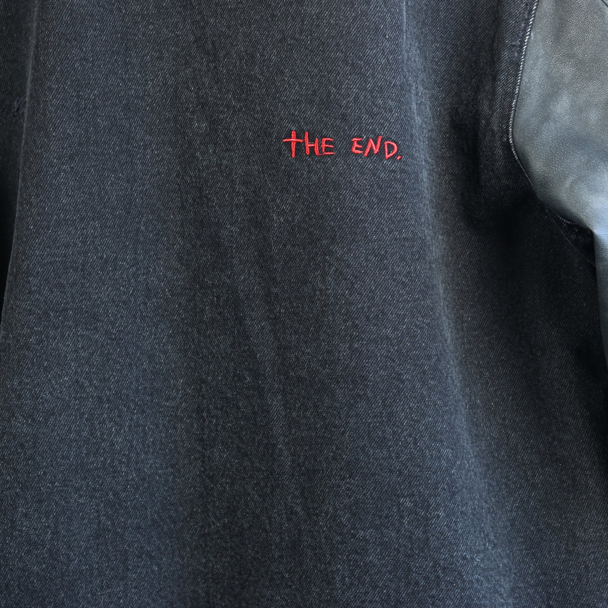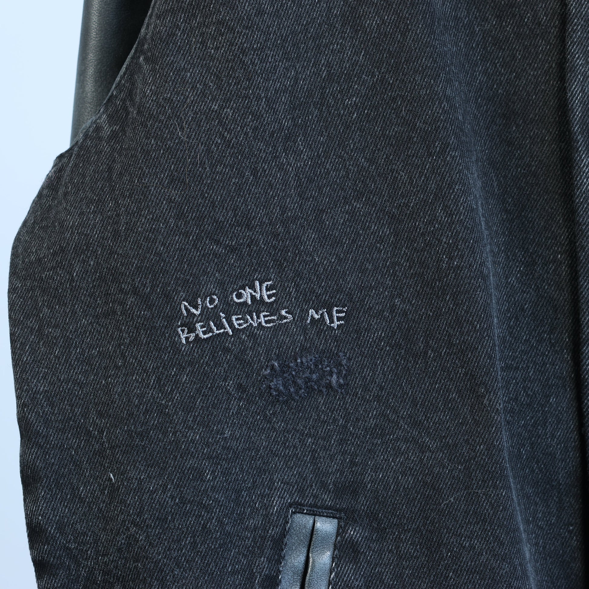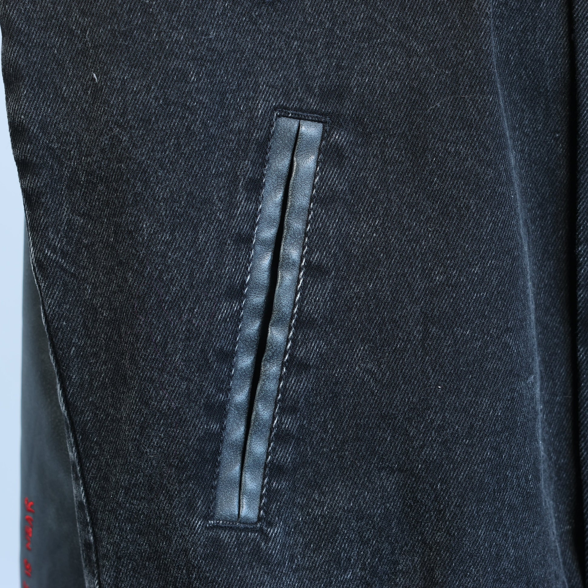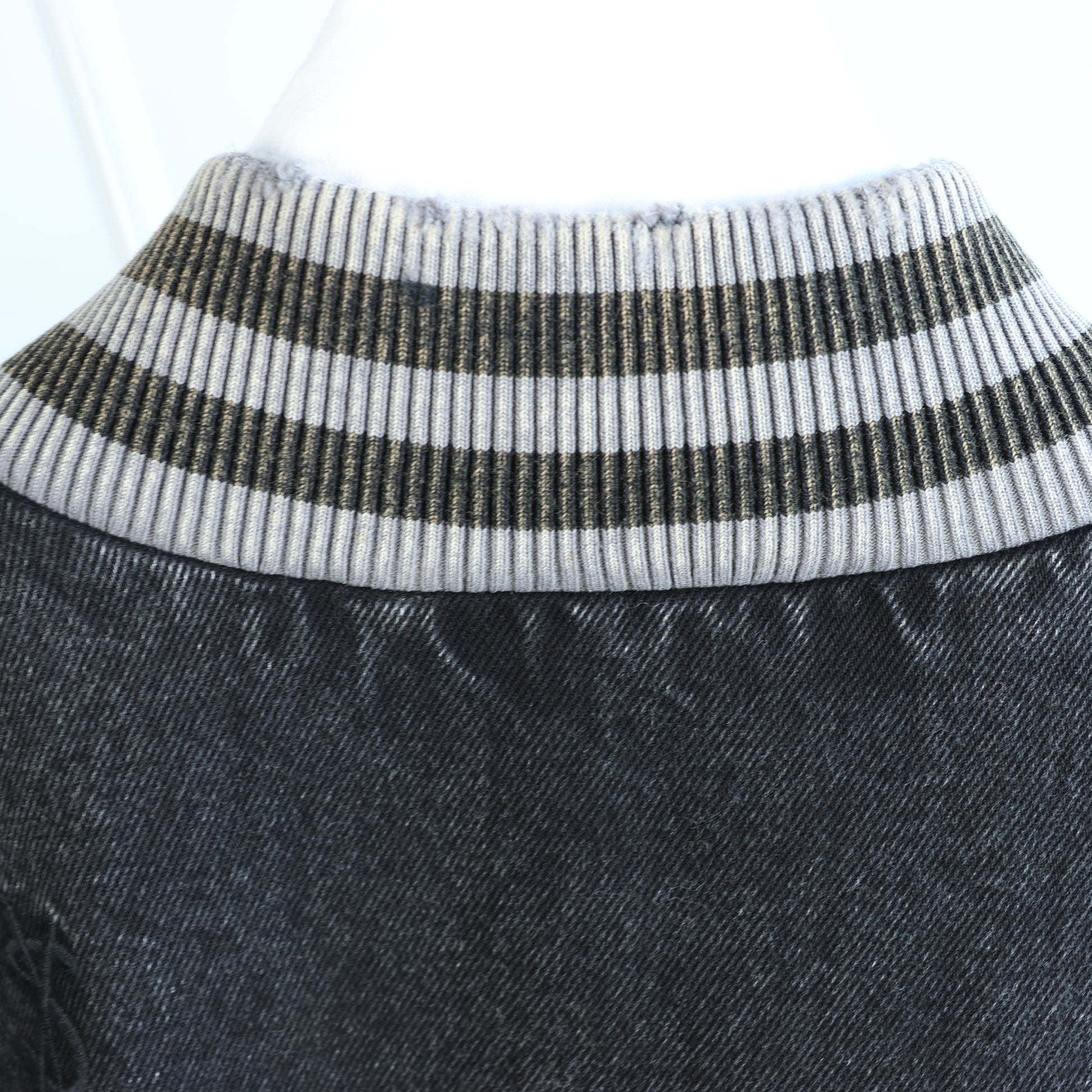 Ksubi Skribed King varsity jacket in black, size M. A statement piece with contrast grey sleeves, embroidered text details, and striped ribbed trims — the perfect fusion of rebellious streetwear and luxury craftsmanship.