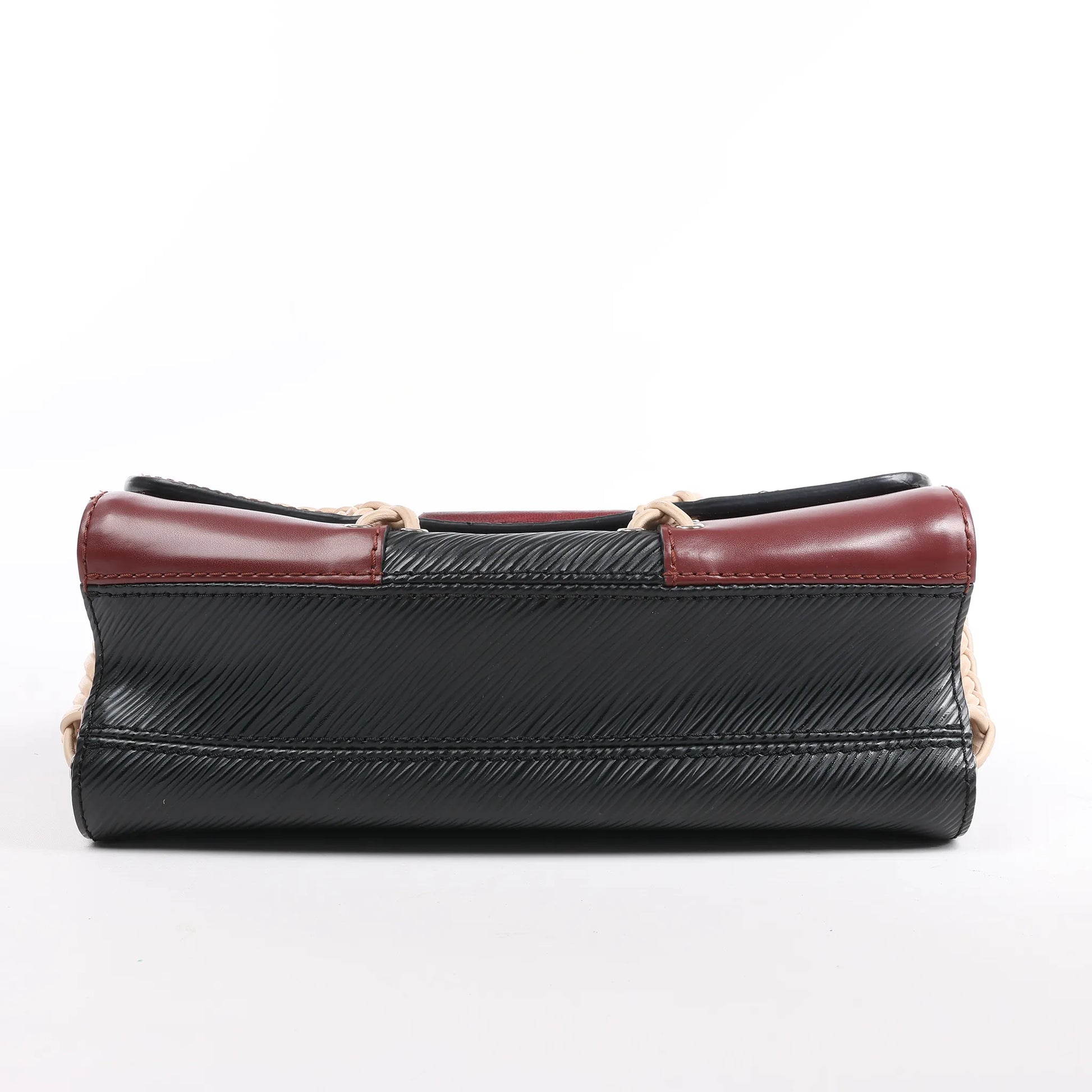 Affirmez votre style avec le sac bandoulière Louis Vuitton Twist MM en cuir Epi noir (modèle M42449). Doté d'un laçage bordeaux et beige unique, du fermoir Twist emblématique de LV et d'une bandoulière chaîne argentée, ce sac allie un savoir-faire avant-gardiste à un luxe intemporel.
