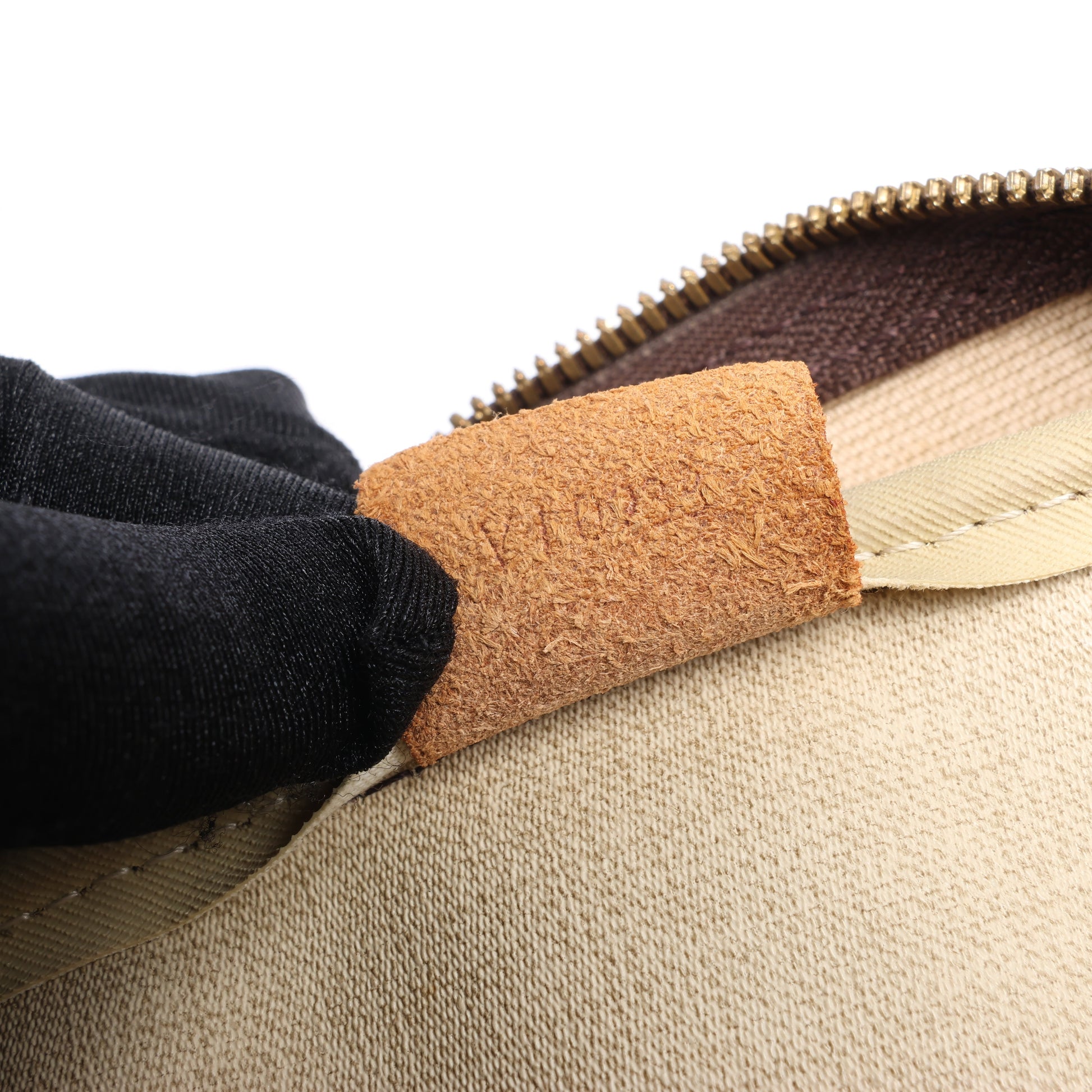 Détails de l'état : La toile extérieure est propre et belle. Le cuir de vachette présente une patine miel en parfait état, avec des taches d'eau et des frottements. Les poignées en cuir sont fermes et en excellent état, mais présentent de légères taches et un noircissement. La quincaillerie présente de fines rayures et un noircissement. L'intérieur est en bon état, mais présente quelques taches. Code date : VI0932