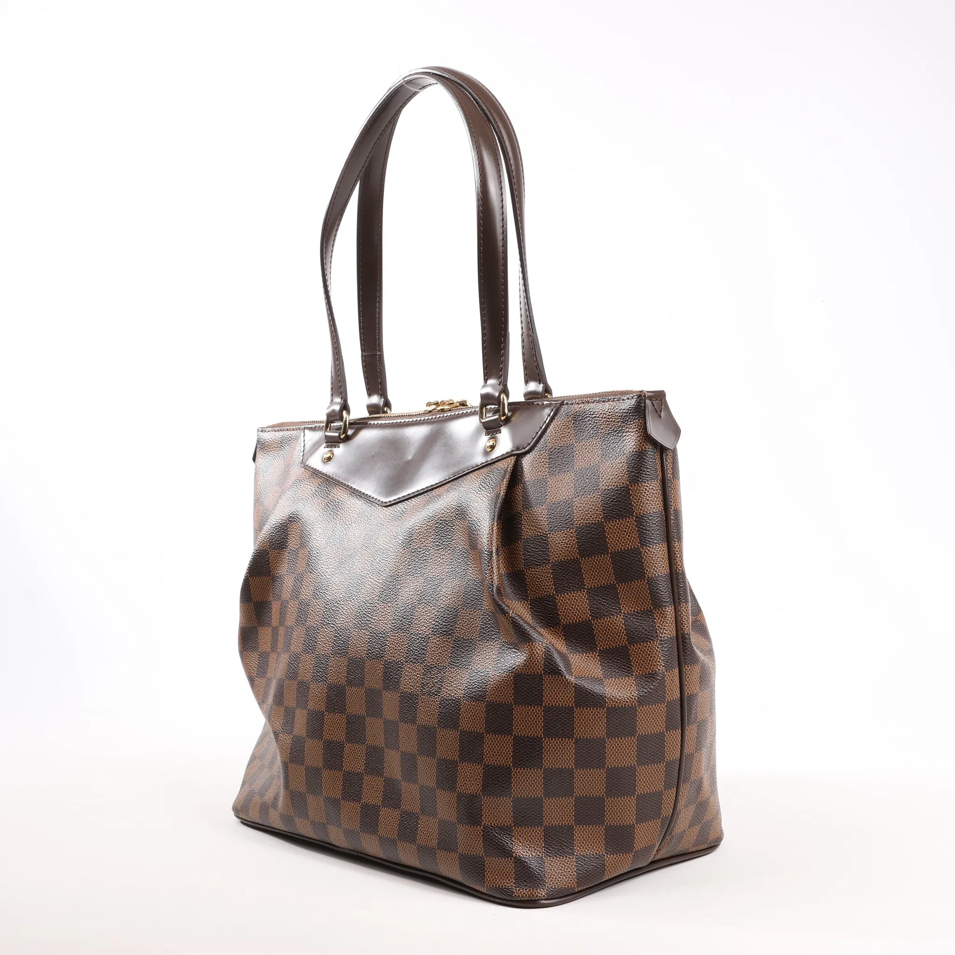 Le sac cabas Louis Vuitton Westminster GM N41103 en toile Damier Ébène est spacieux et élégant, confectionné en toile enduite résistante, avec des finitions en cuir et des côtés plissés – parfait pour un usage quotidien raffiné.