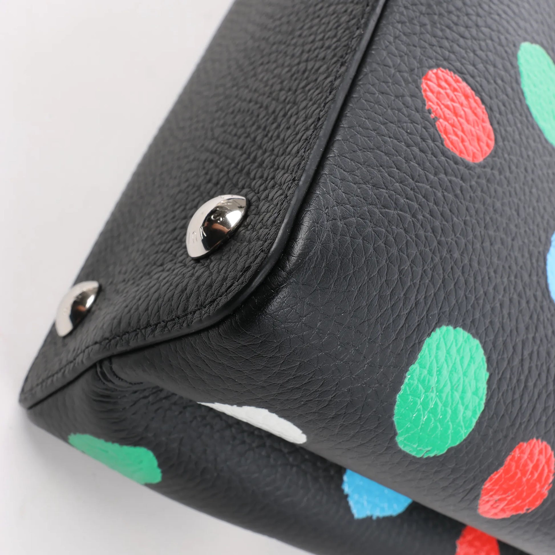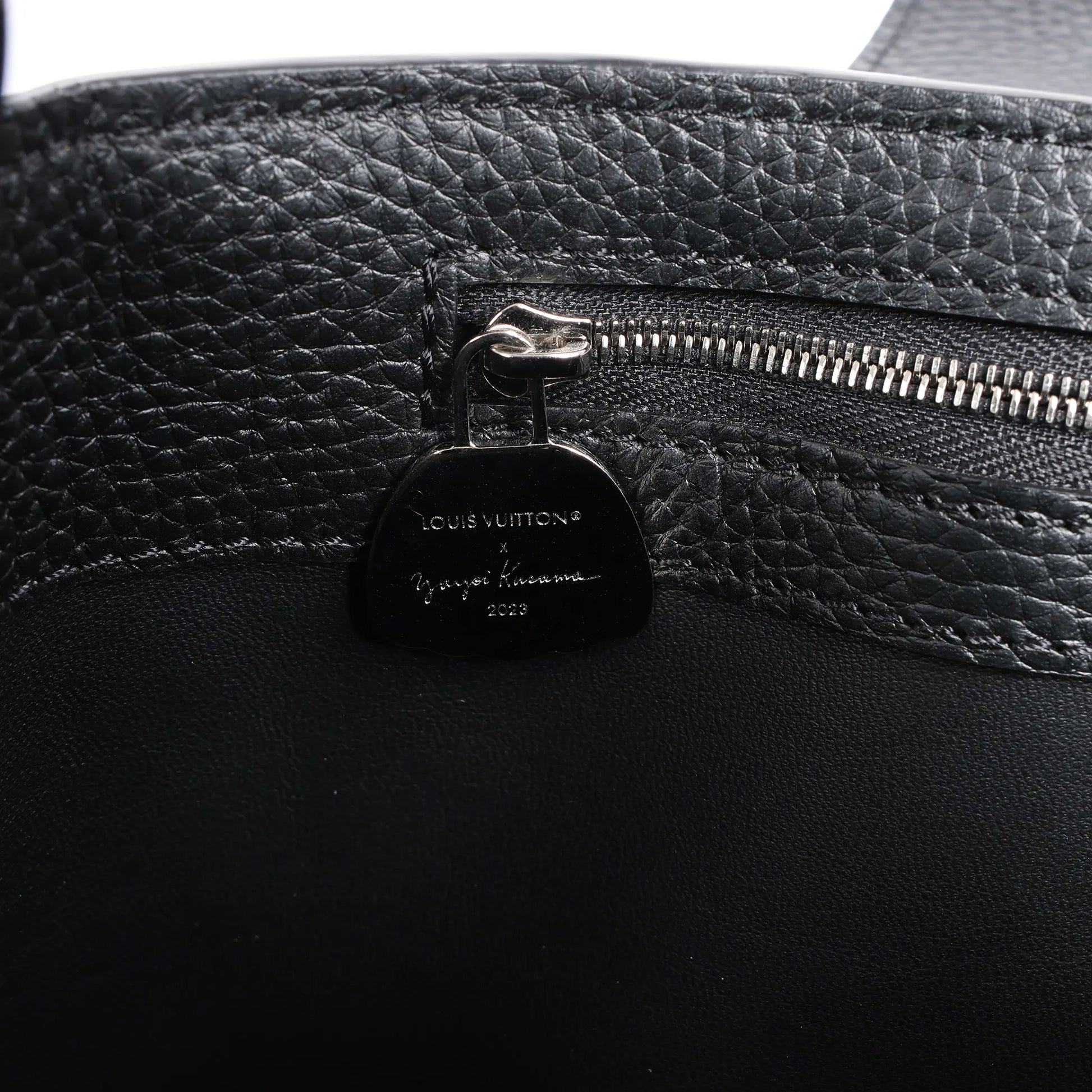 Sublimez votre collection avec le sac Louis Vuitton x Yayoi Kusama Capucines MM M21663. Confectionné en cuir Taurillon noir luxueux, ce sac à main 2 en 1 en édition limitée arbore des pois éclatants inspirés de l'art emblématique de Kusama, fusionnant harmonieusement mode et beaux-arts.
