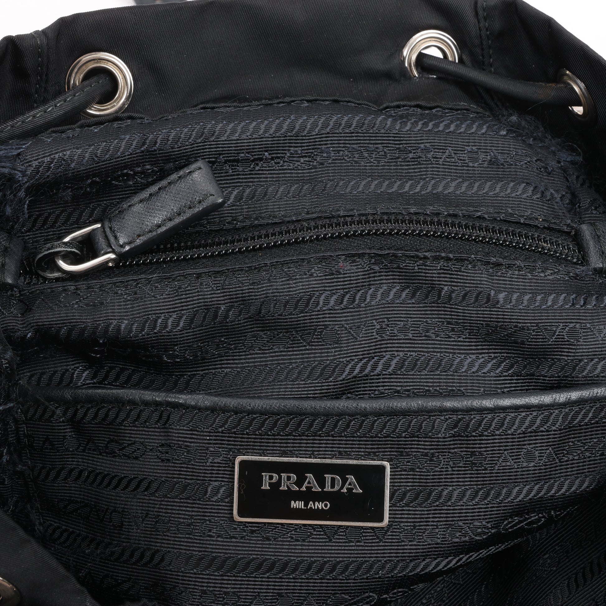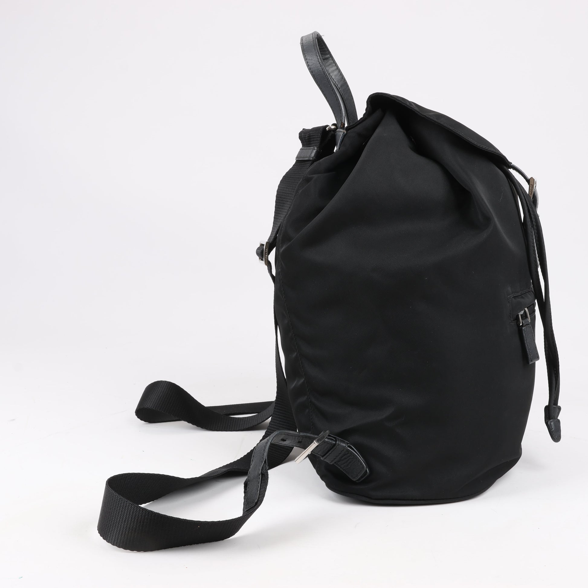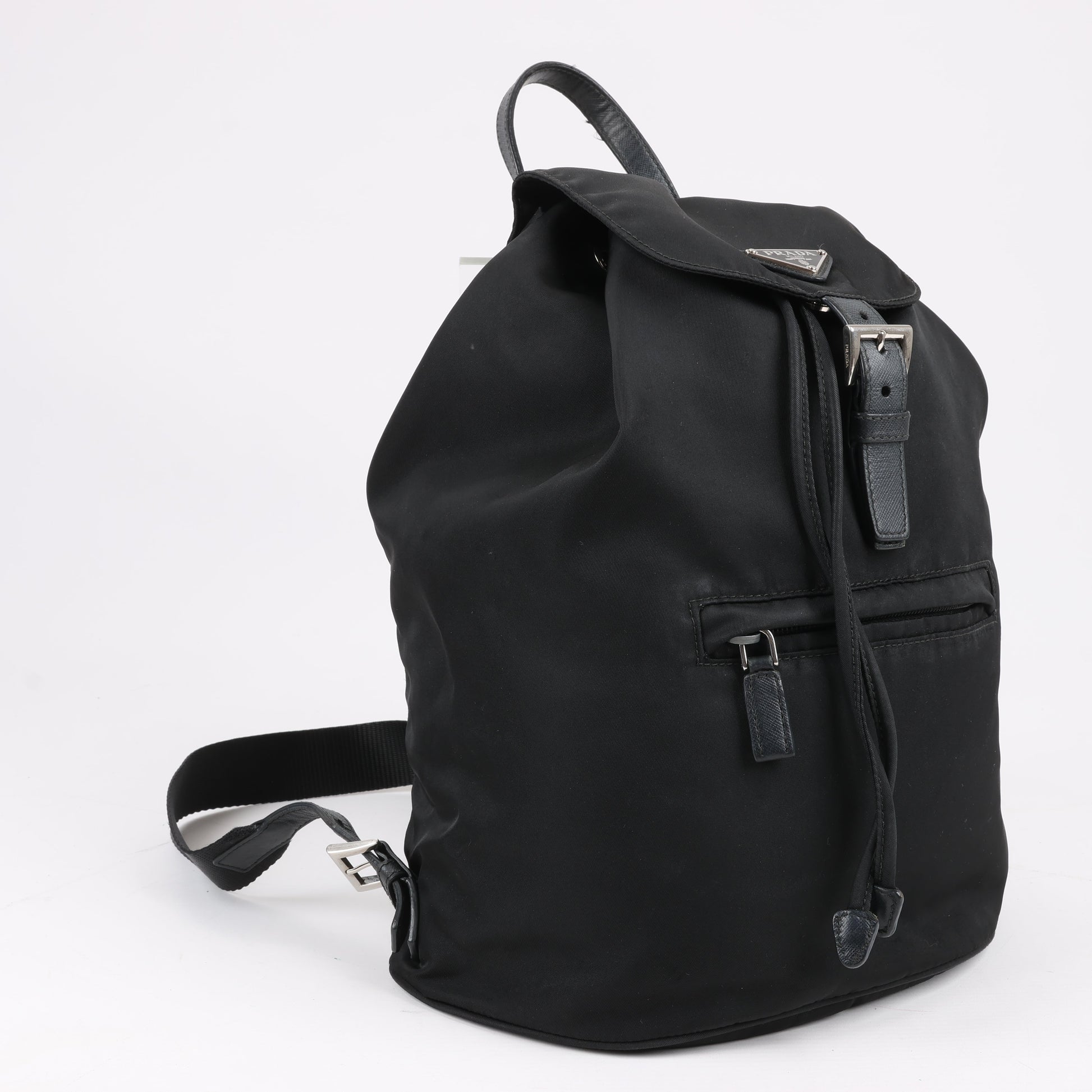 Le sac à dos Prada Tessuto en tissu et cuir noir allie à la perfection luxe et fonctionnalité. Confectionné en nylon résistant avec des finitions en cuir, il est doté d'une fermeture à cordon, d'un rabat à boucle et du logo triangulaire emblématique. Un accessoire élégant et indispensable pour vos aventures quotidiennes.