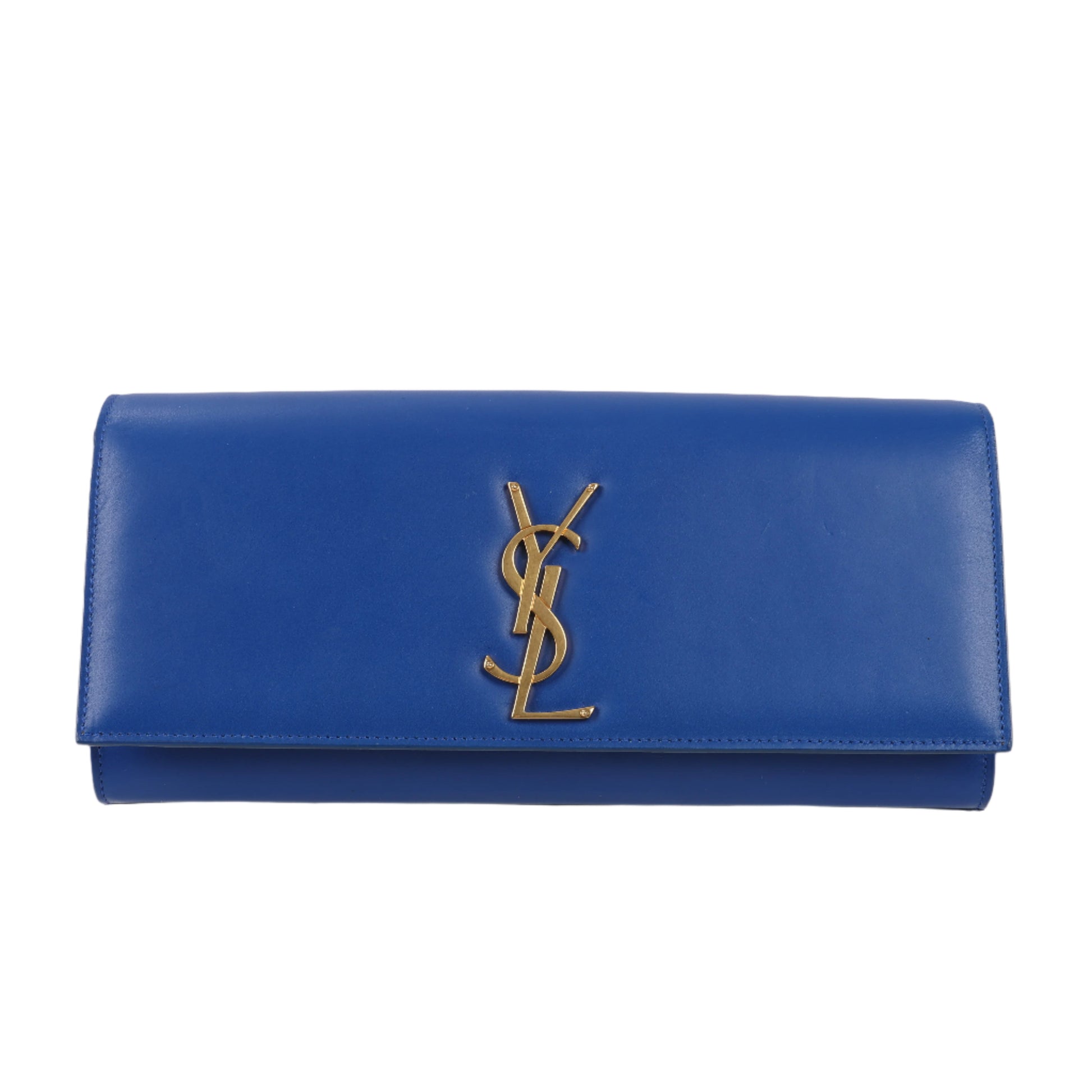 Sublimez votre tenue avec la pochette Kate de Saint Laurent, couleur Bleu Majorelle éclatante. Confectionnée en cuir lisse, elle arbore le monogramme YSL iconique doré et une silhouette épurée. Idéale pour rehausser vos tenues de soirée d'une sophistication intemporelle.