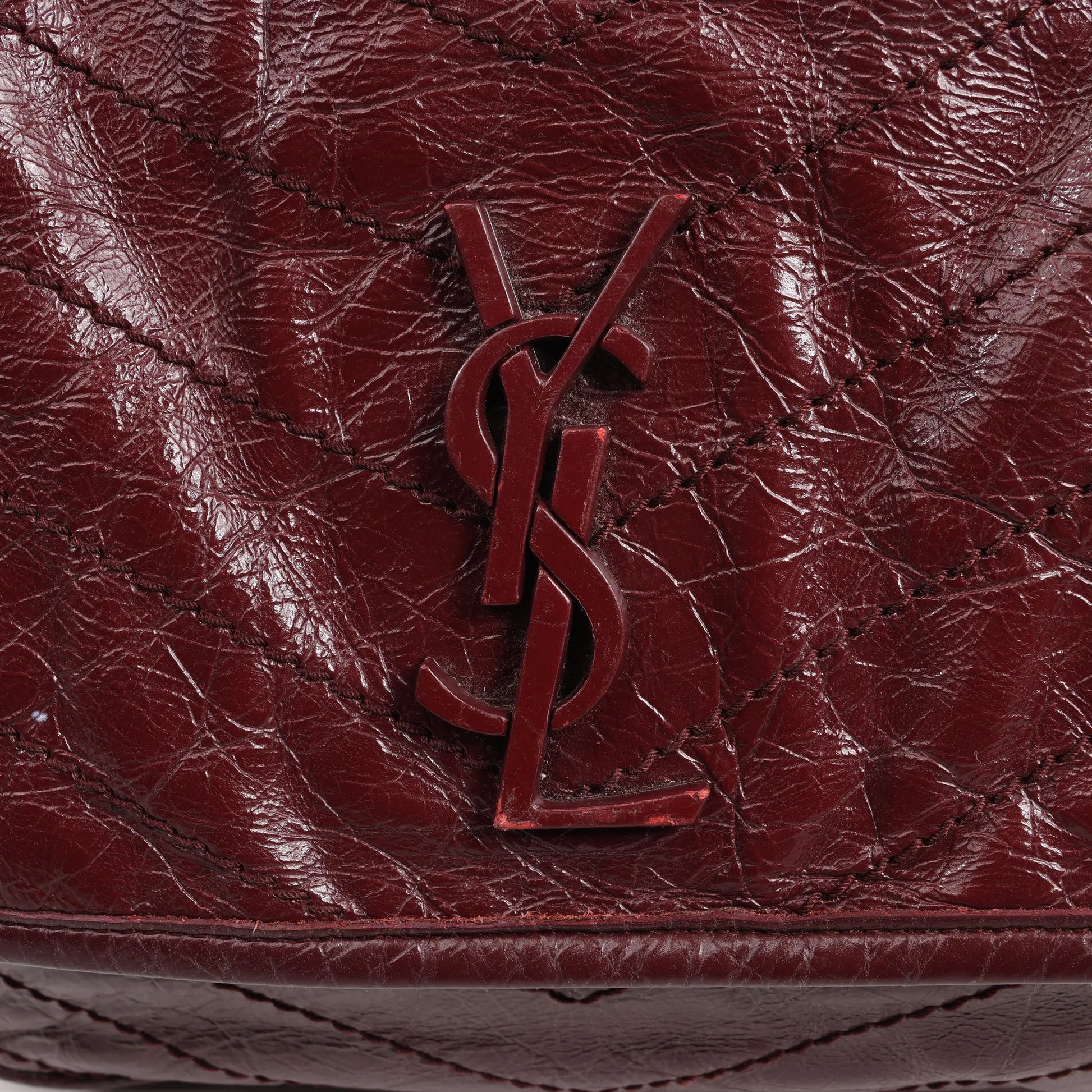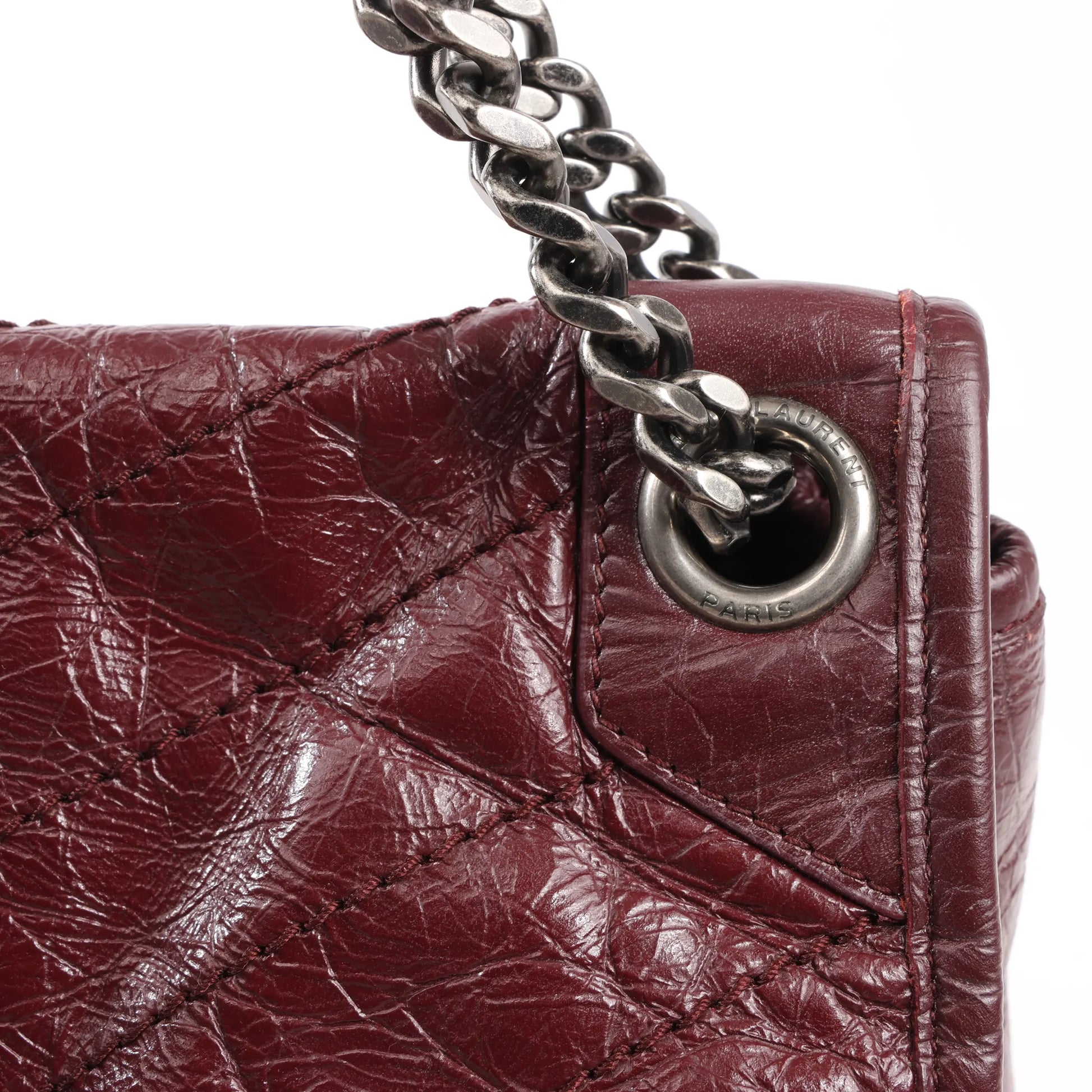 Le sac à chaîne Niki de Saint Laurent Paris en cuir froissé bordeaux (498894) allie élégance et audace grâce à ses finitions ton sur ton YSL et son matelassage à chevrons. Conçu pour le jour comme pour le soir, il est doté d'une bandoulière chaîne coulissante permettant un porté épaule ou croisé.