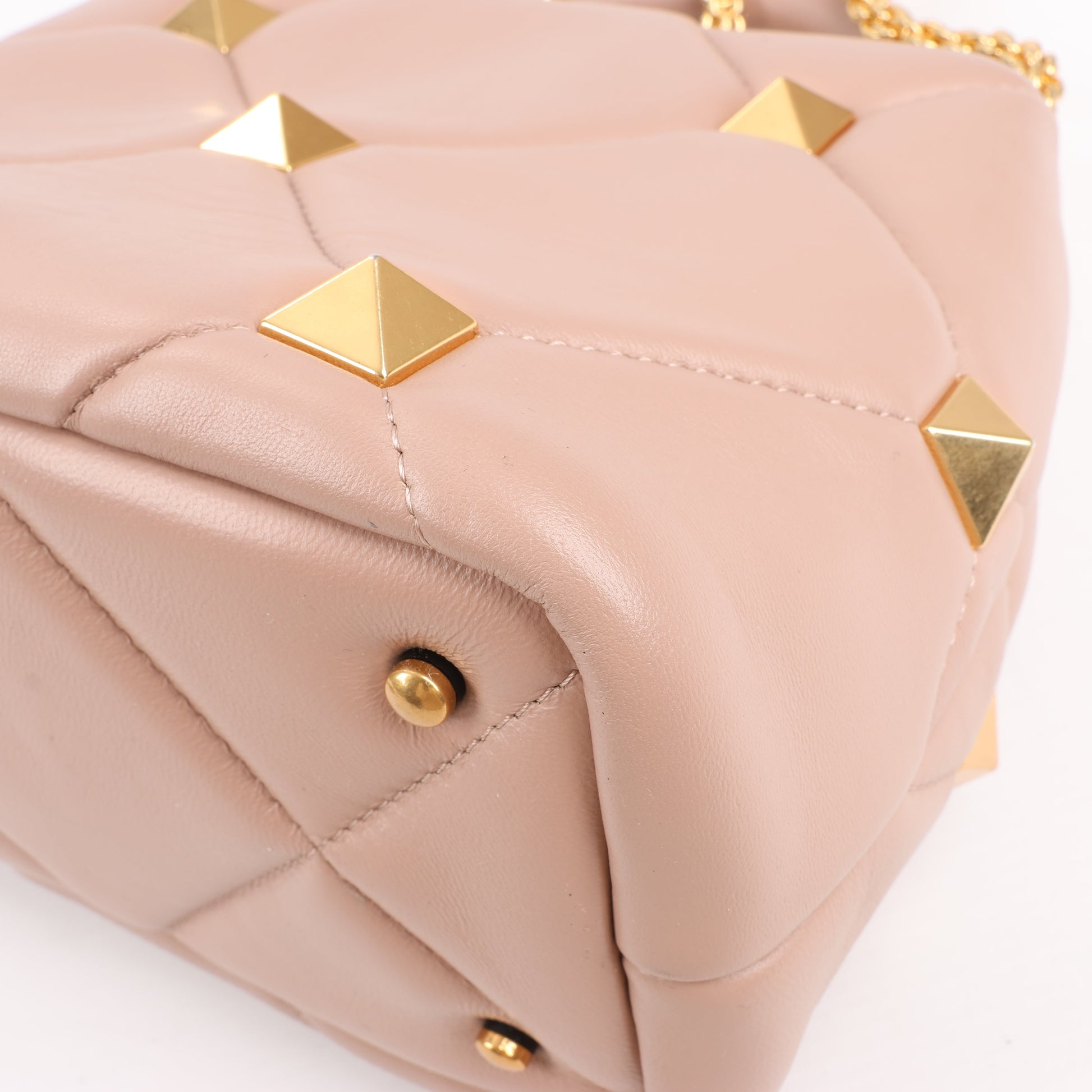 Affirmez votre sophistication avec ce sac bandoulière en cuir Valentino Garavani Roman Studs beige poudré. Confectionné en cuir matelassé luxueux, il est orné de clous dorés surdimensionnés, d'une élégante anse chaîne et d'un design polyvalent à trois compartiments. Une pièce à la fois audacieuse et élégante !