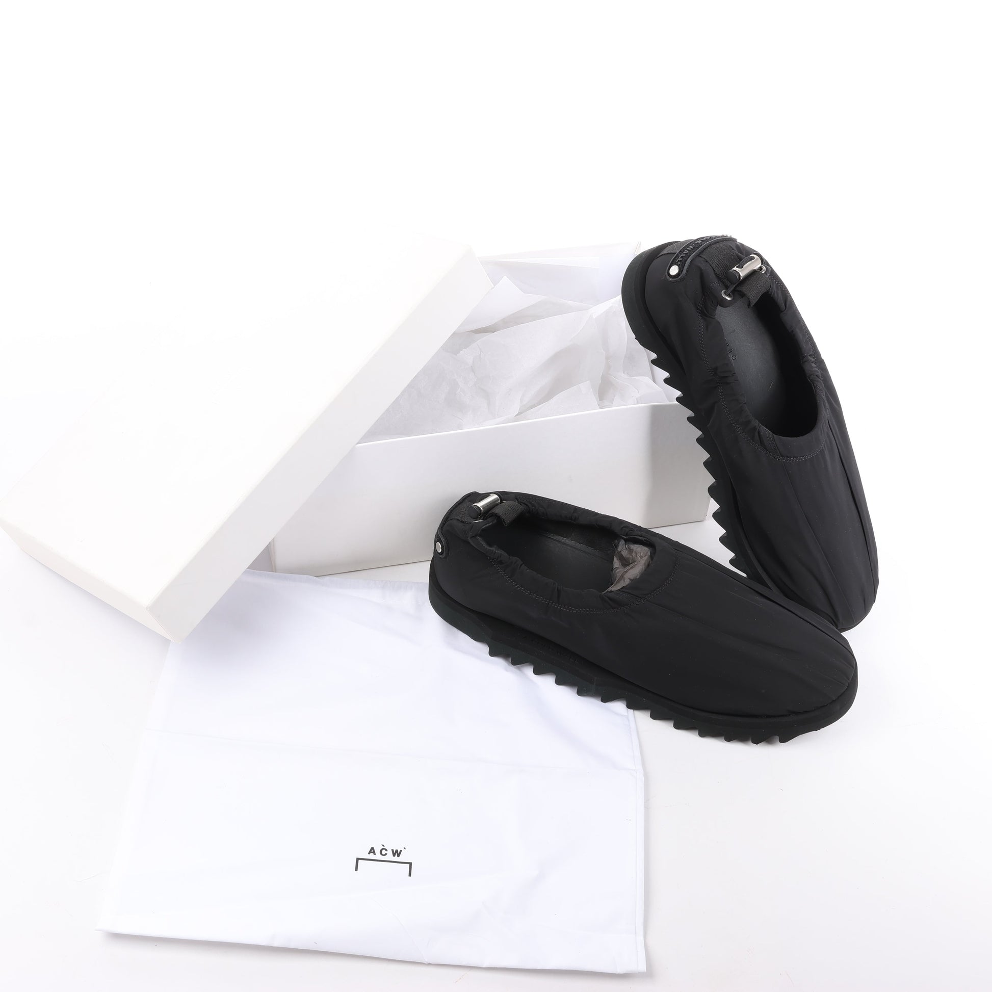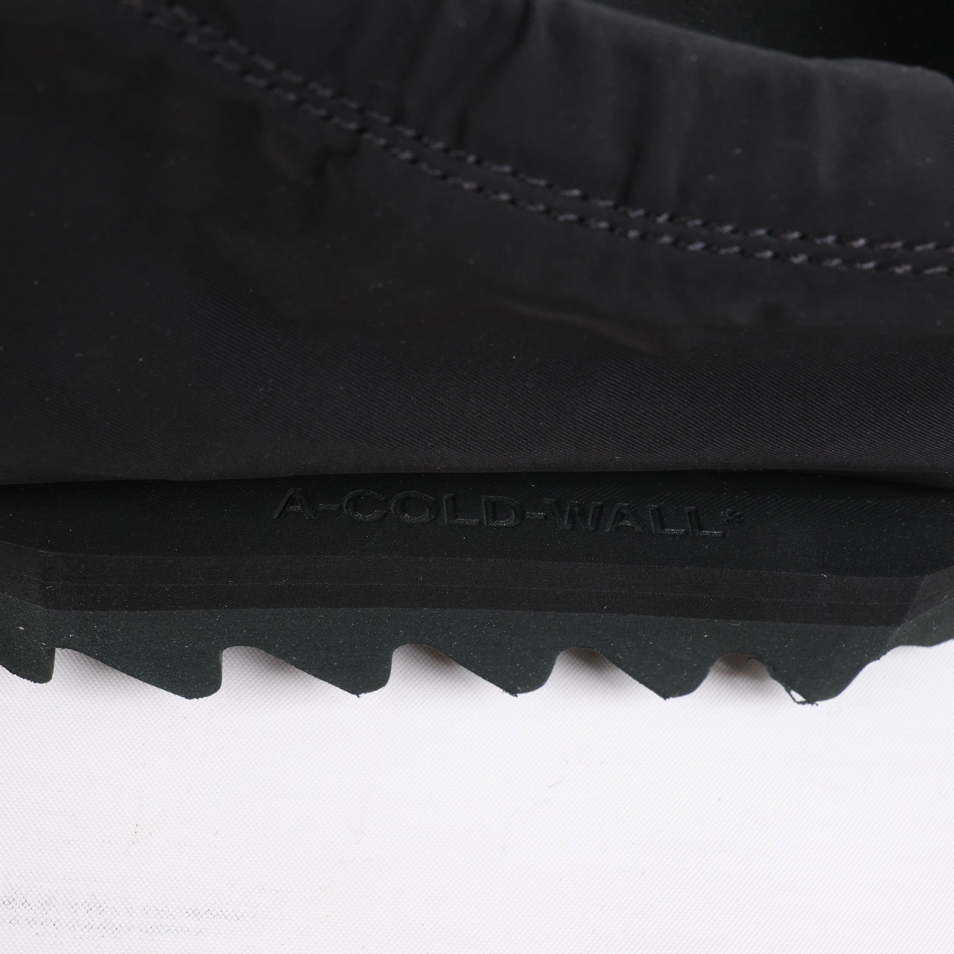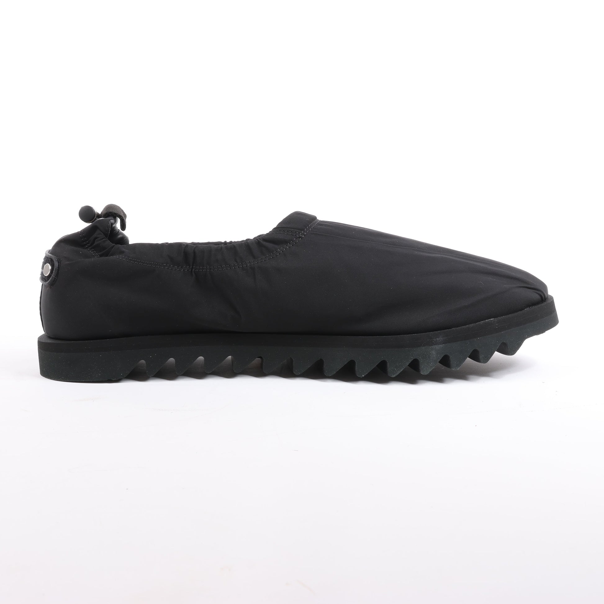 A-COLD-WALL\* drawstring slip-on sneakers in black blend utilitarian design with avant-garde edge. Featuring a padded upper and rugged serrated sole, these size 45 EU shoes offer bold, modern streetwear appeal with effortless comfort.