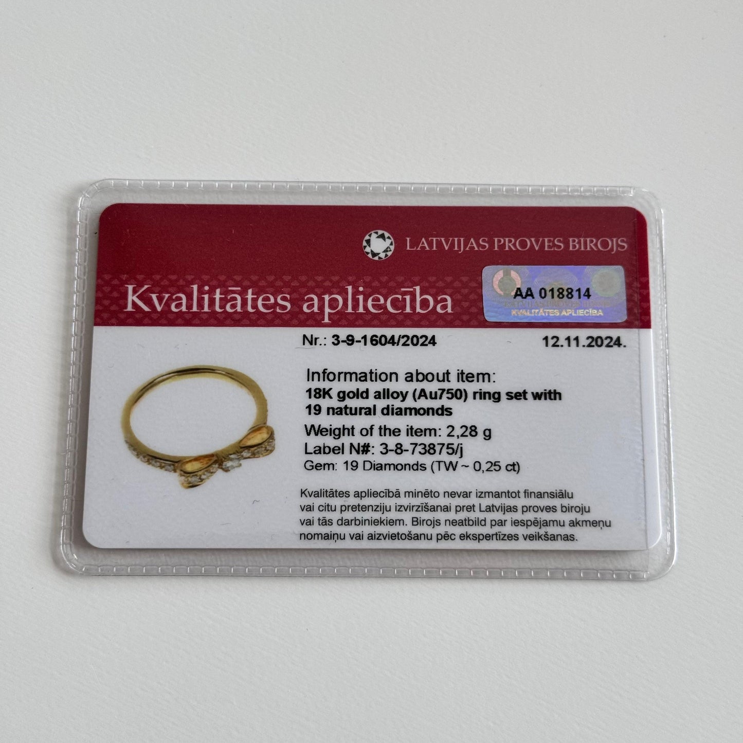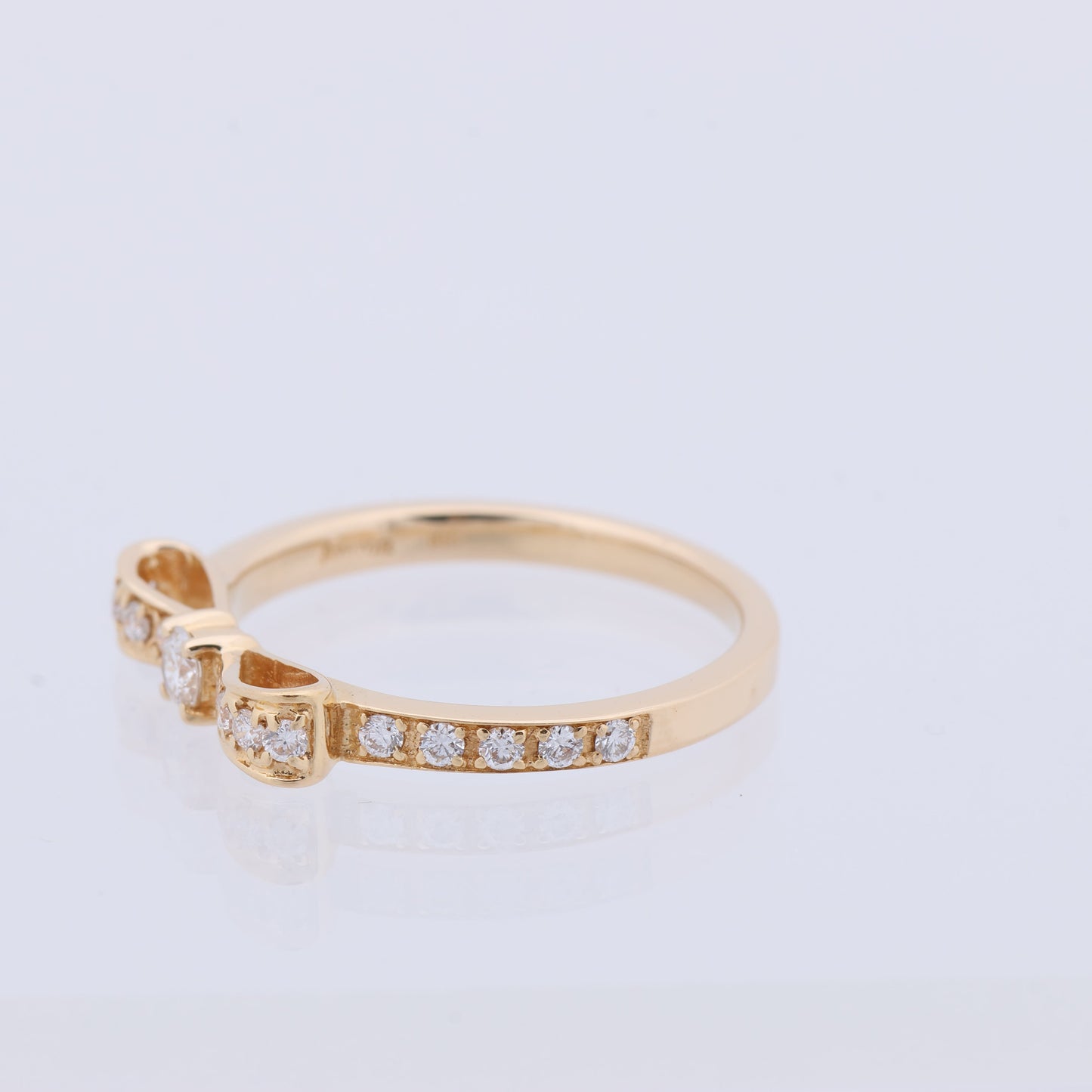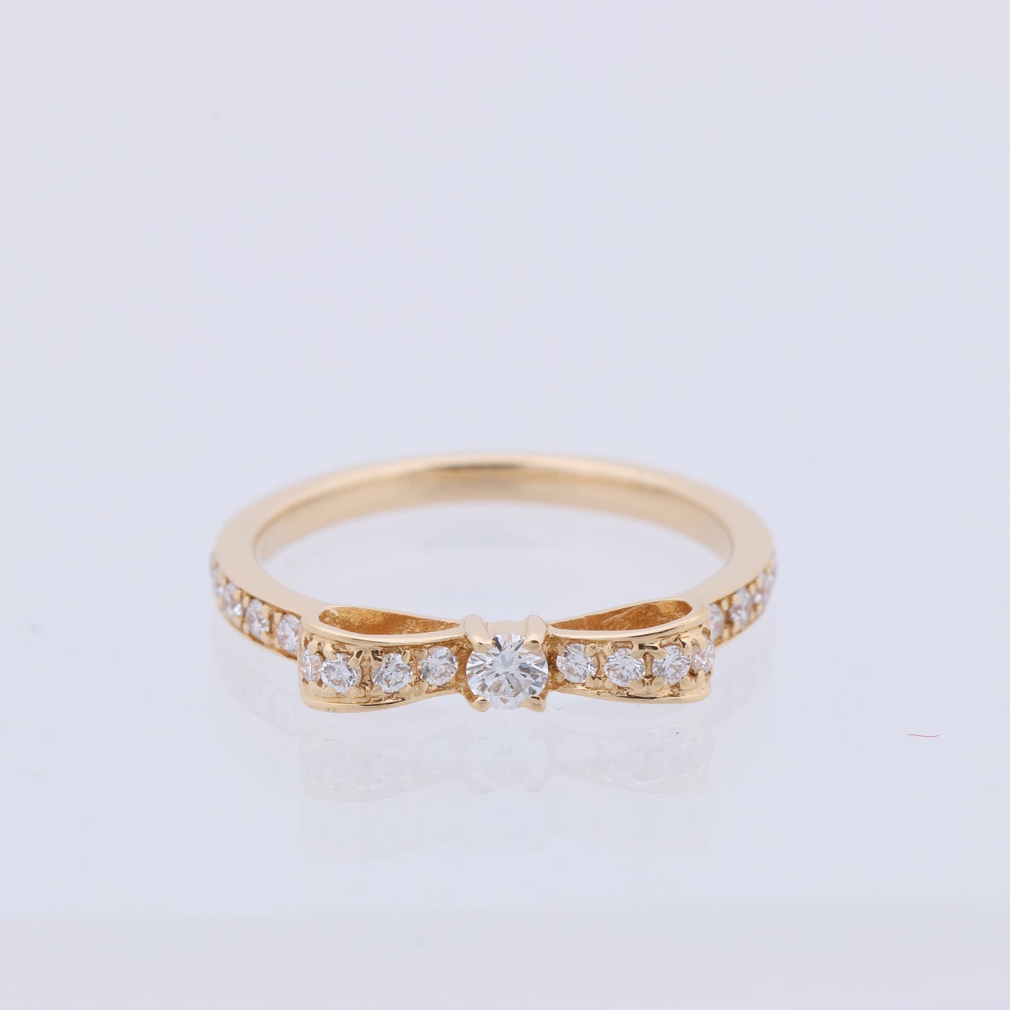 Elegant AVALONE 18K yellow gold ring adorned with a dainty bow design set with 19 natural diamonds, totaling approximately 0.25 ct. With a total weight of 2.2g, this piece beautifully combines sophistication and sparkle, ideal for any occasion.