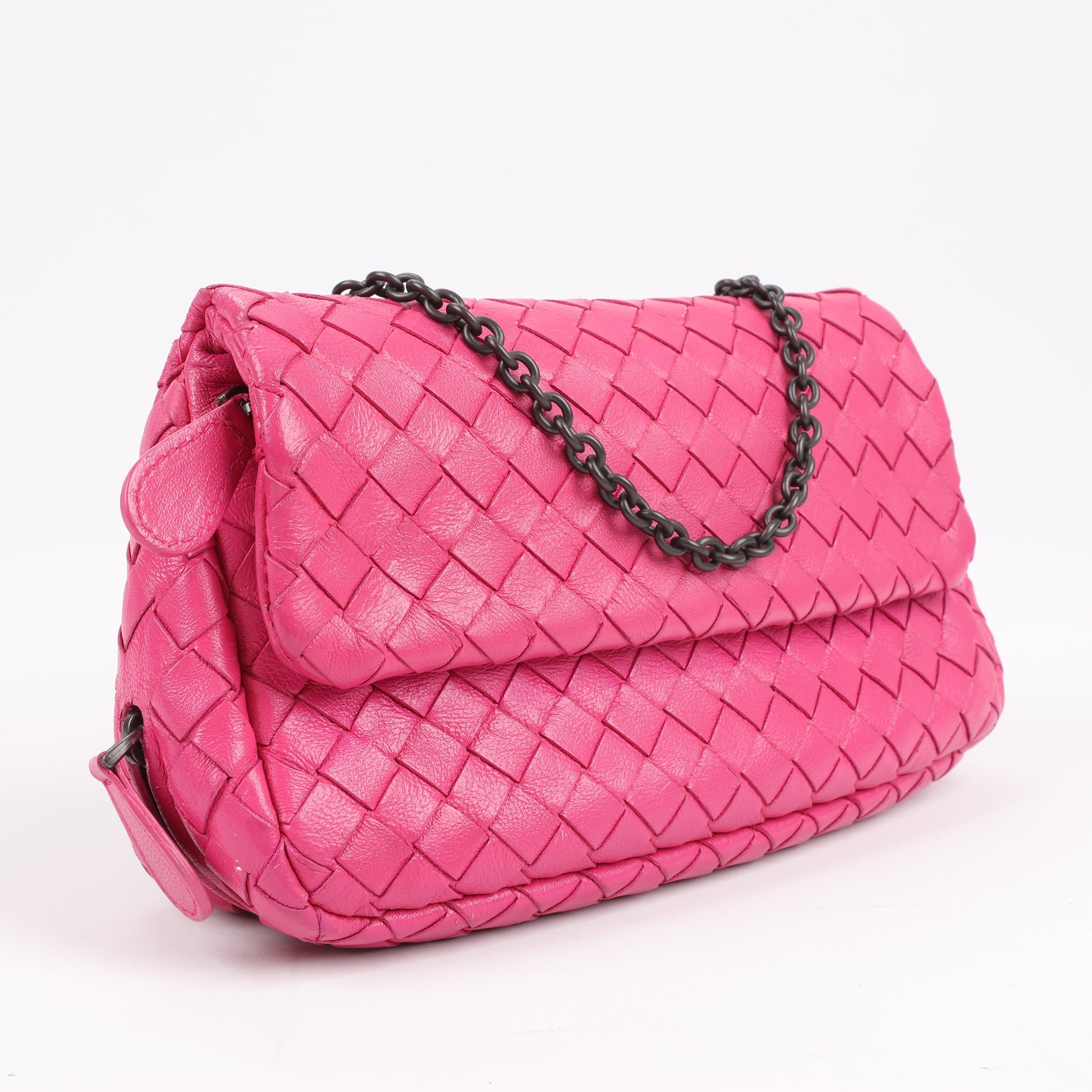 Elegant and timeless, this Bottega Veneta Intrecciato leather chain shoulder bag in hot pink showcases the brand’s signature handwoven craftsmanship. Featuring a soft silhouette, a flap closure, and a dark-tone chain strap, it’s the perfect blend of sophistication and modern charm.