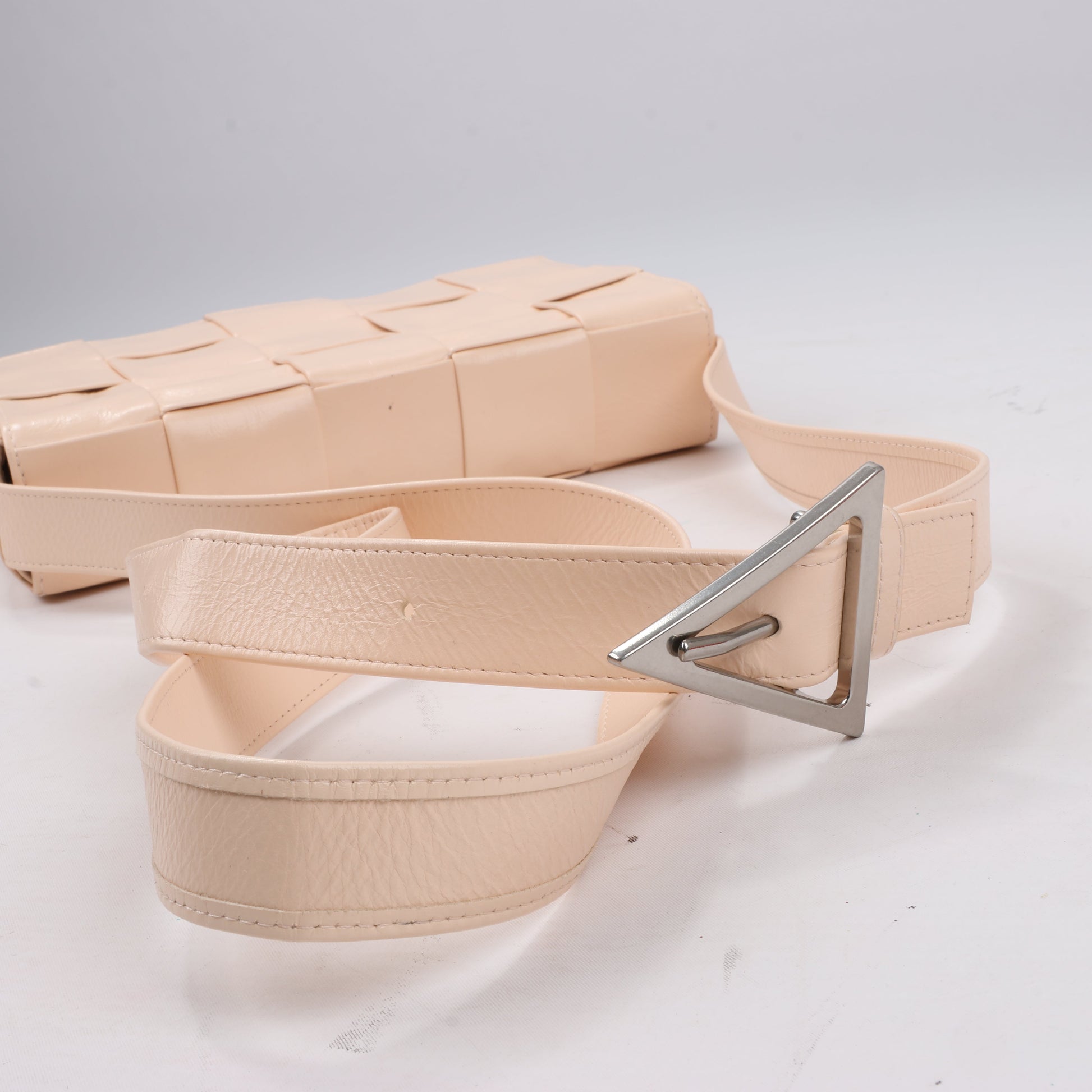 The Bottega Veneta Maxi Intrecciato Cassette Leather Shoulder Bag in Powder Beige with pink and beige tone features the iconic oversized woven leather design, bold color, and an adjustable strap. A striking and contemporary piece, it offers a fresh take on the brand's signature craftsmanship.