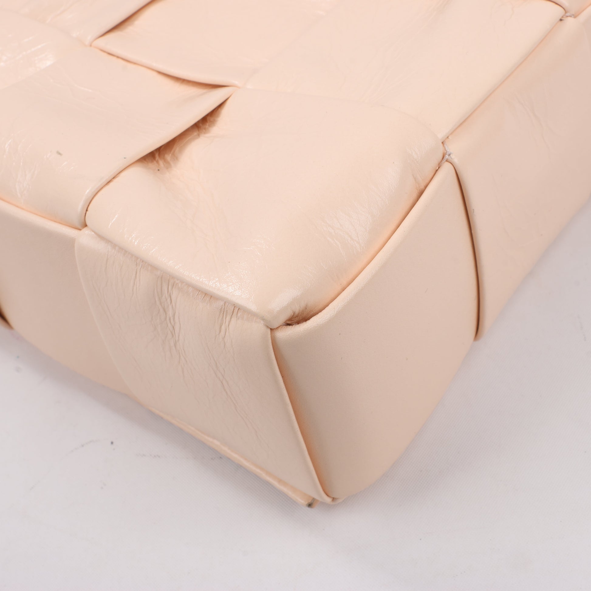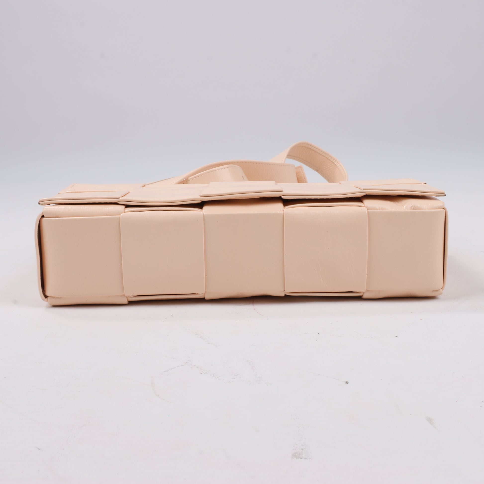 The Bottega Veneta Maxi Intrecciato Cassette Leather Shoulder Bag in Powder Beige with pink and beige tone features the iconic oversized woven leather design, bold color, and an adjustable strap. A striking and contemporary piece, it offers a fresh take on the brand's signature craftsmanship.
