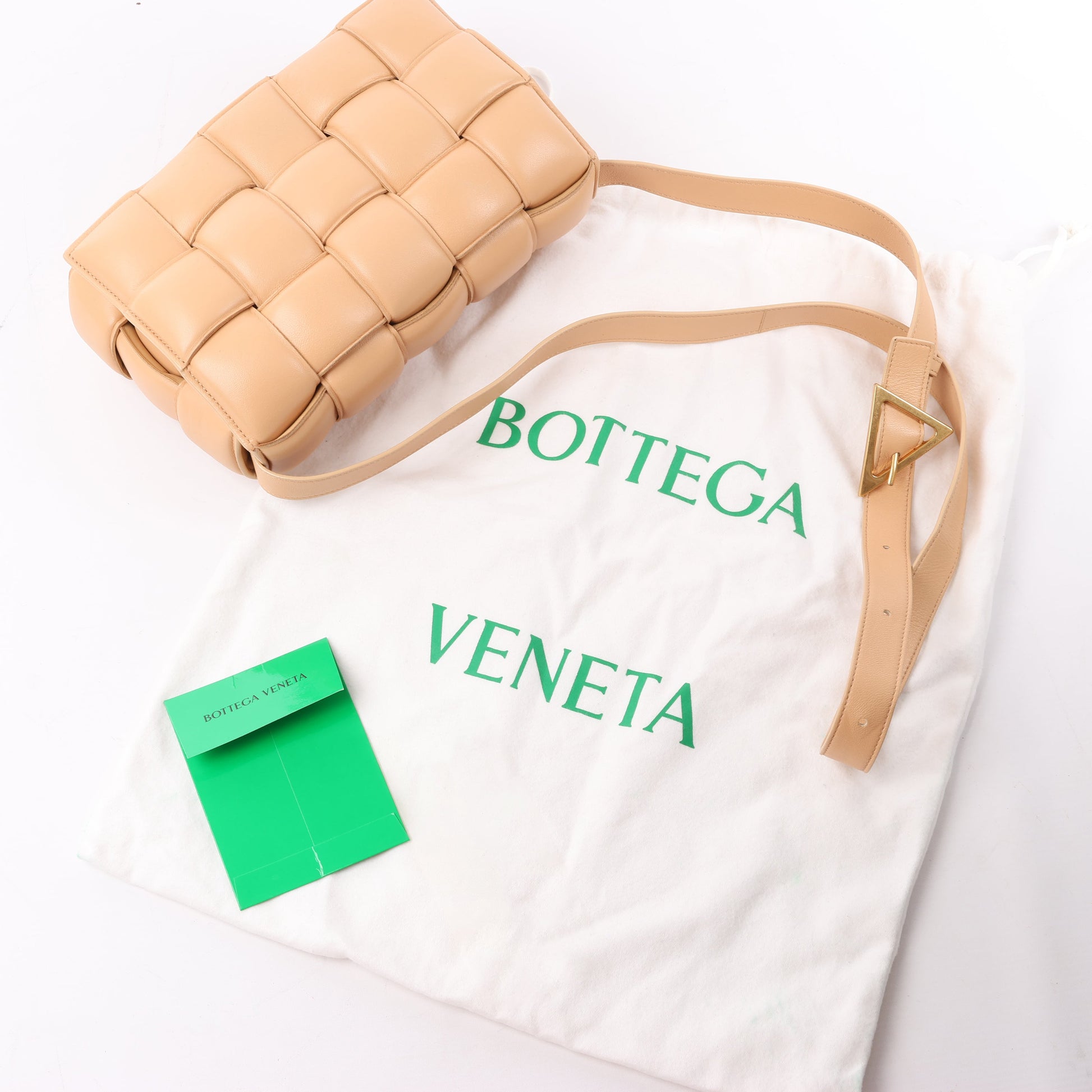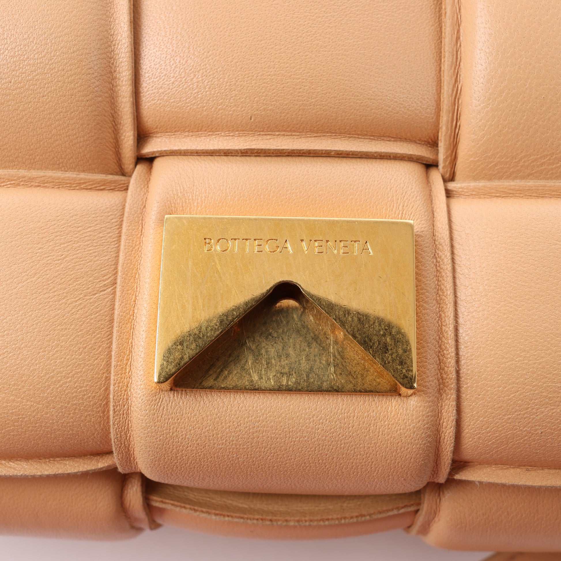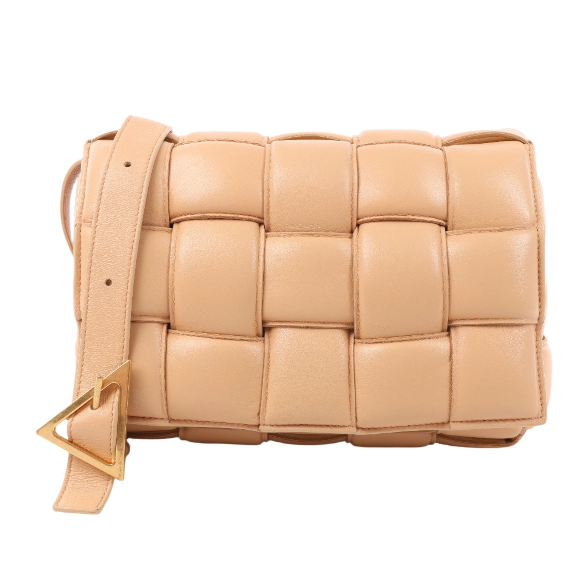 Bottega Veneta Padded Cassette bag in beige leather with signature maxi Intrecciato weave and gold-tone triangle buckle. A plush, sculptural icon that fuses bold design with everyday luxury.