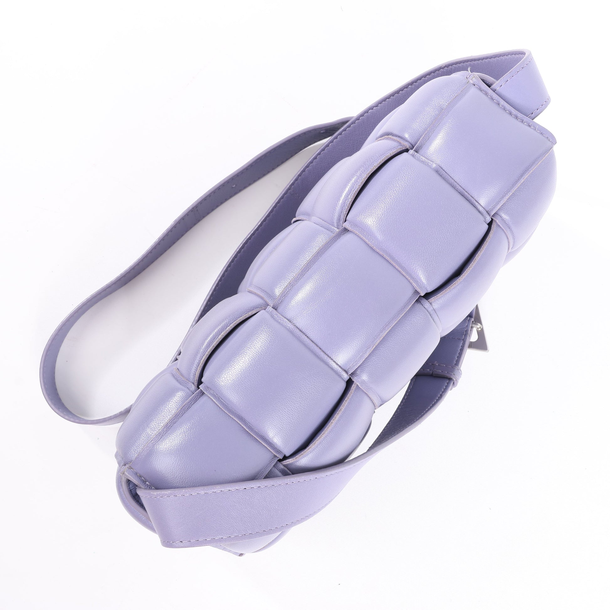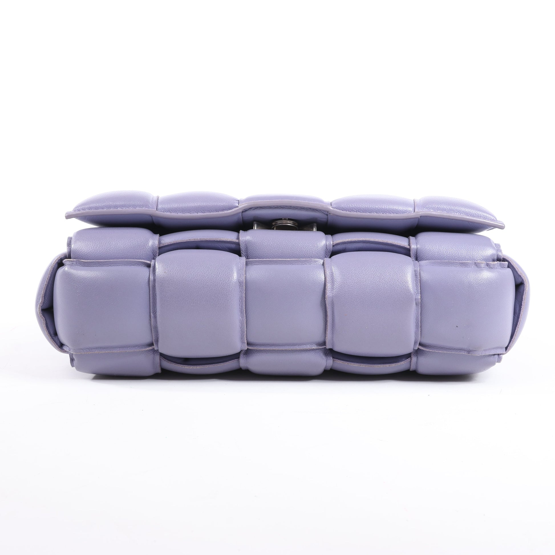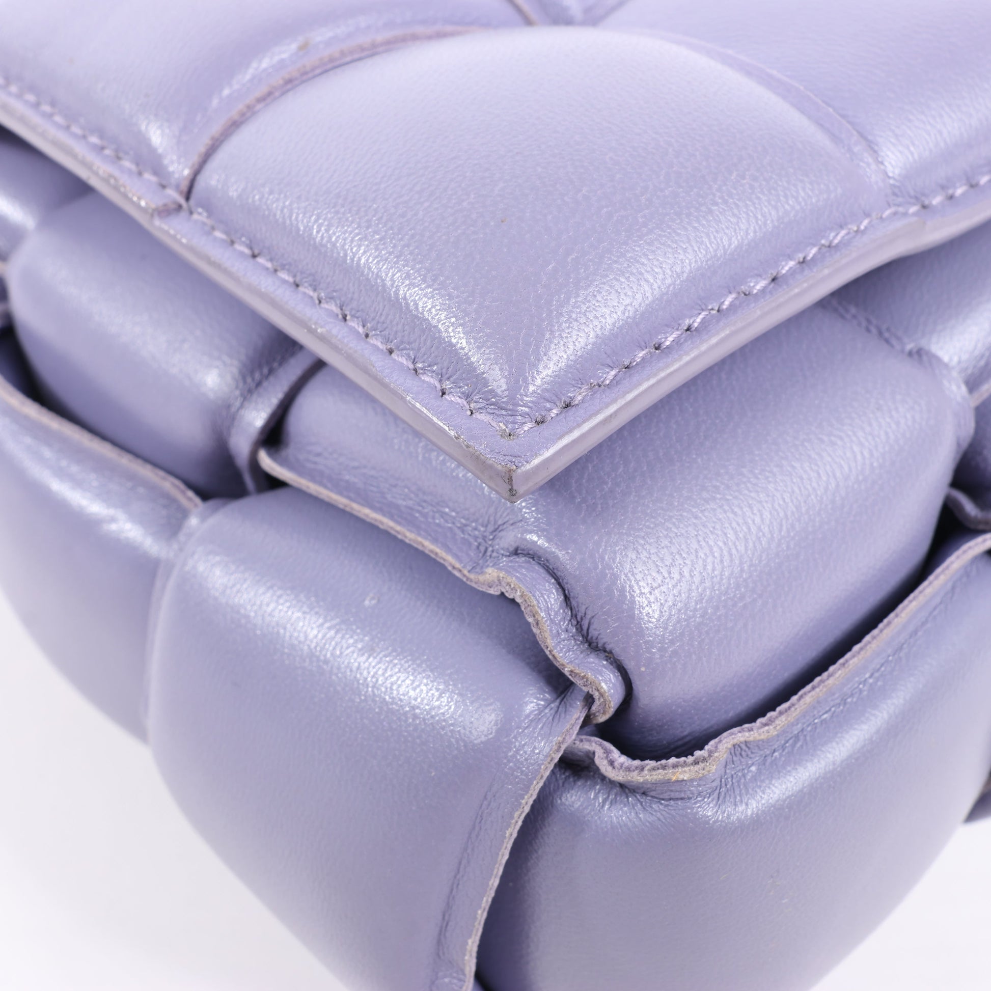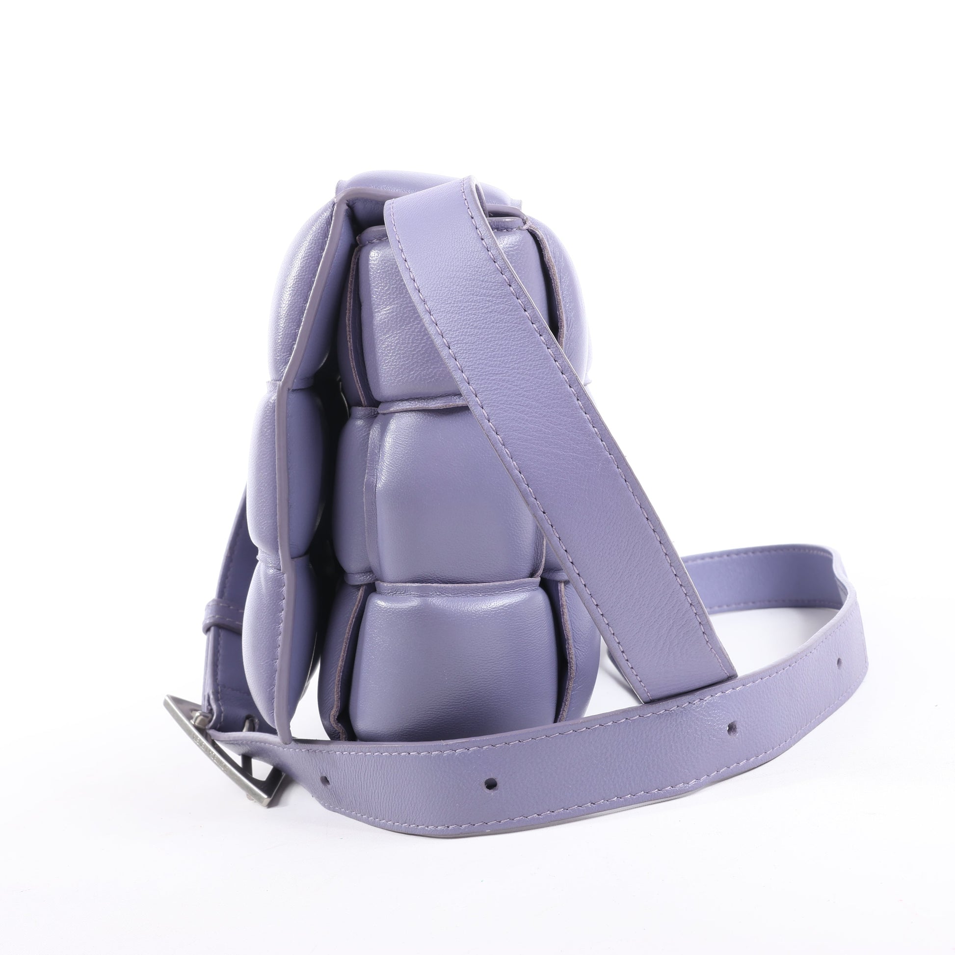 Bottega Veneta Padded Cassette Shoulder Bag in purple maxi Intrecciato leather. Bold and plush with geometric weave and signature triangle buckle—an ultra-modern icon of elevated style.