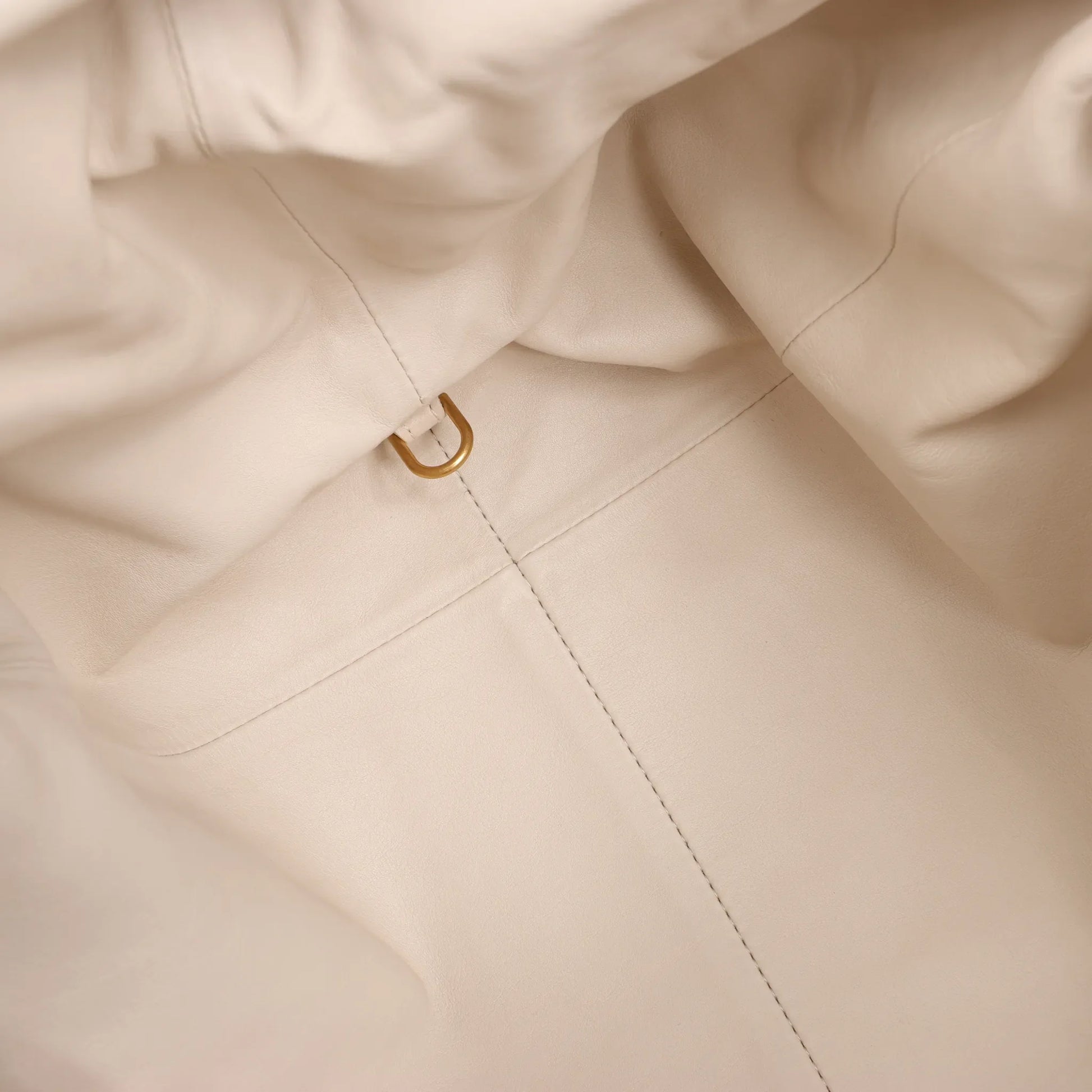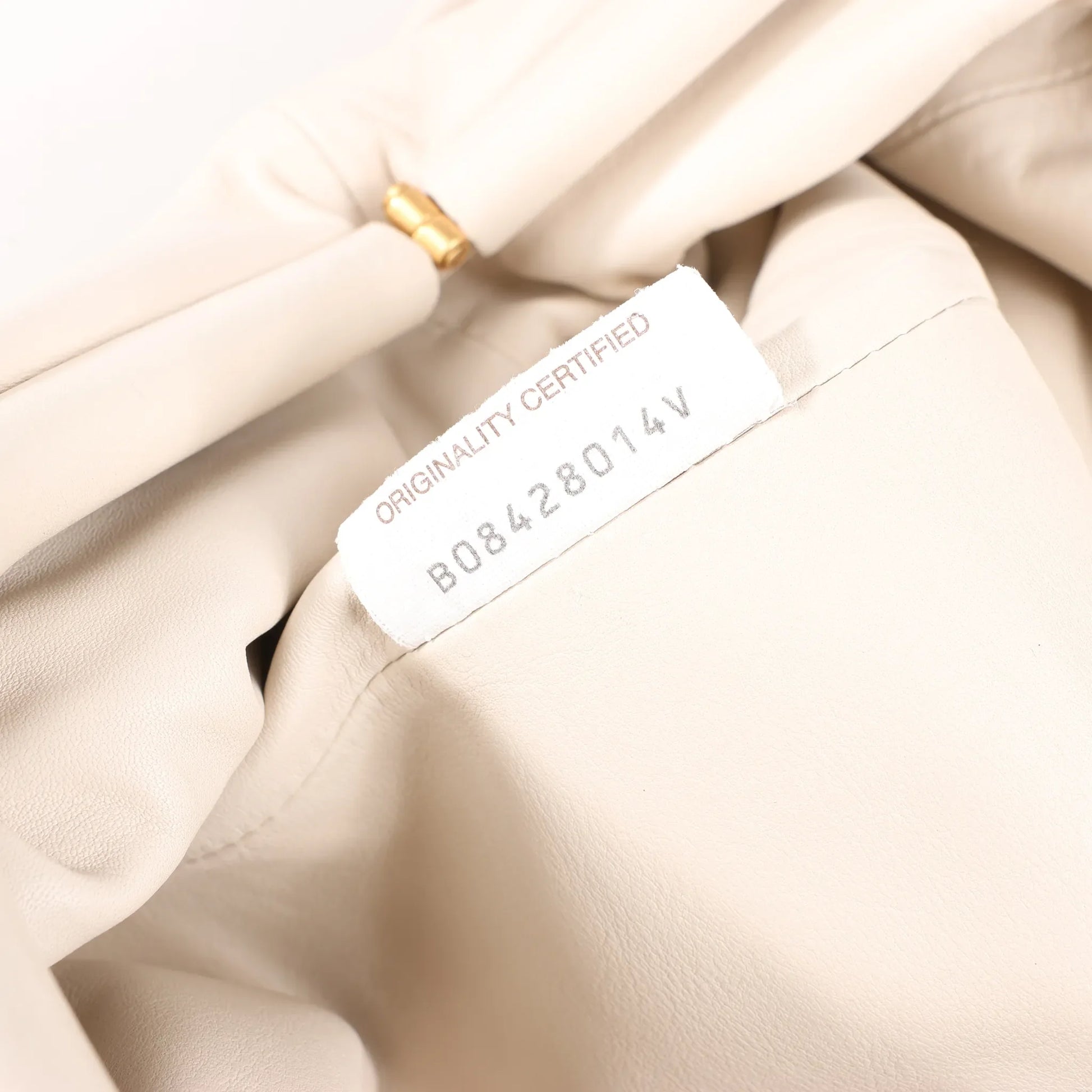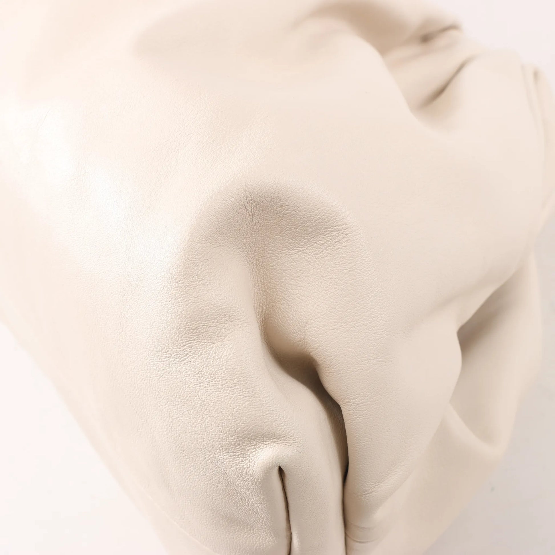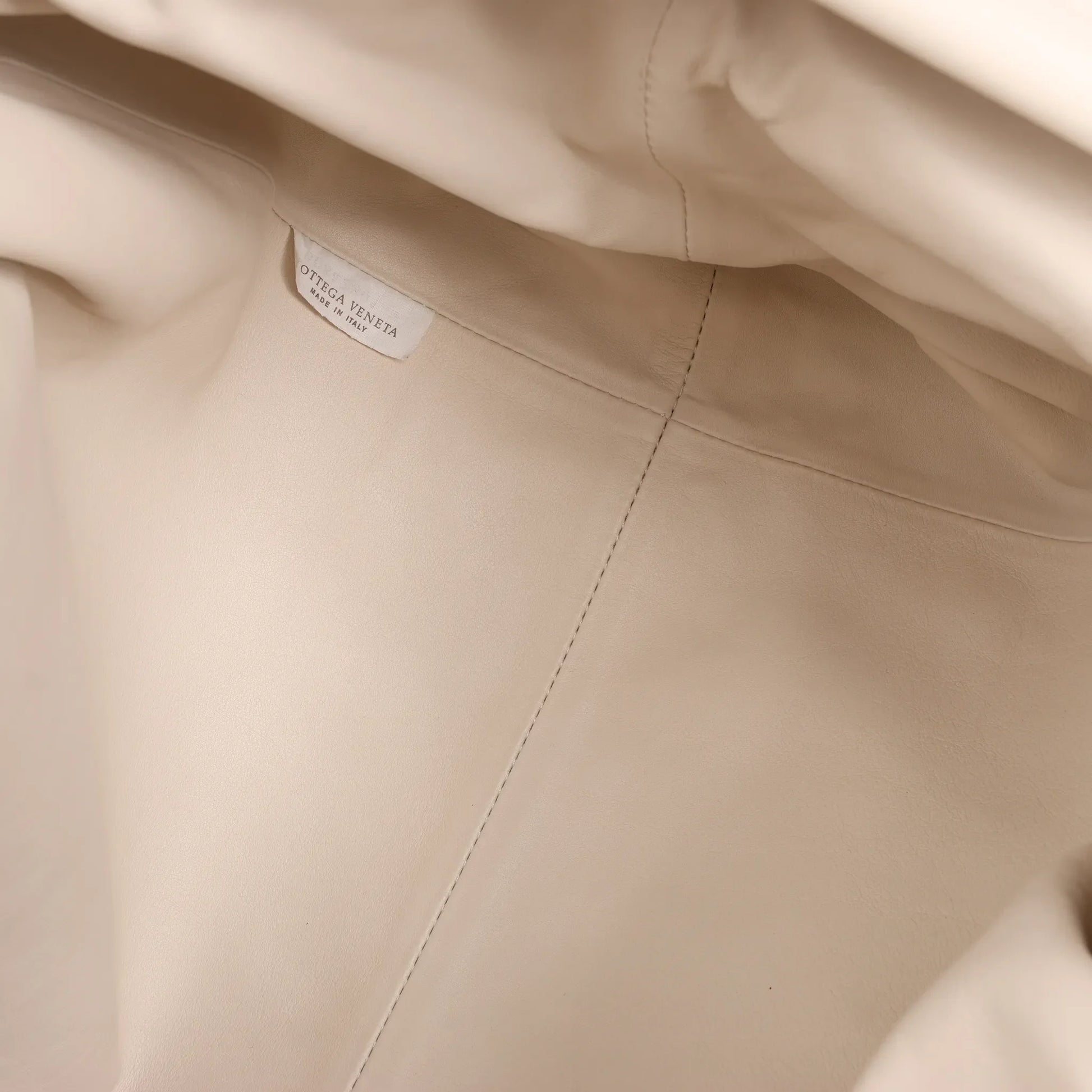 The Bottega Veneta The Pouch in oversized beige leather is the epitome of minimalist luxury. Made in Italy from soft, supple calfskin, this clutch delivers a bold silhouette with seamless folds and gathered detailing for high-fashion impact.