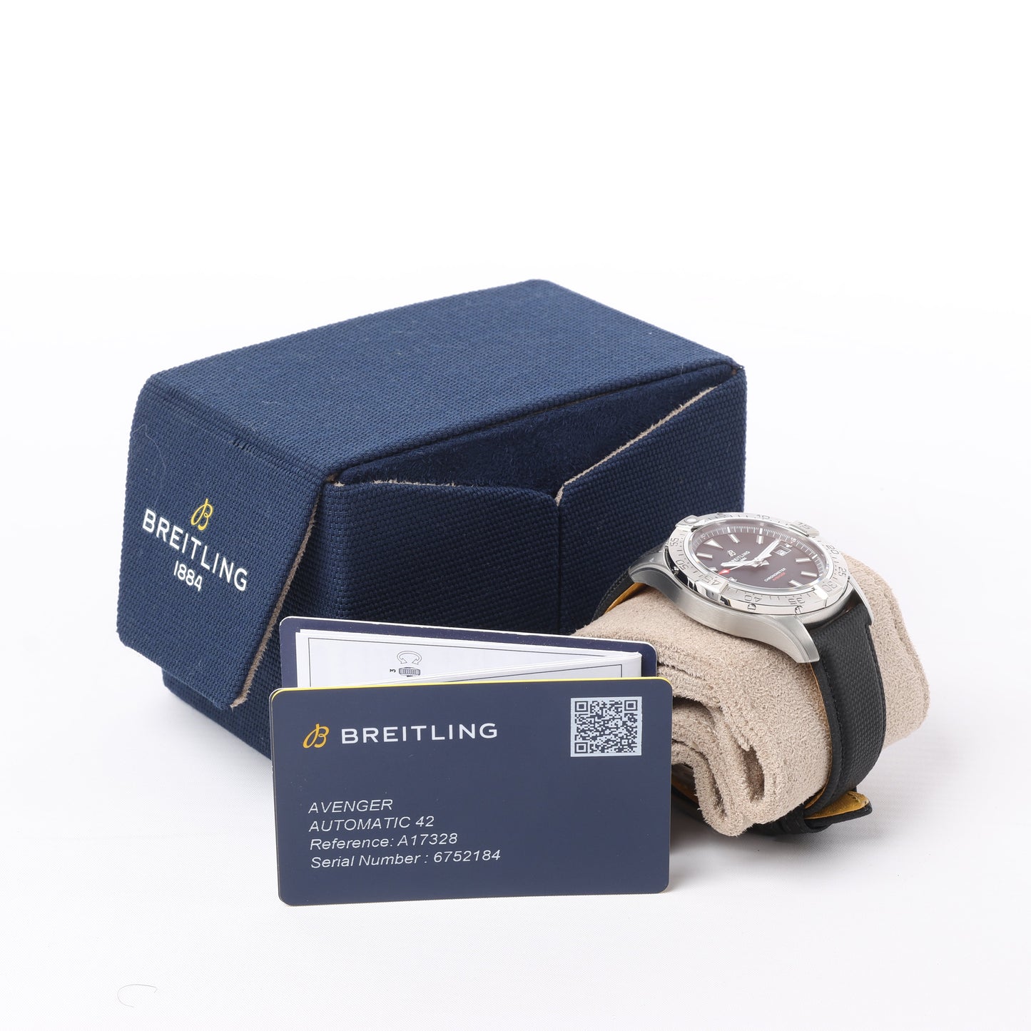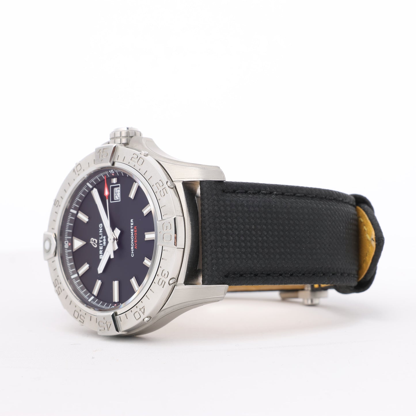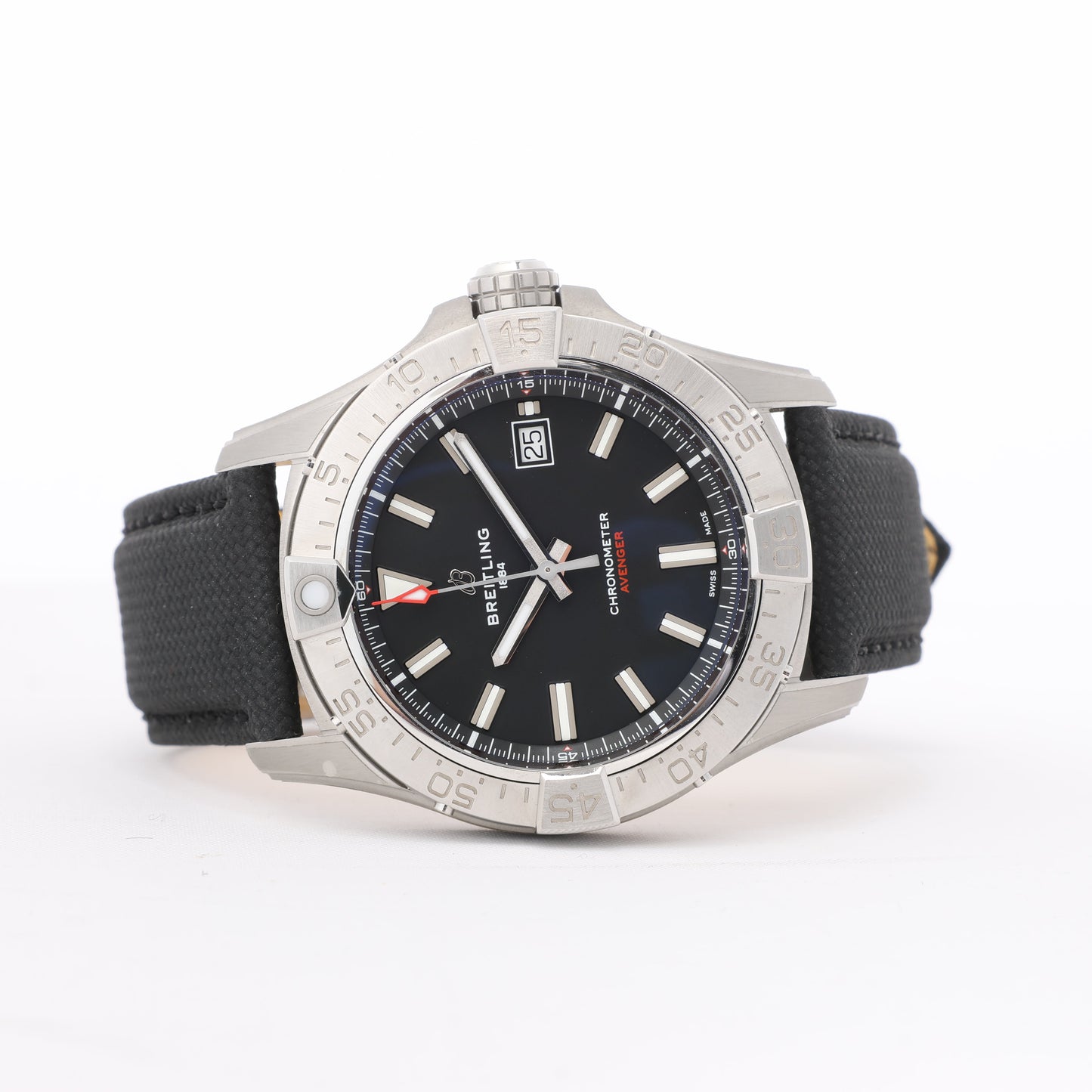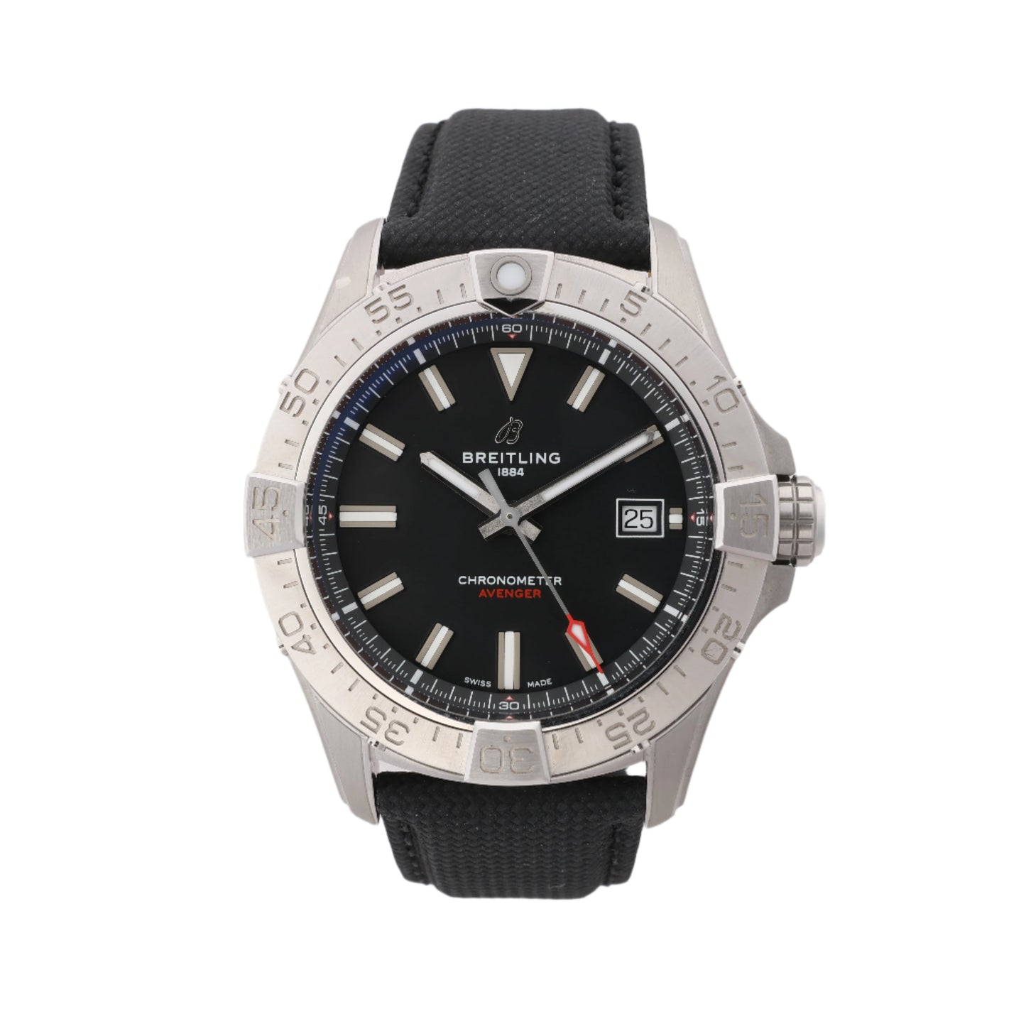 Bold and built for performance, this Breitling Avenger A17328 features a robust stainless steel case, sleek black dial, and durable leather strap. An automatic chronometer designed for precision and adventure.