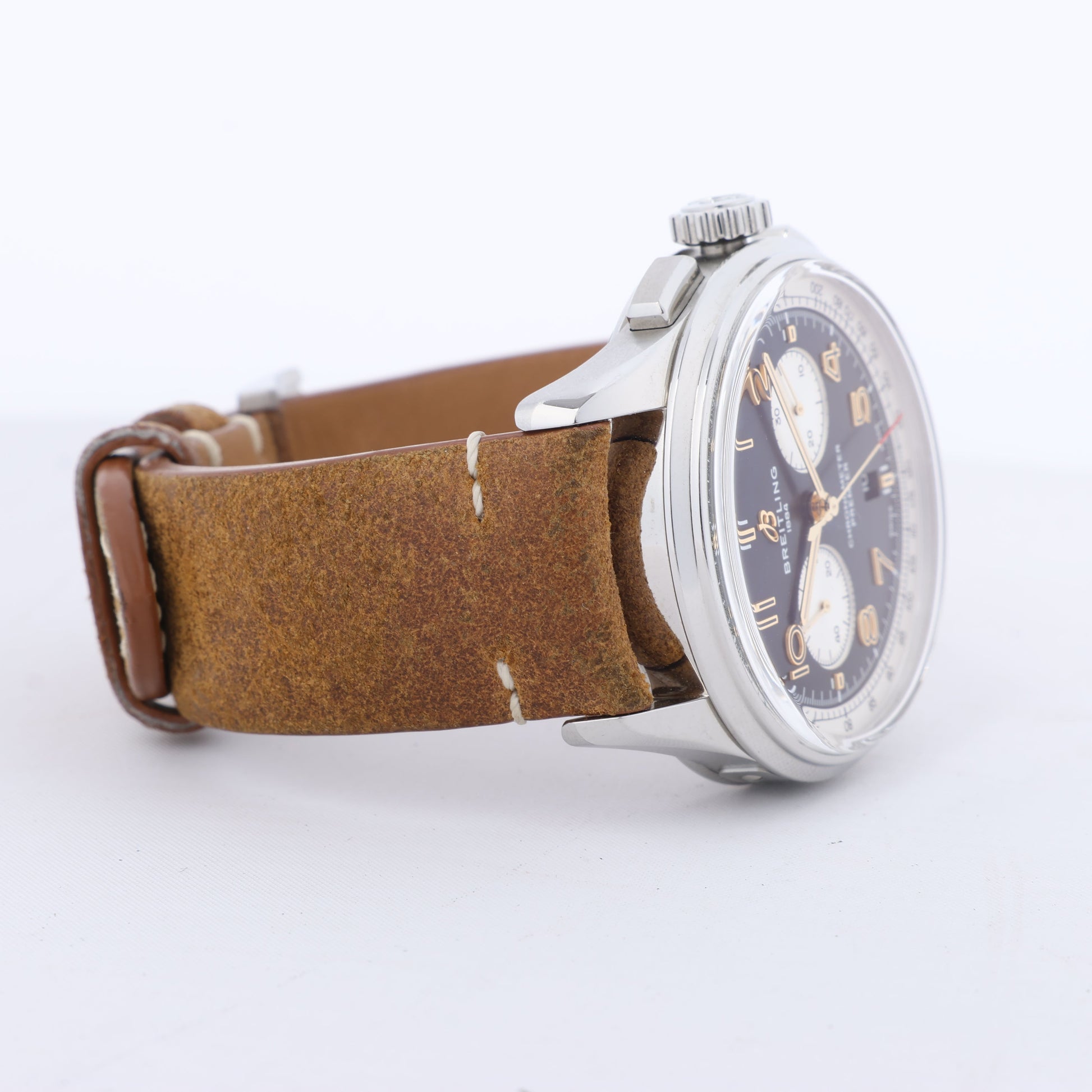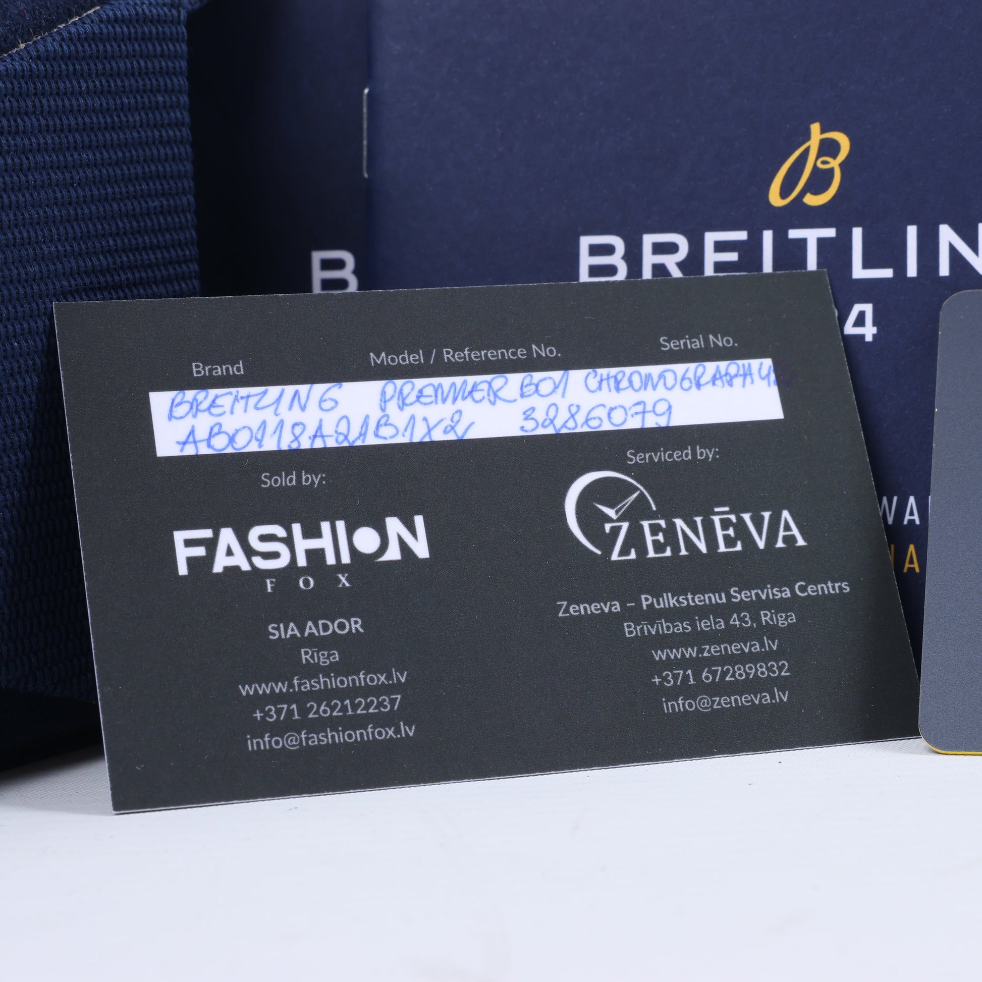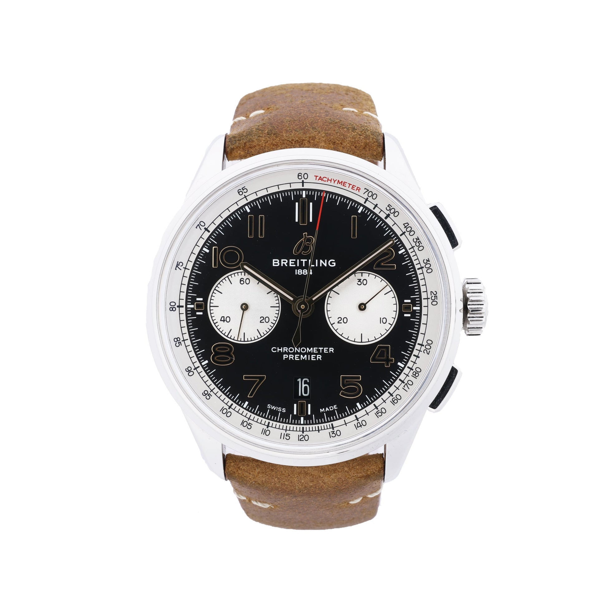 Breitling Premier B01 Chronograph 42 AB0118A21B1X2 features a black dial, stainless steel case, and brown leather strap. Powered by an in-house automatic movement, this certified chronometer blends vintage charm with precision performance.
