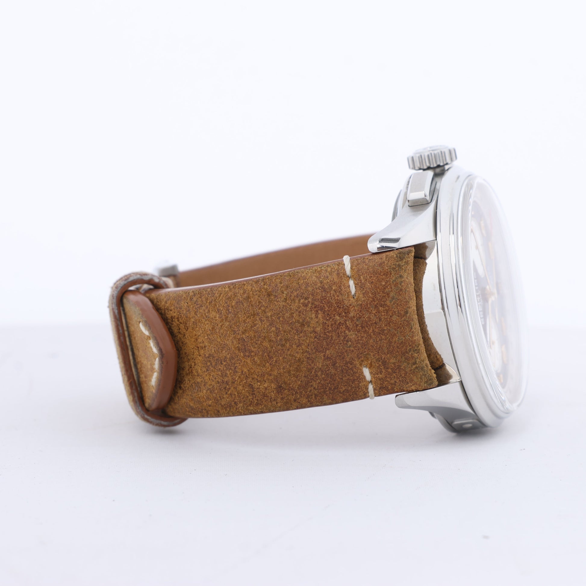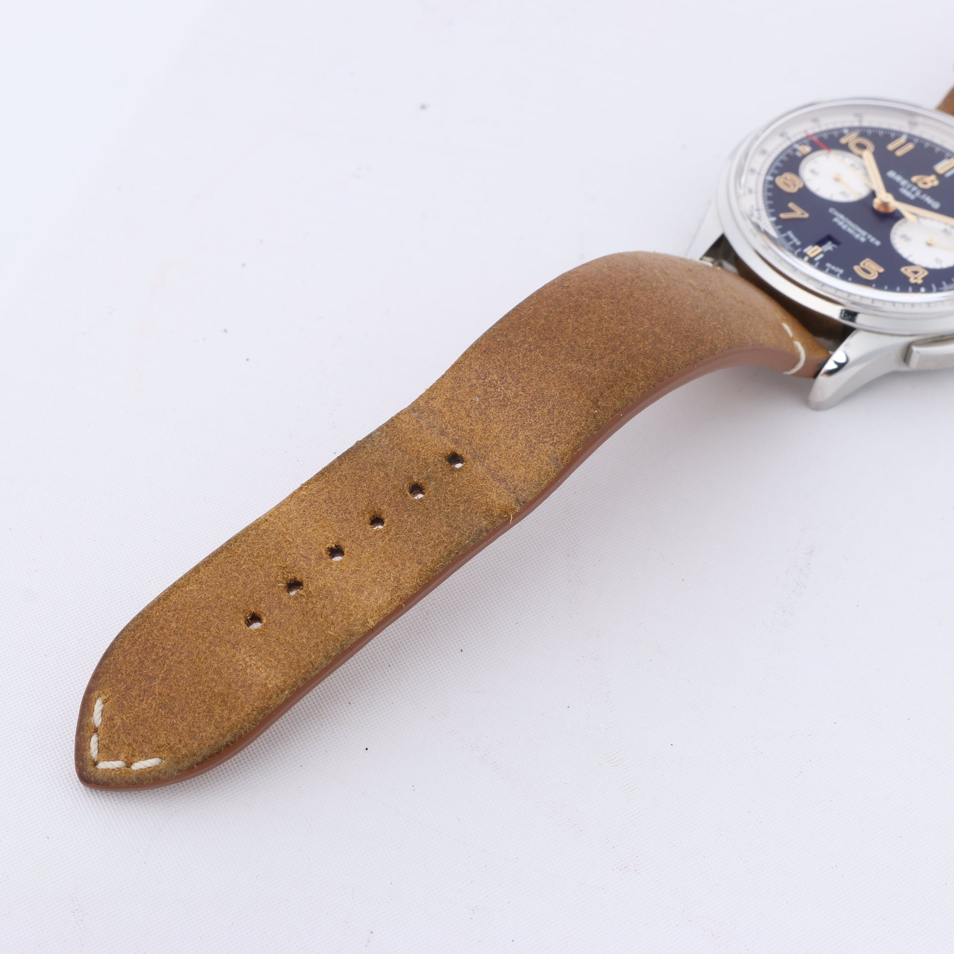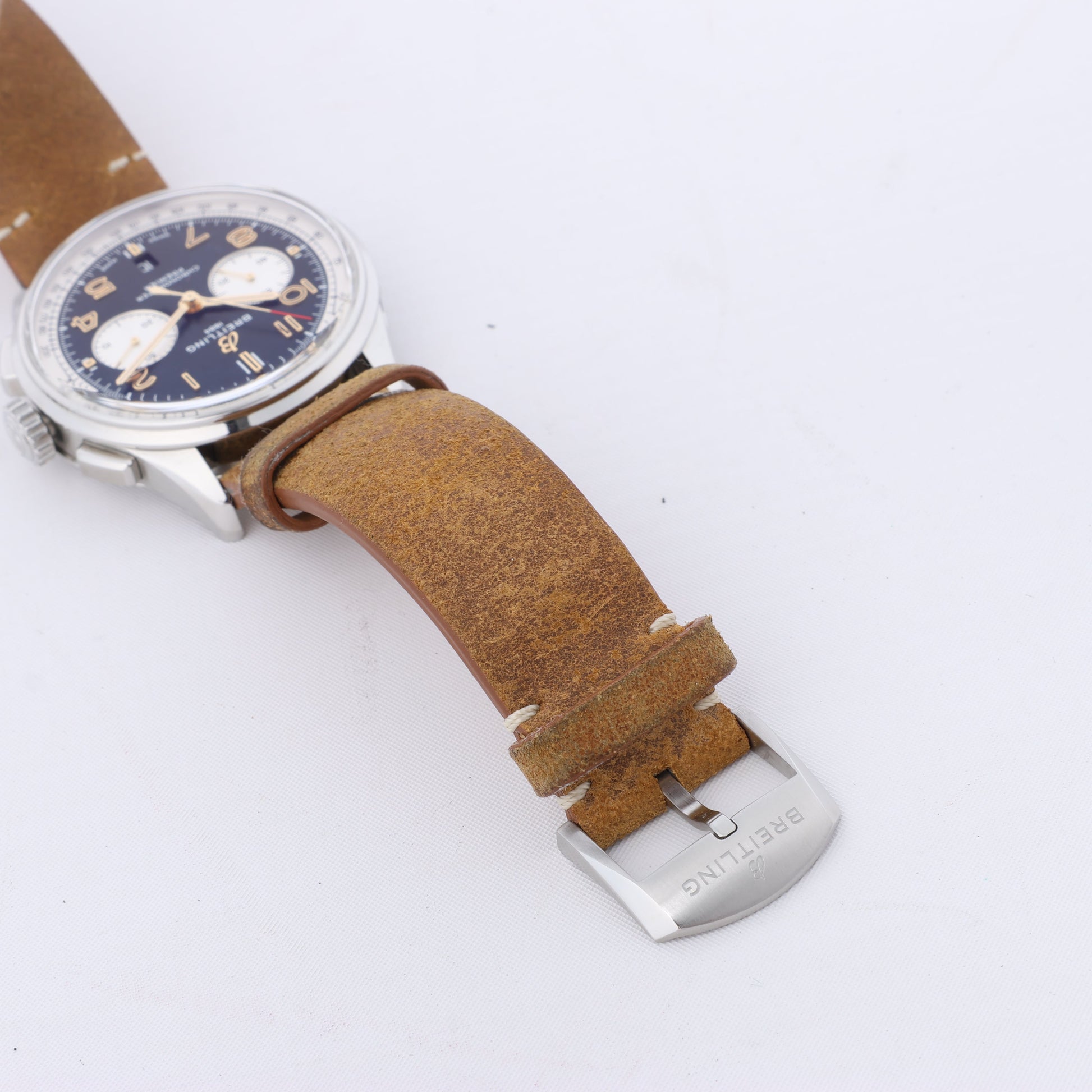 Breitling Premier B01 Chronograph 42 AB0118A21B1X2 features a black dial, stainless steel case, and brown leather strap. Powered by an in-house automatic movement, this certified chronometer blends vintage charm with precision performance.
