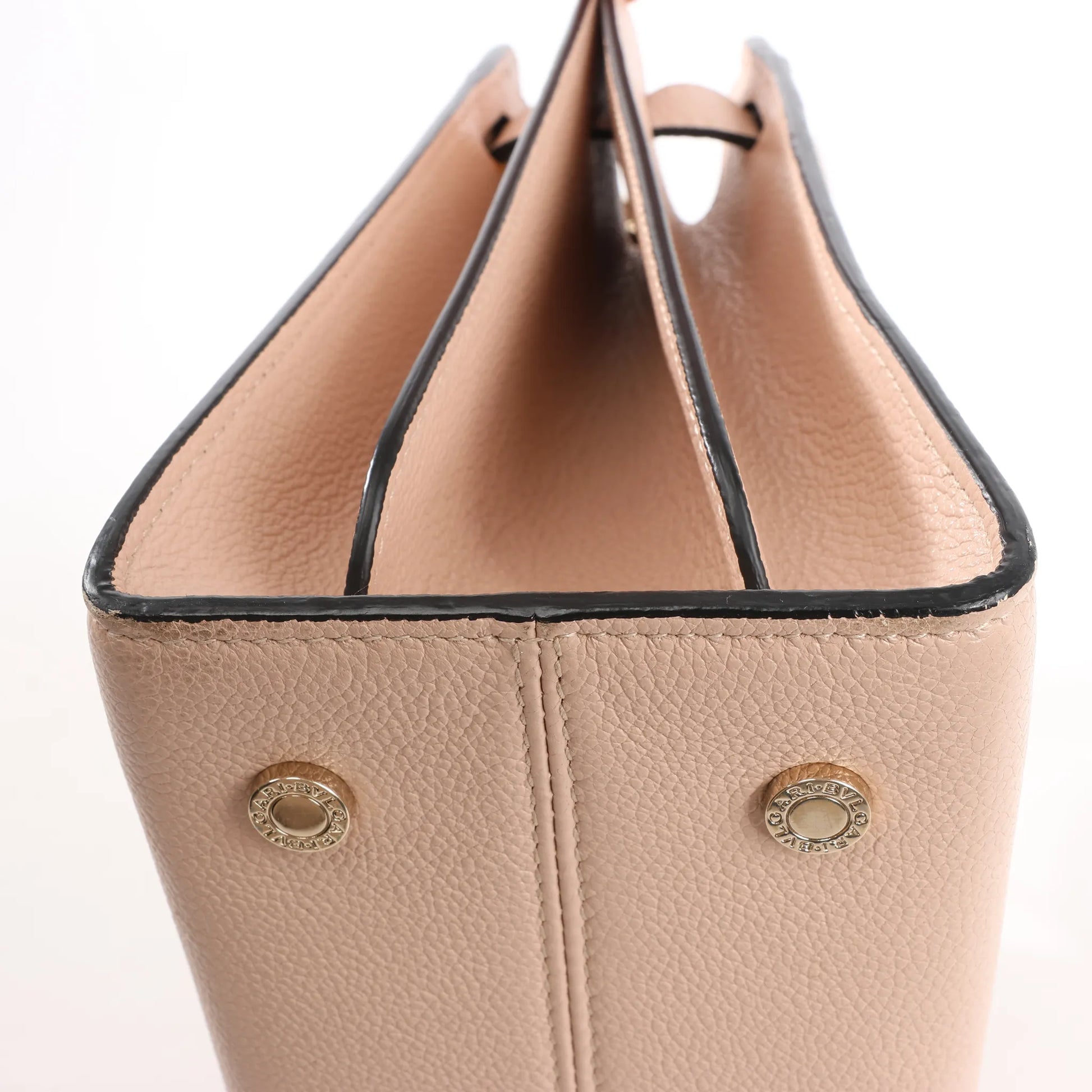 Refined and timeless, the BVLGARI ALBA 2-Way Handbag in beige grained leather features a structured silhouette, dual carry options, and a signature Serpenti-inspired circular logo charm in gold and black enamel.
