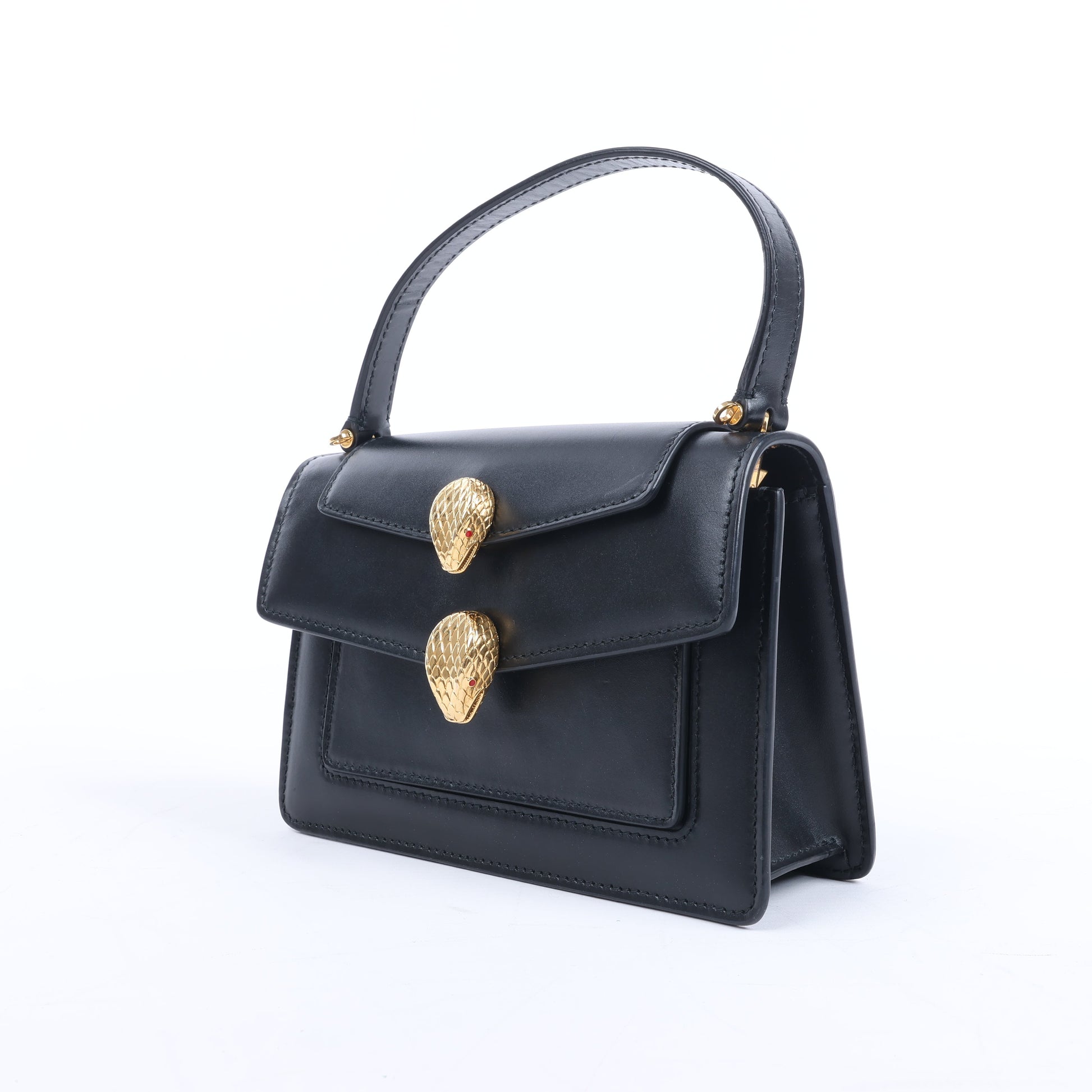 Bvlgari × Alexander Wang Serpenti Handbag in black leather, featuring bold dual serpenthead clasps in gold-tone hardware. A striking fusion of high fashion and iconic luxury.