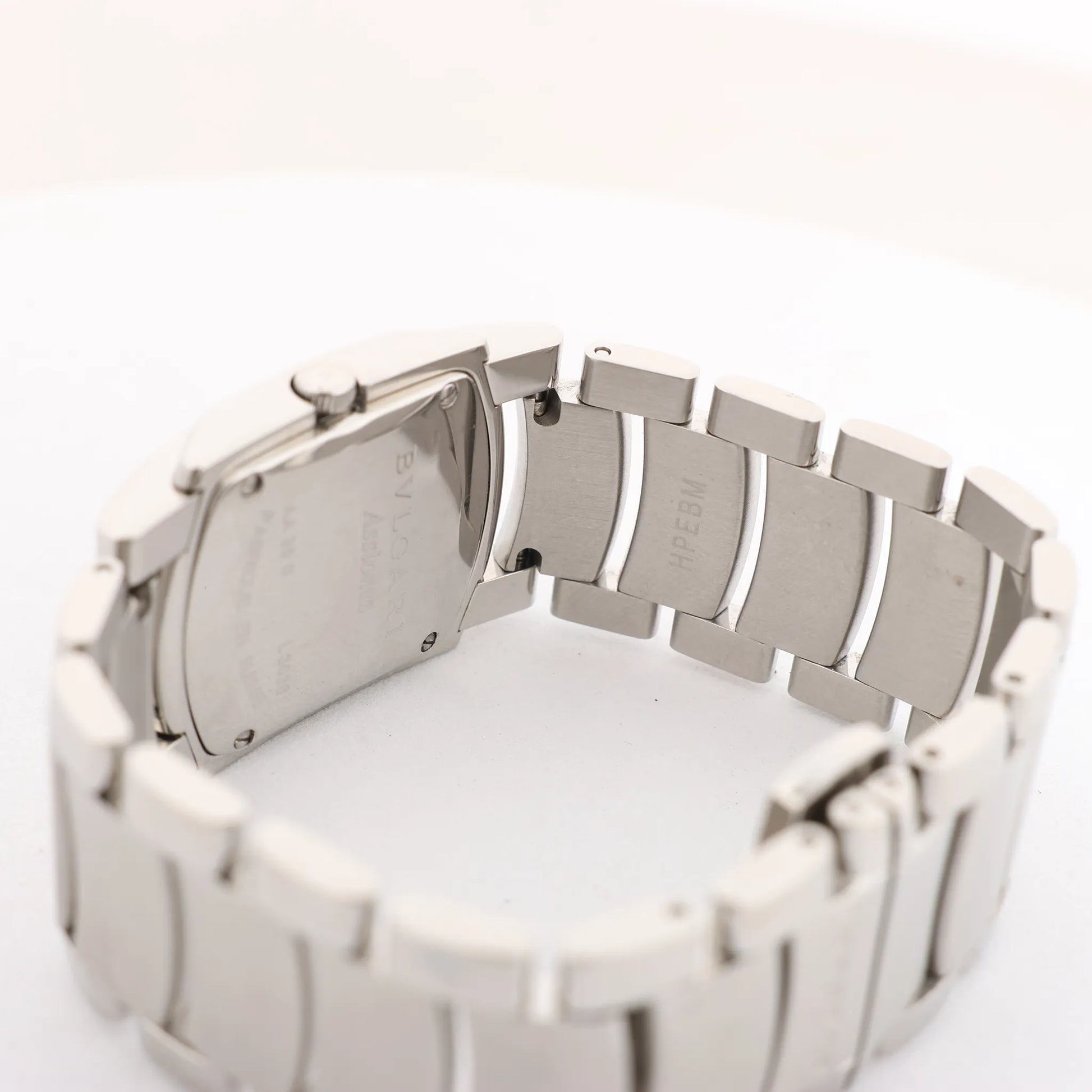 The Bvlgari Ashoma AA35BSS L3036 is a sleek stainless steel quartz watch featuring a bold black dial and curved rectangular case, embodying Italian sophistication and modern design.