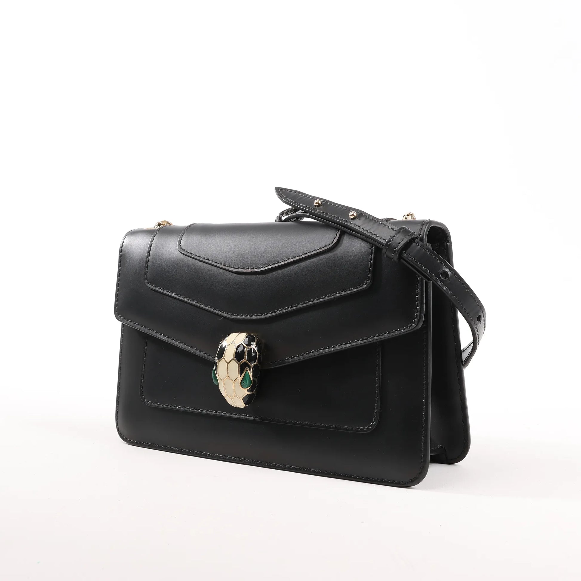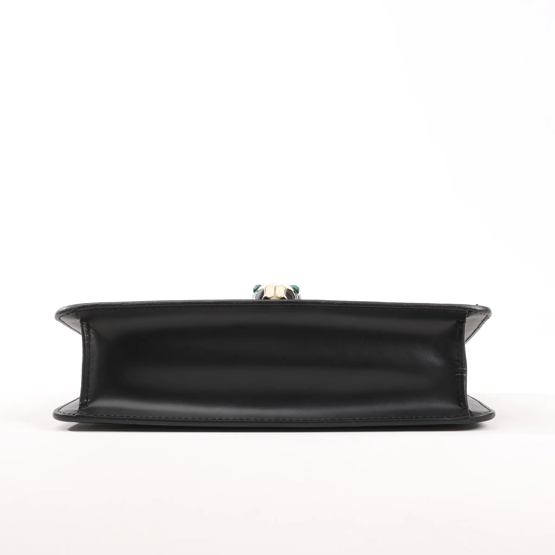 Turn heads with the BVLGARI Serpenti Forever Leather Chain Shoulder Bag in Black. Crafted from smooth calf leather, this sleek bag features the iconic enamel Serpenti head clasp with malachite-green eyes—an emblem of luxury and bold elegance.