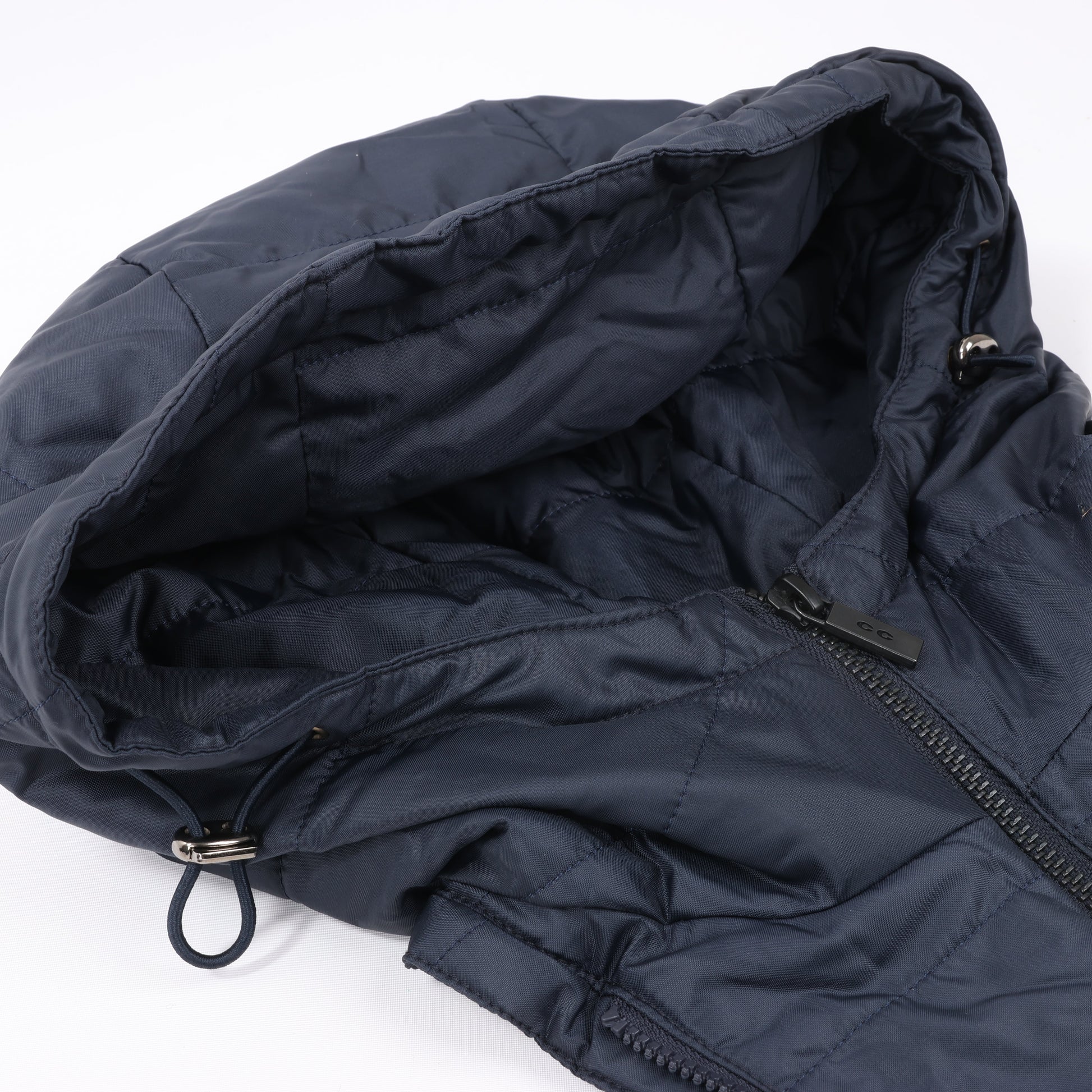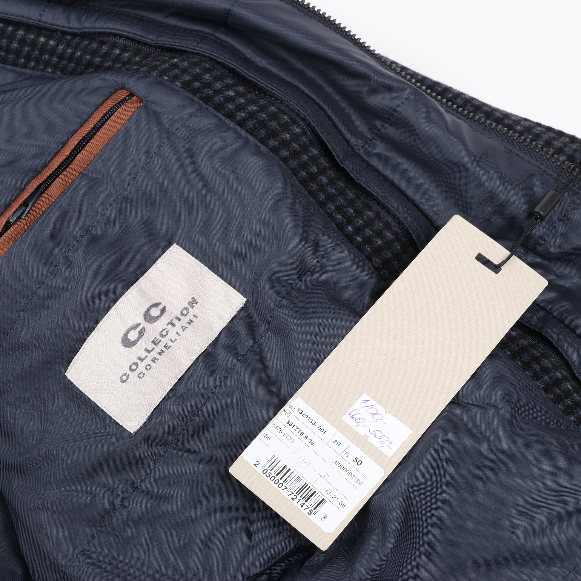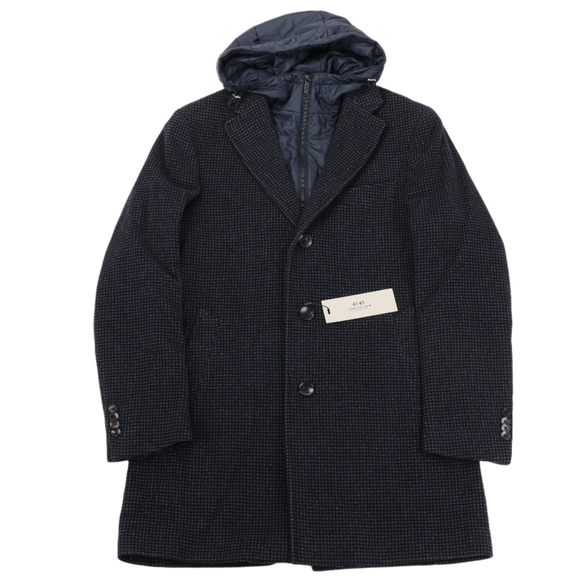 This elegant Corneliani wool coat, size 50, features a subtle check pattern and comes with a detachable quilted hooded liner for versatile wear. Combining classic tailoring with practical functionality, it’s perfect for colder weather.
