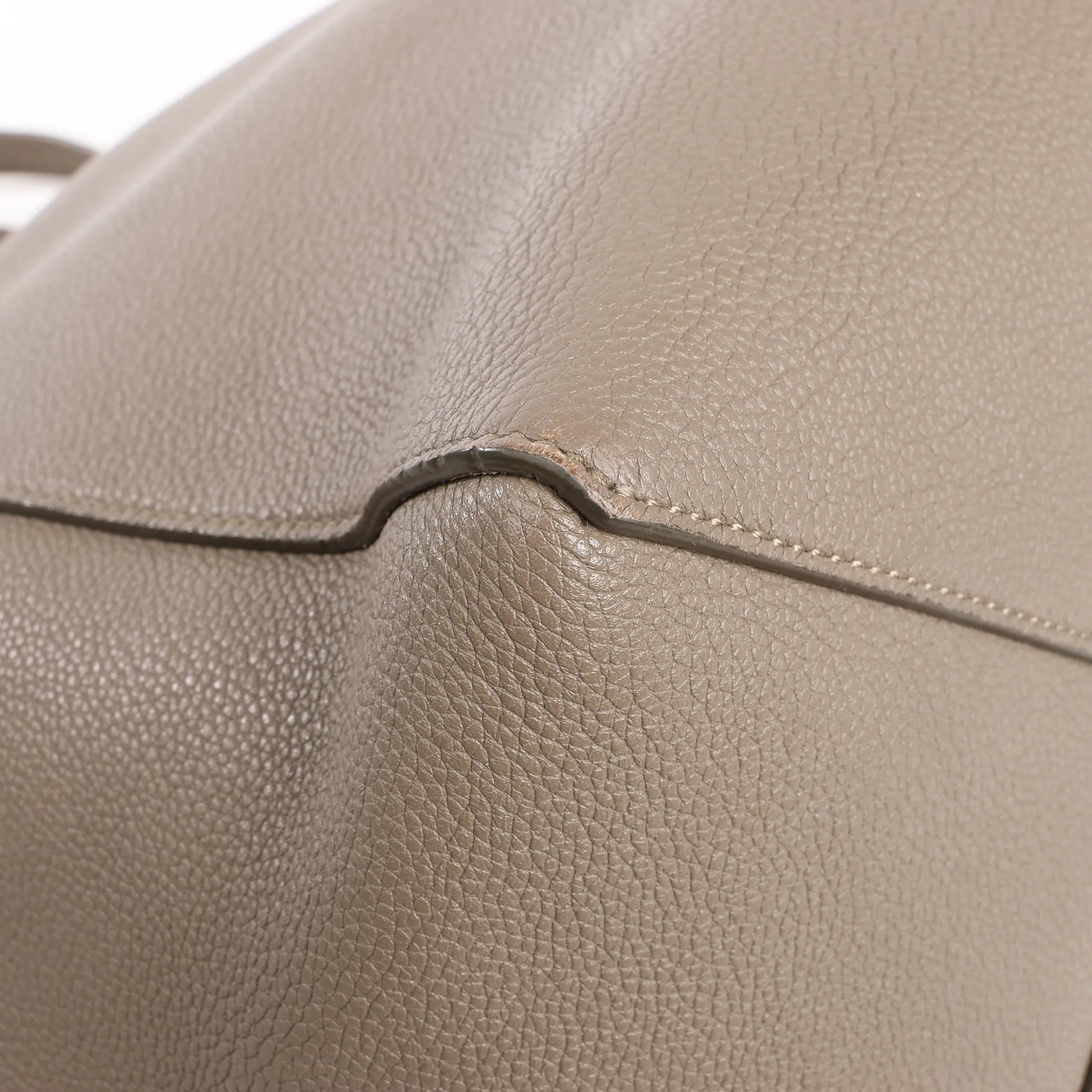 The Celine Cabas Phantom Small Shoulder Bag in taupe grained leather is a minimalist icon, blending timeless elegance with spacious functionality for daily luxury.