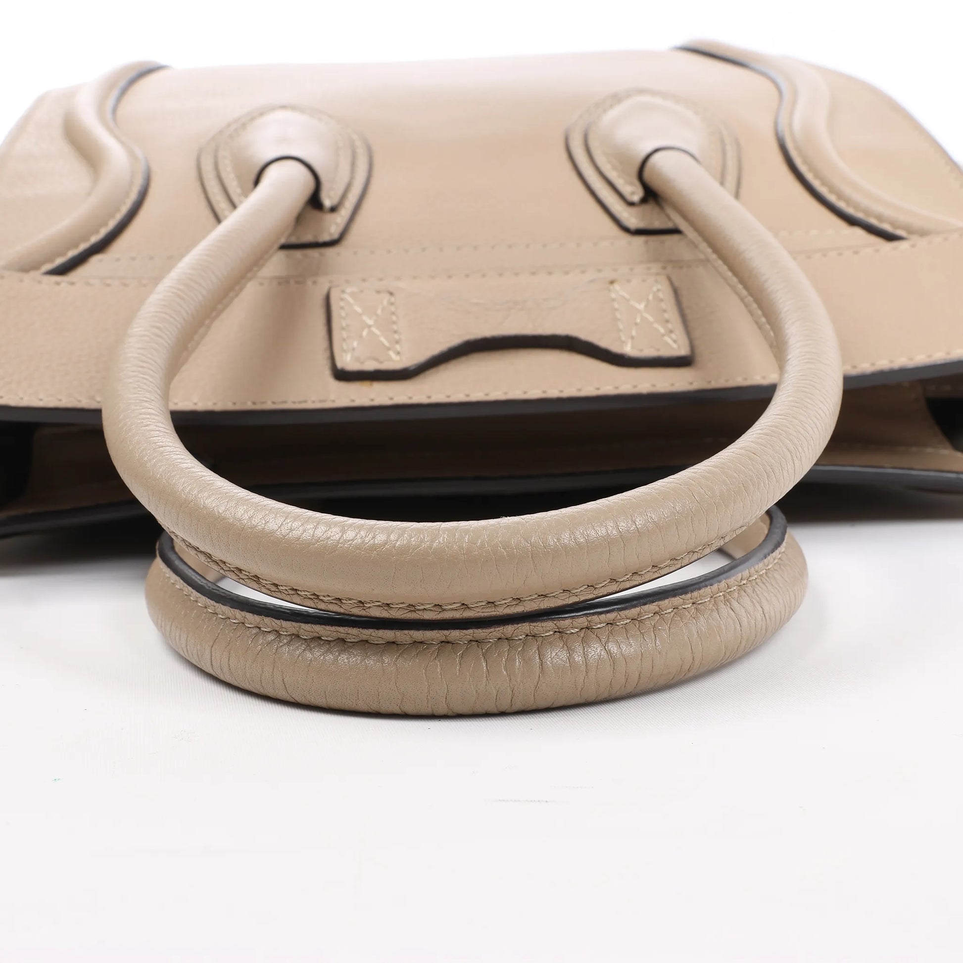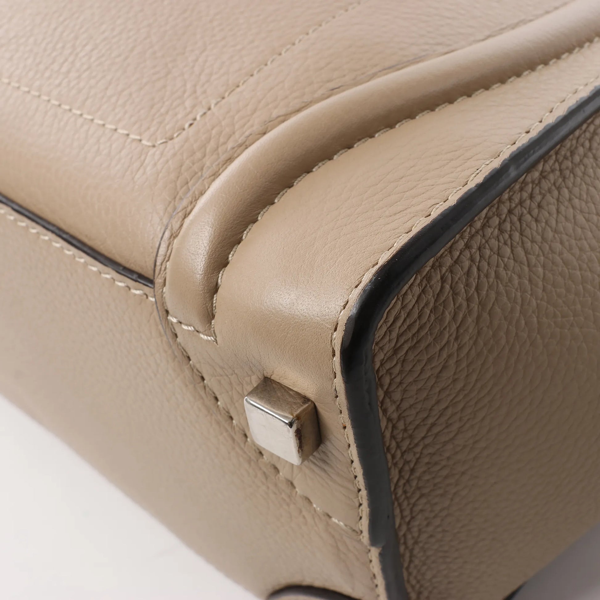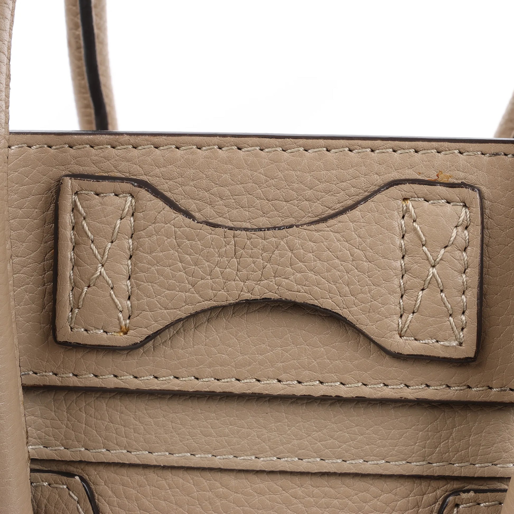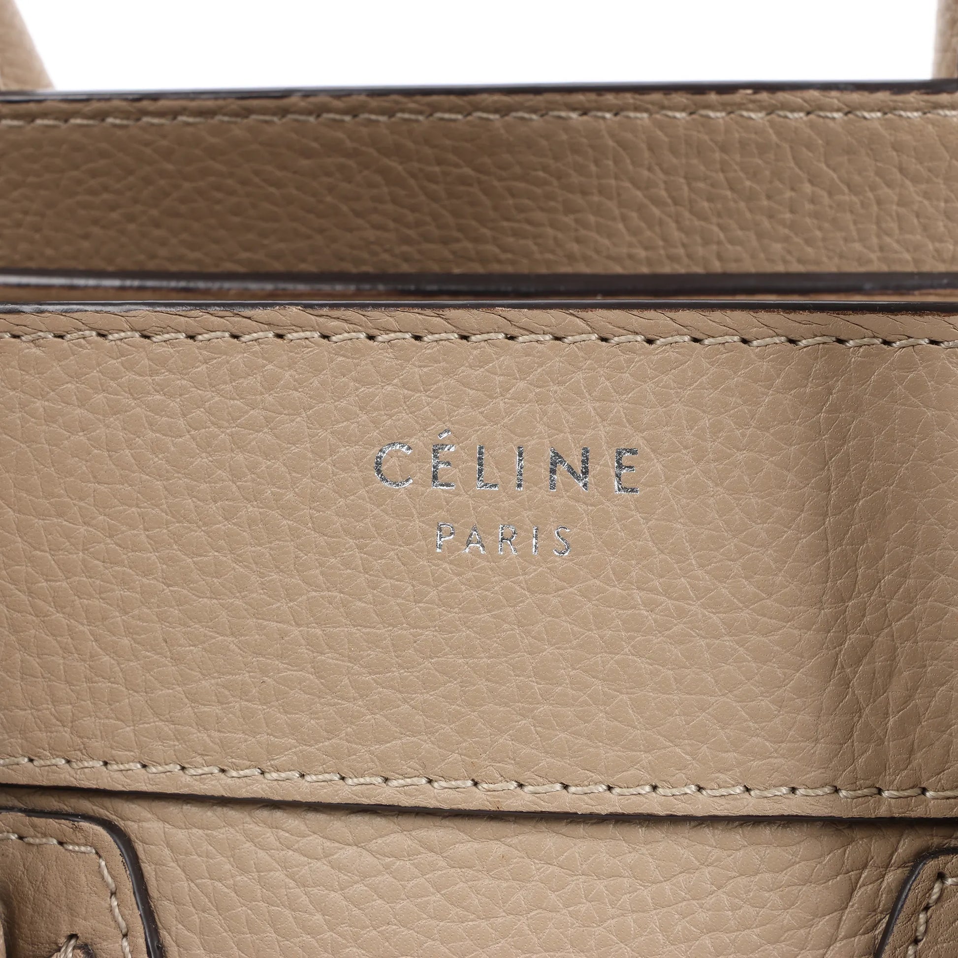 Elevate your everyday style with the Celine Luggage Micro Handbag in beige grained leather. This iconic design blends structure with elegance, featuring premium calfskin and the signature front zip pocket—perfect for timeless sophistication.
