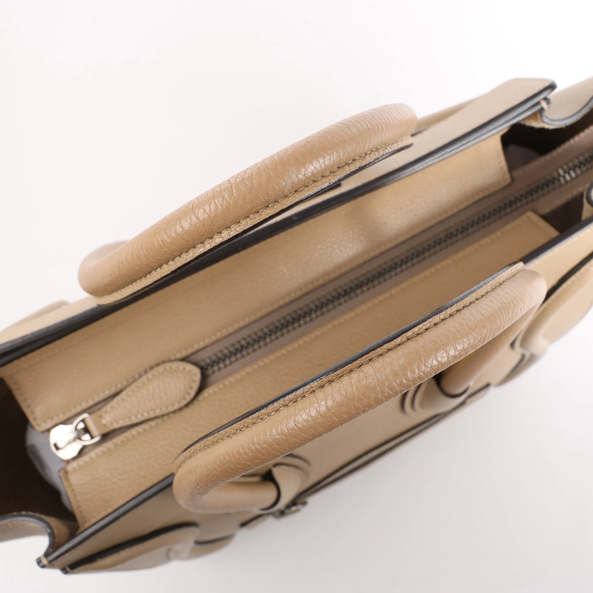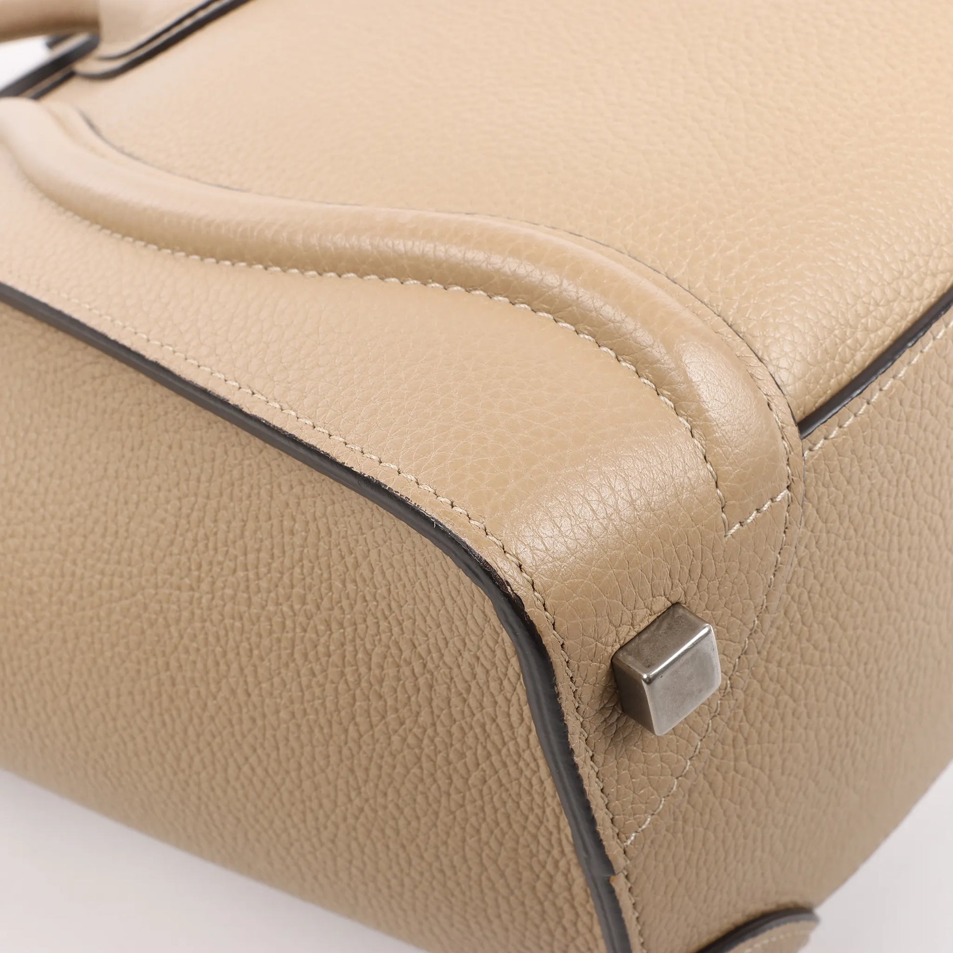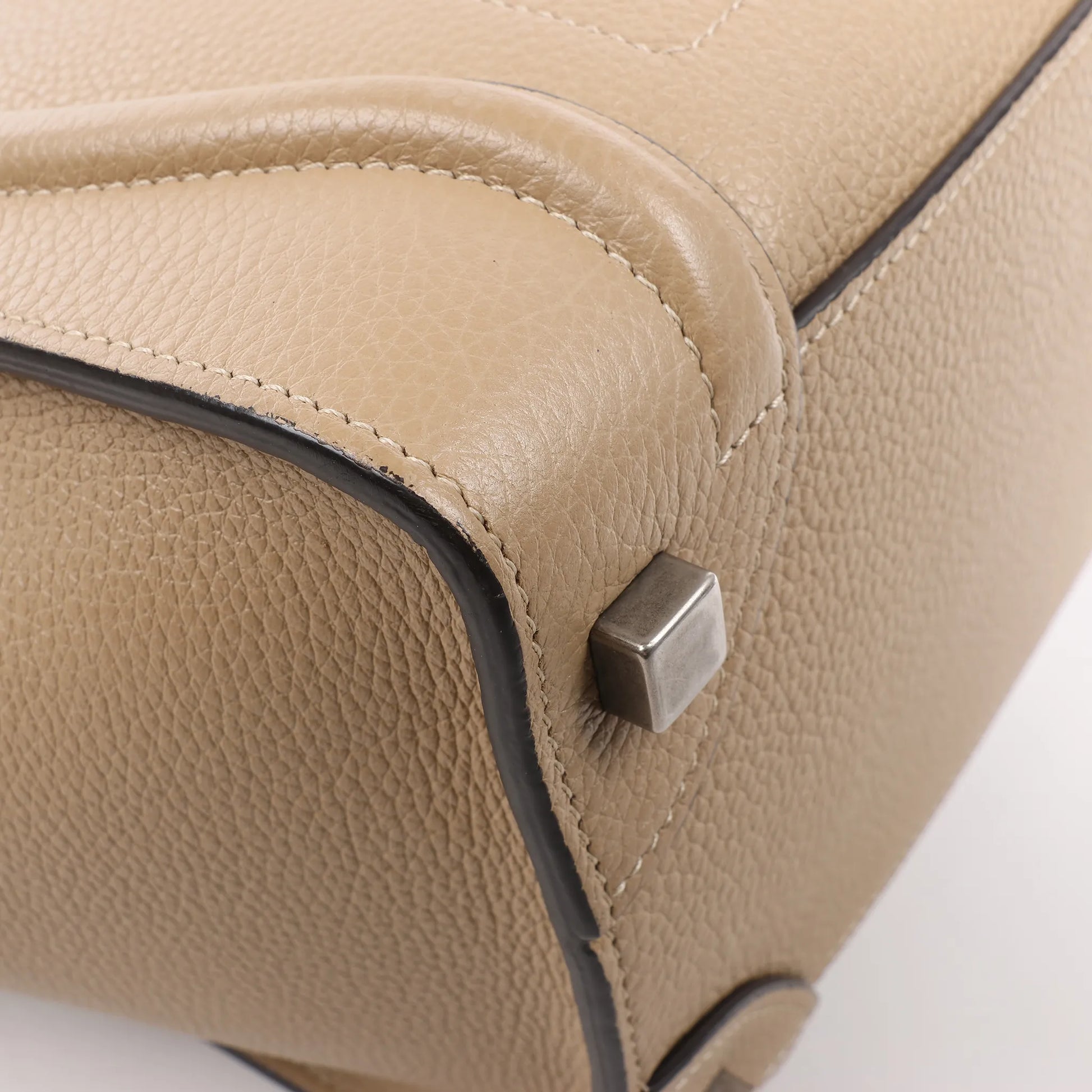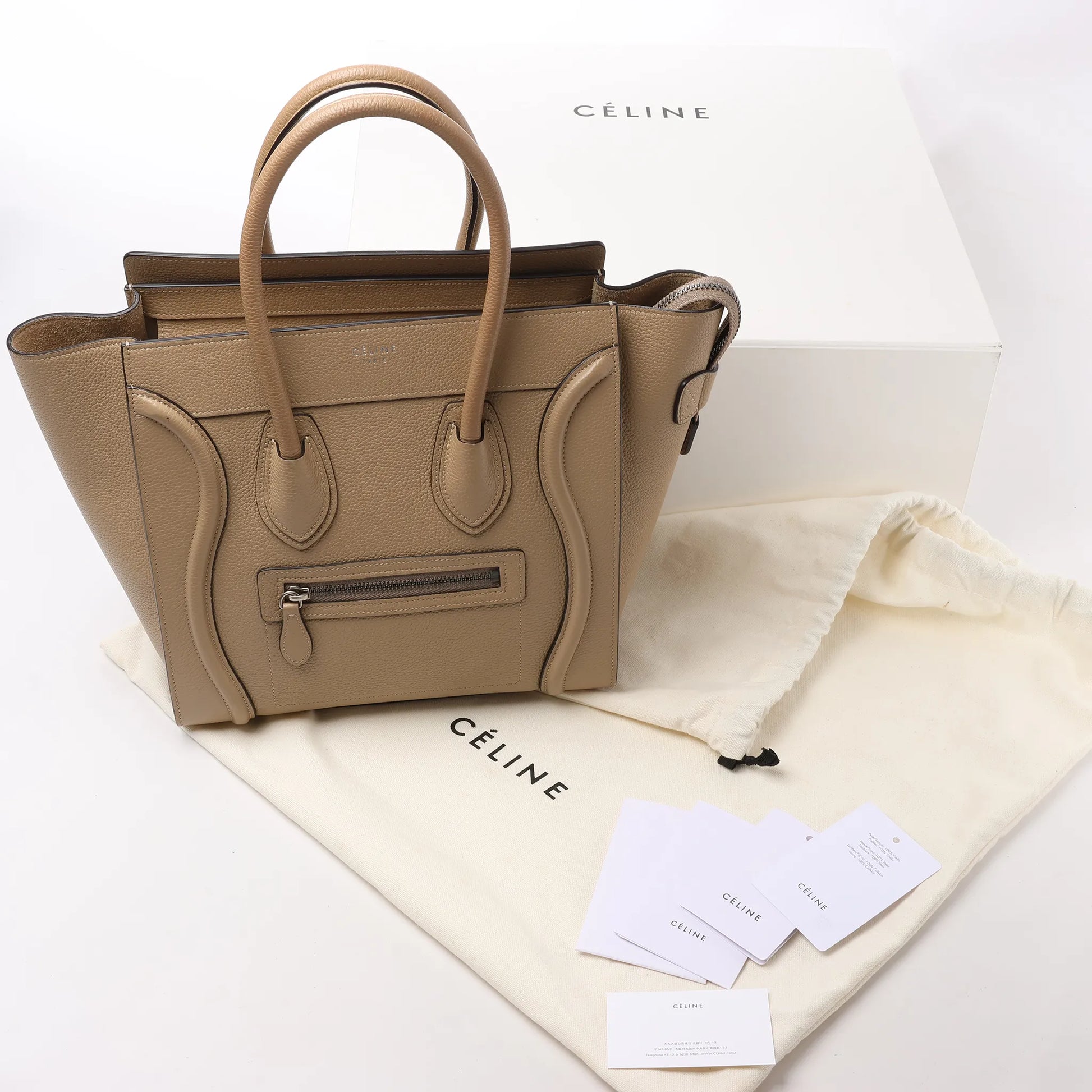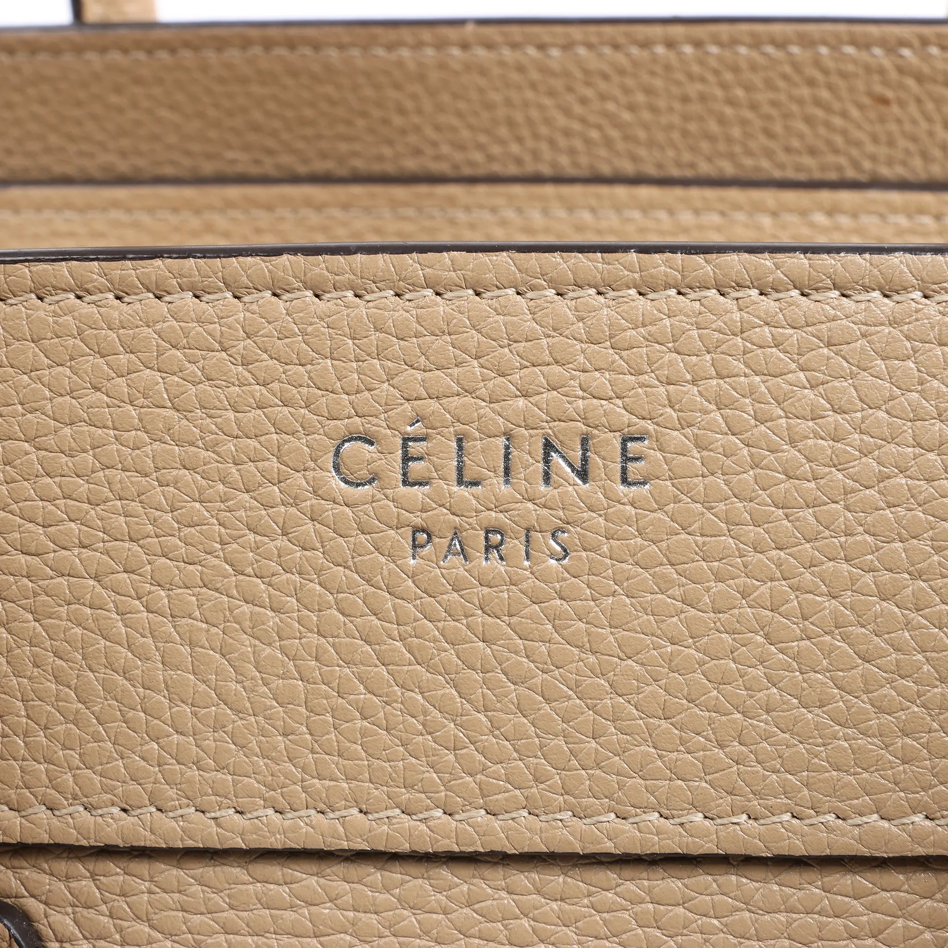 The CELINE Luggage Micro Leather Handbag in Beige is a modern icon with its structured silhouette and sculptural lines. Crafted from premium grained leather, this timeless piece offers everyday elegance with a zip pocket and spacious interior.