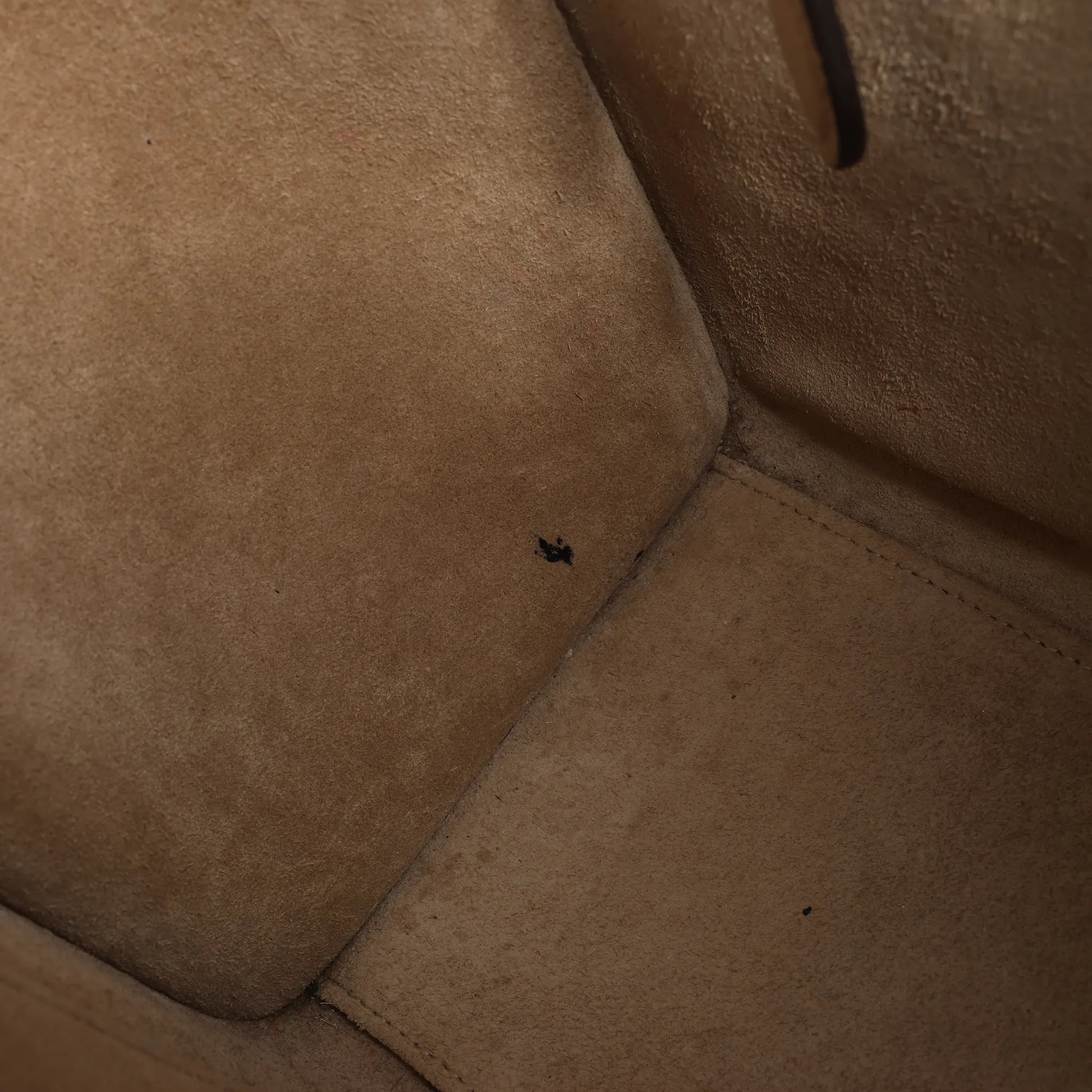 Condition Details: Exterior leather is clean and beautiful in very good condition except some scratches and rubbings. Handles are clean and firm in very good condition, but has usage rubbings. Hardware is bright with scratches. The interior lining is in very good condition, except some small stains. Width at the top is 40 cm.