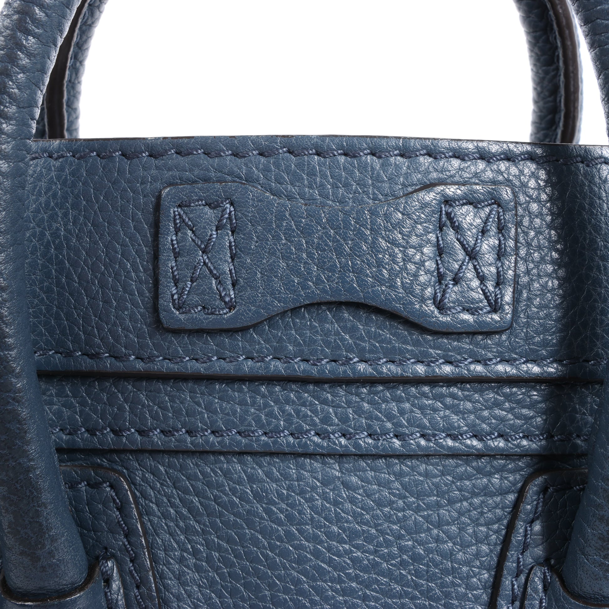 Céline Nano Luggage 2Way Handbag in navy blue grained leather. Iconic and compact, it features rolled top handles, a detachable strap, and sleek front zip pocket for effortless Parisian elegance.