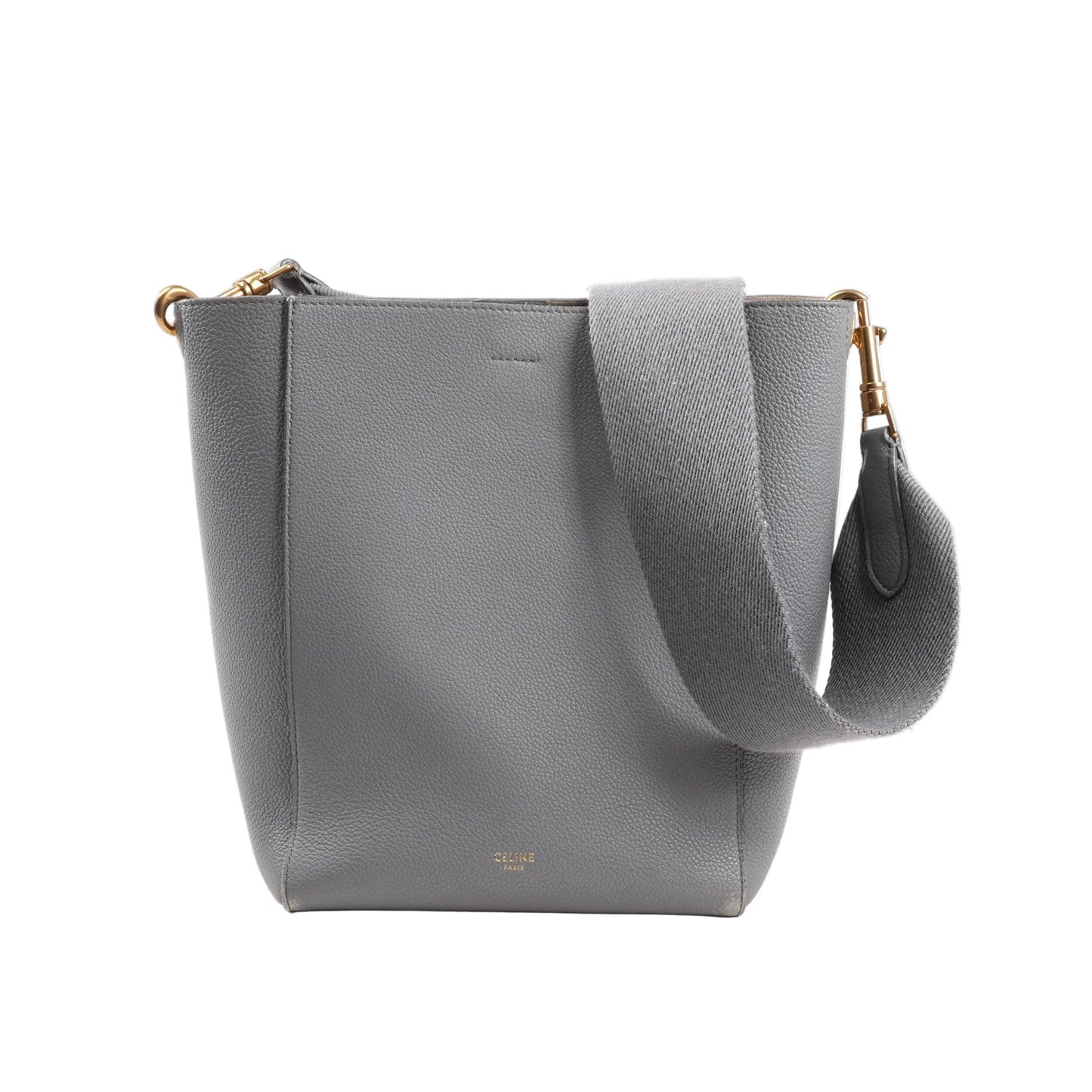 The CELINE Seau Sangle Bucket Mini bag in gray is crafted from supple grained leather and finished with gold-tone hardware. Compact yet spacious, this iconic shoulder bag delivers modern elegance with everyday versatility and a signature minimalist design.