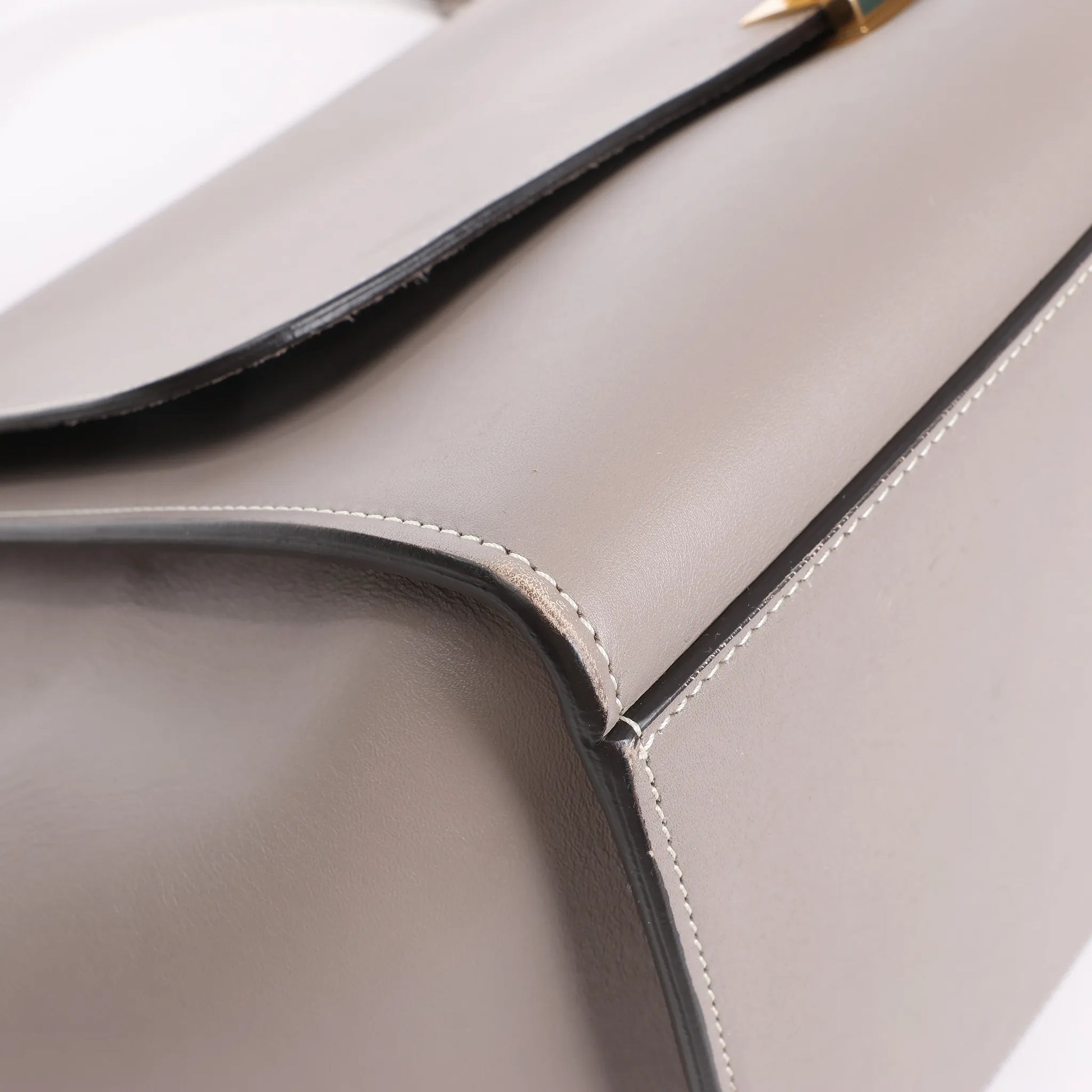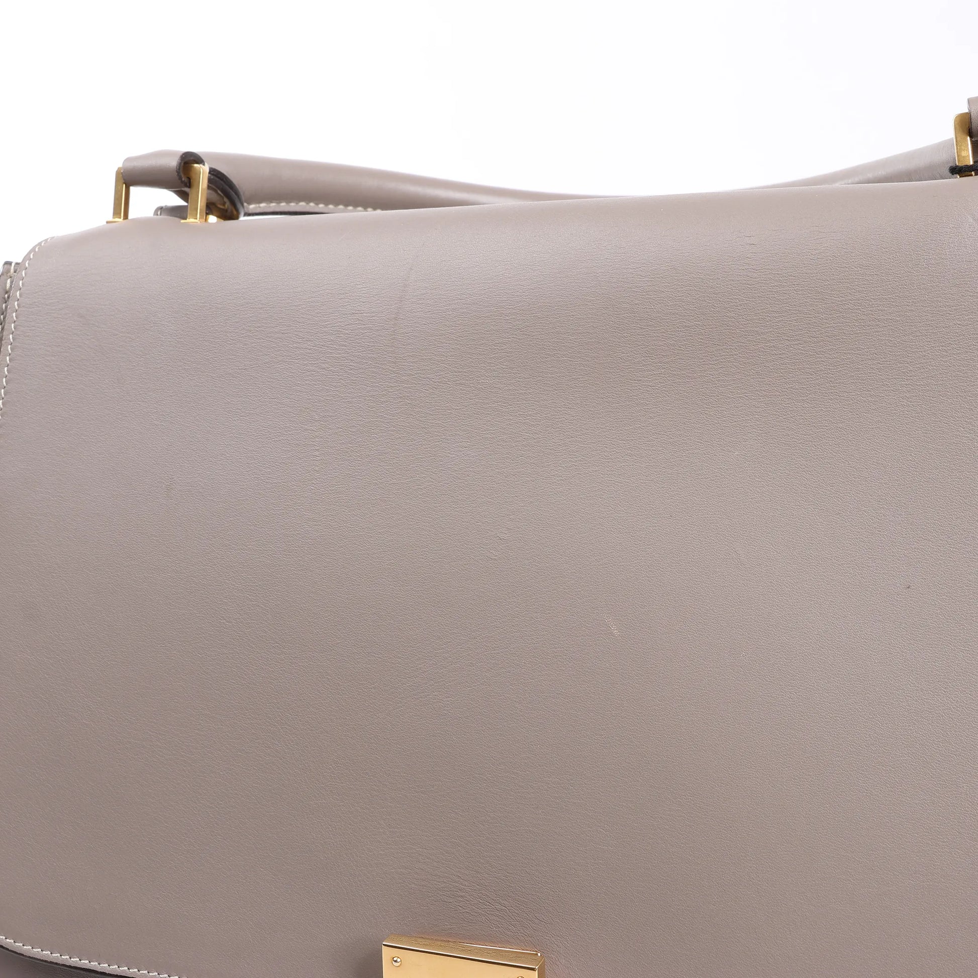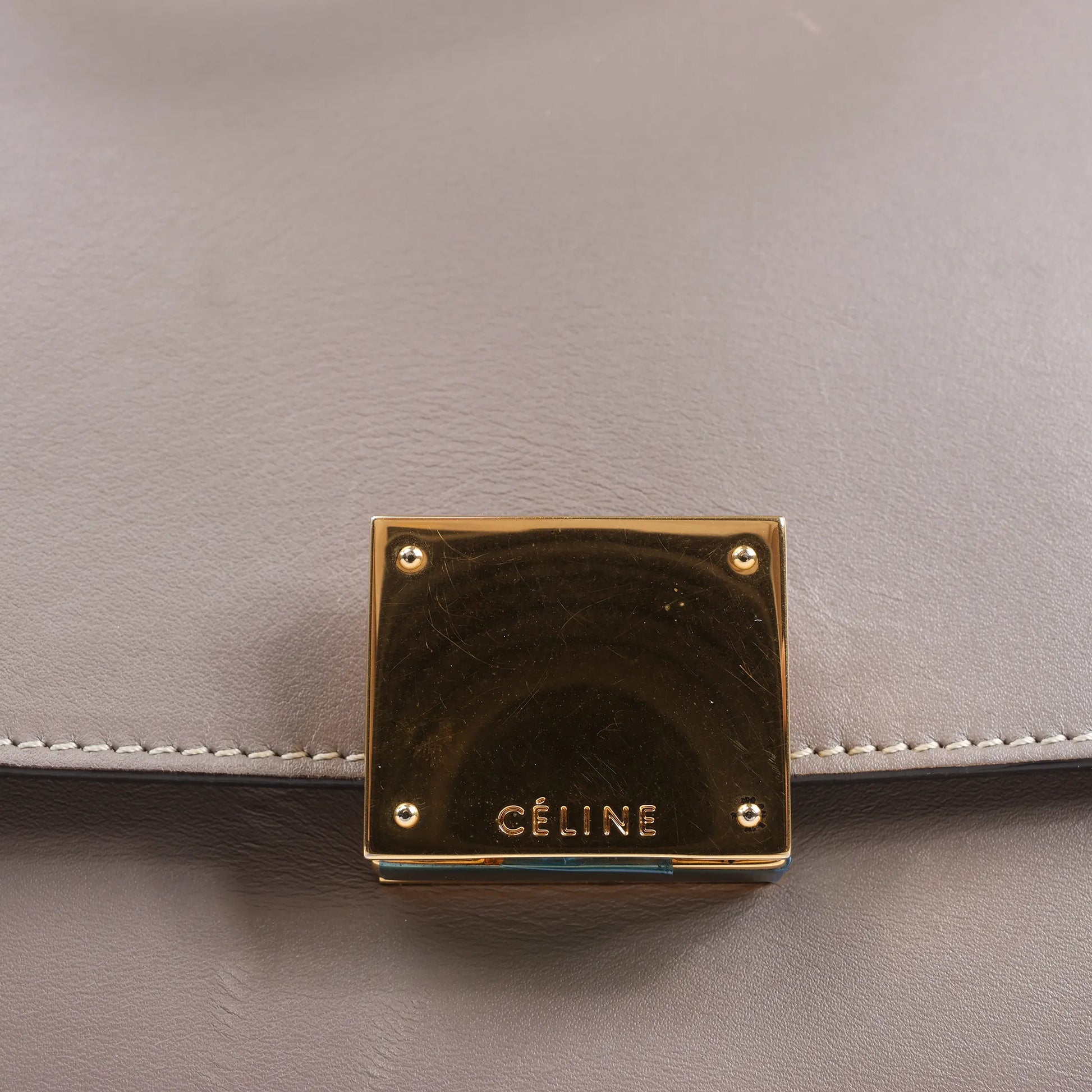 The CELINE Trapeze Leather x Suede 2Way Handbag in Gray blends modern structure with timeless luxury. Made from smooth leather and soft suede, this versatile bag features a flap closure, winged sides, and gold-tone hardware—perfect for elevated everyday wear.