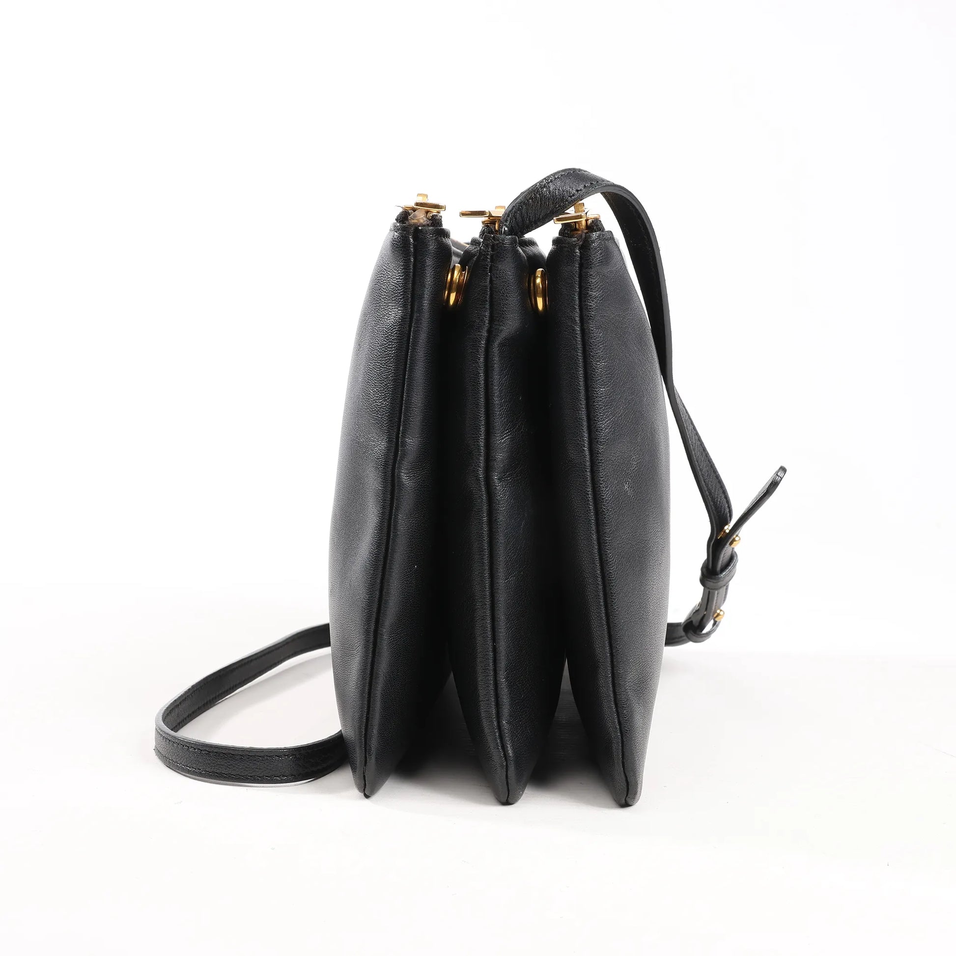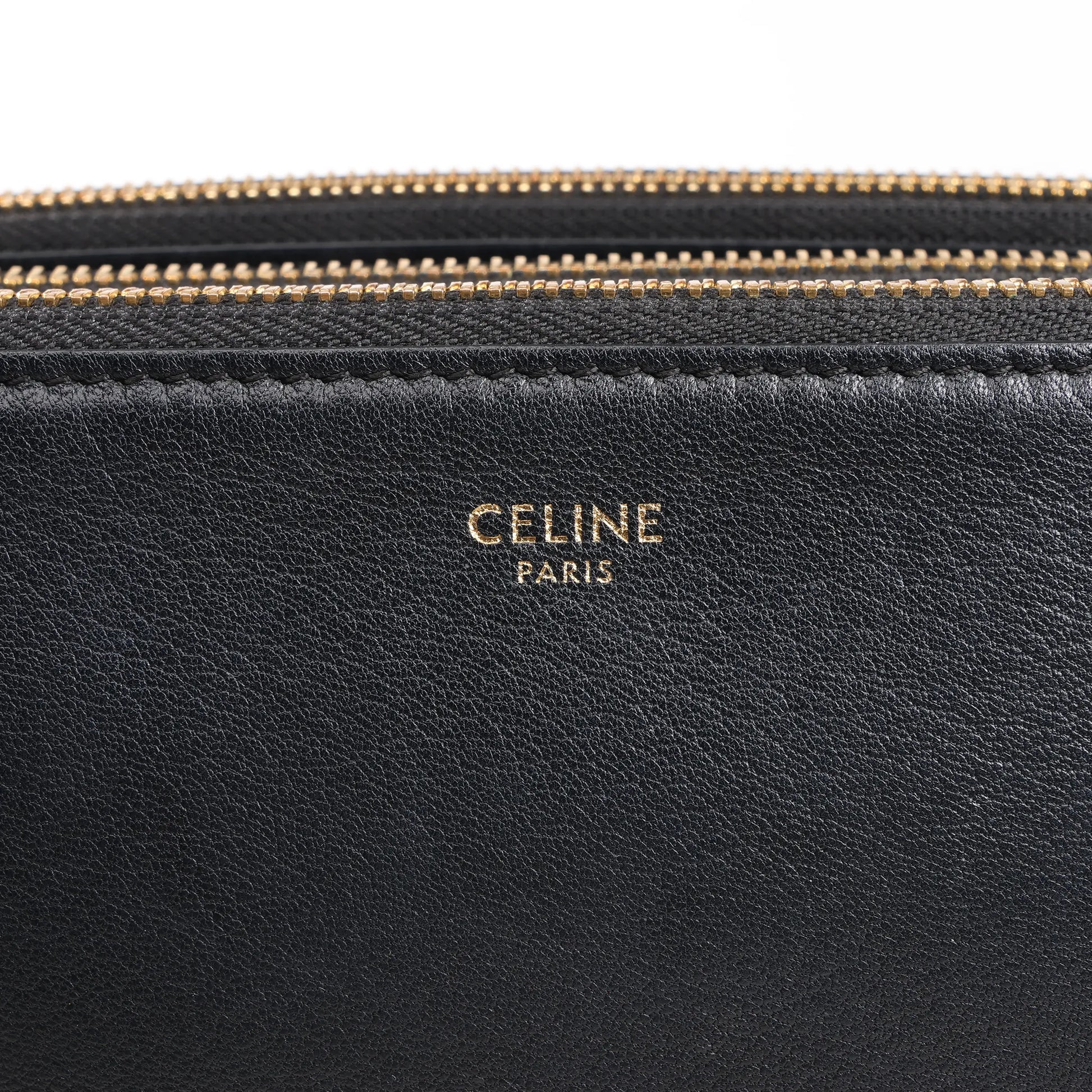 The Celine Trio Large Crossbody Bag in black leather is a minimalist’s dream, featuring three detachable zippered pouches, gold-tone hardware, and an adjustable shoulder strap for effortless everyday elegance.