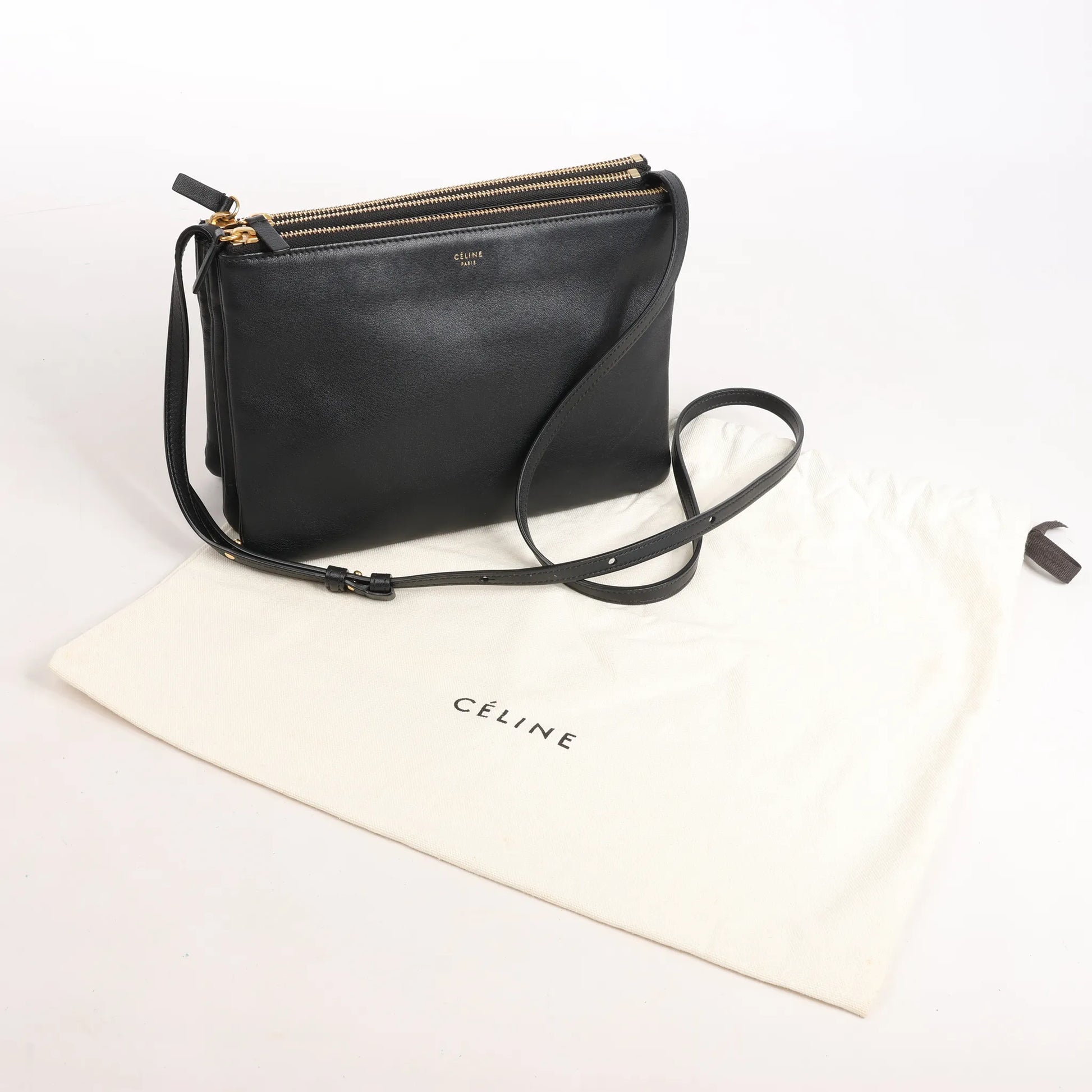 The Celine Trio Large Crossbody in black smooth leather is a minimalist icon, offering three zipped compartments and everyday luxury with effortless Parisian style.