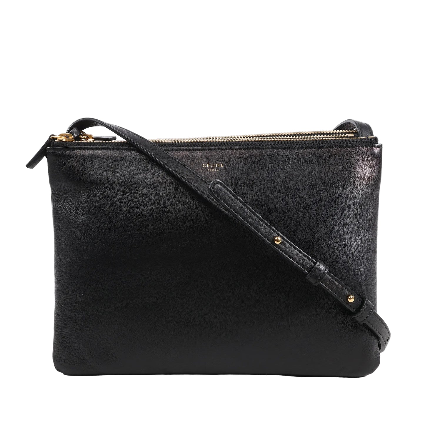 The Celine Trio Large Crossbody Bag in Black is the epitome of minimalist elegance. Crafted from smooth black leather, this iconic design features three zippered compartments and an adjustable shoulder strap—perfect for organized, hands-free sophistication.