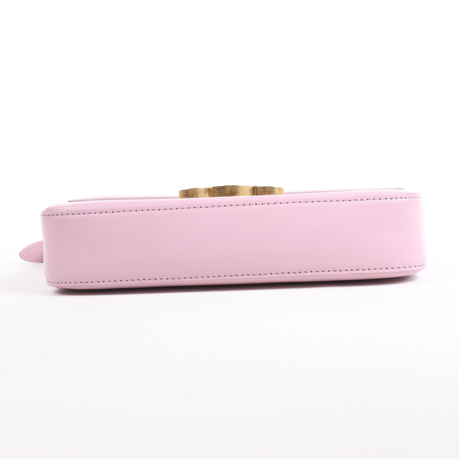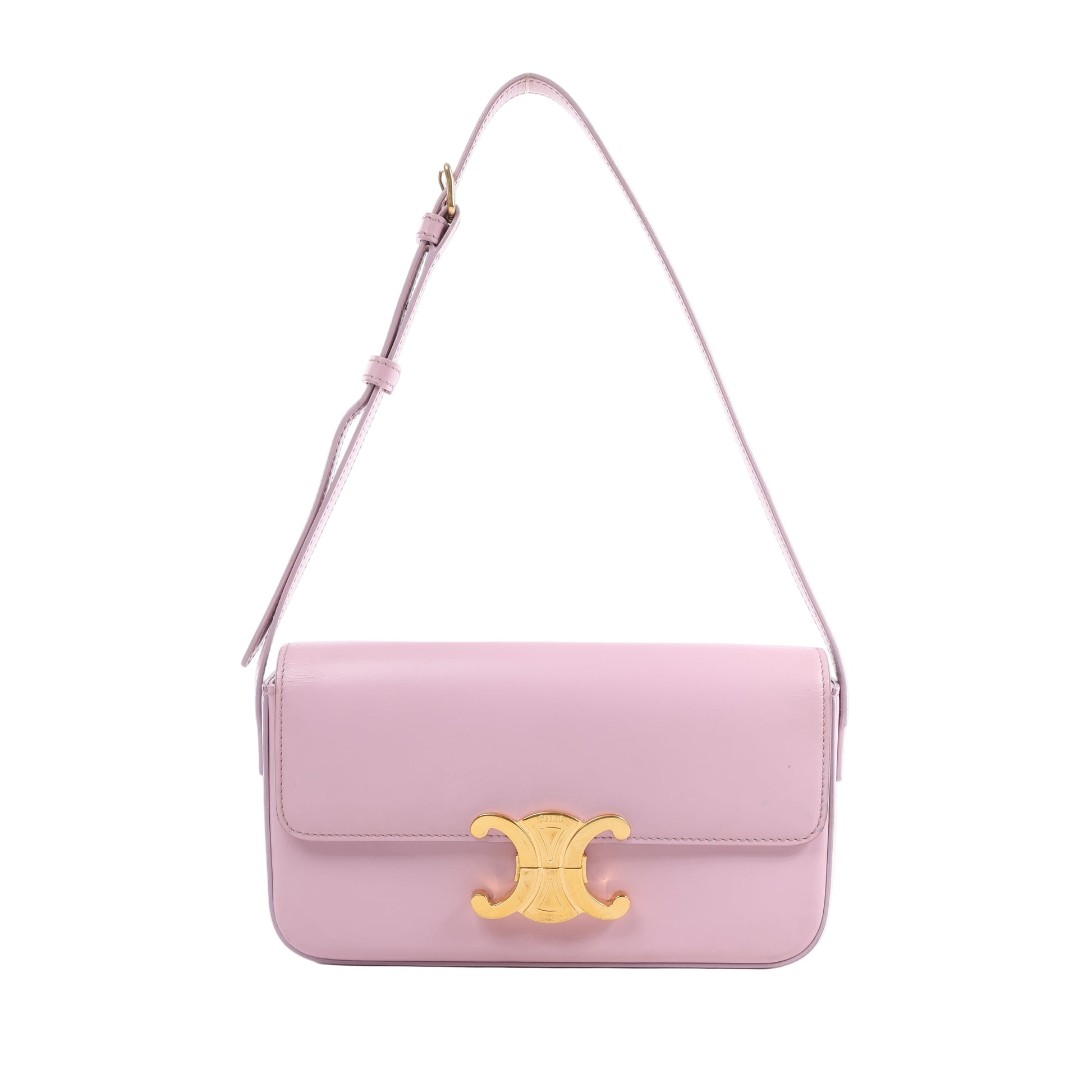 Elevate your style with the Celine Triomphe small shoulder bag in sleek pink smooth leather. Featuring the iconic gold-tone Triomphe emblem and an adjustable strap, this timeless design combines understated elegance with effortless versatility.