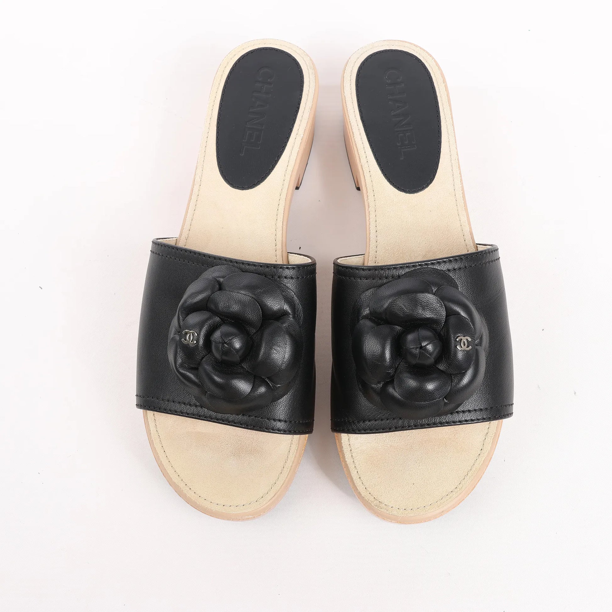 Chanel Camellia Wood x Leather Mules in Black, Size 41 EU
