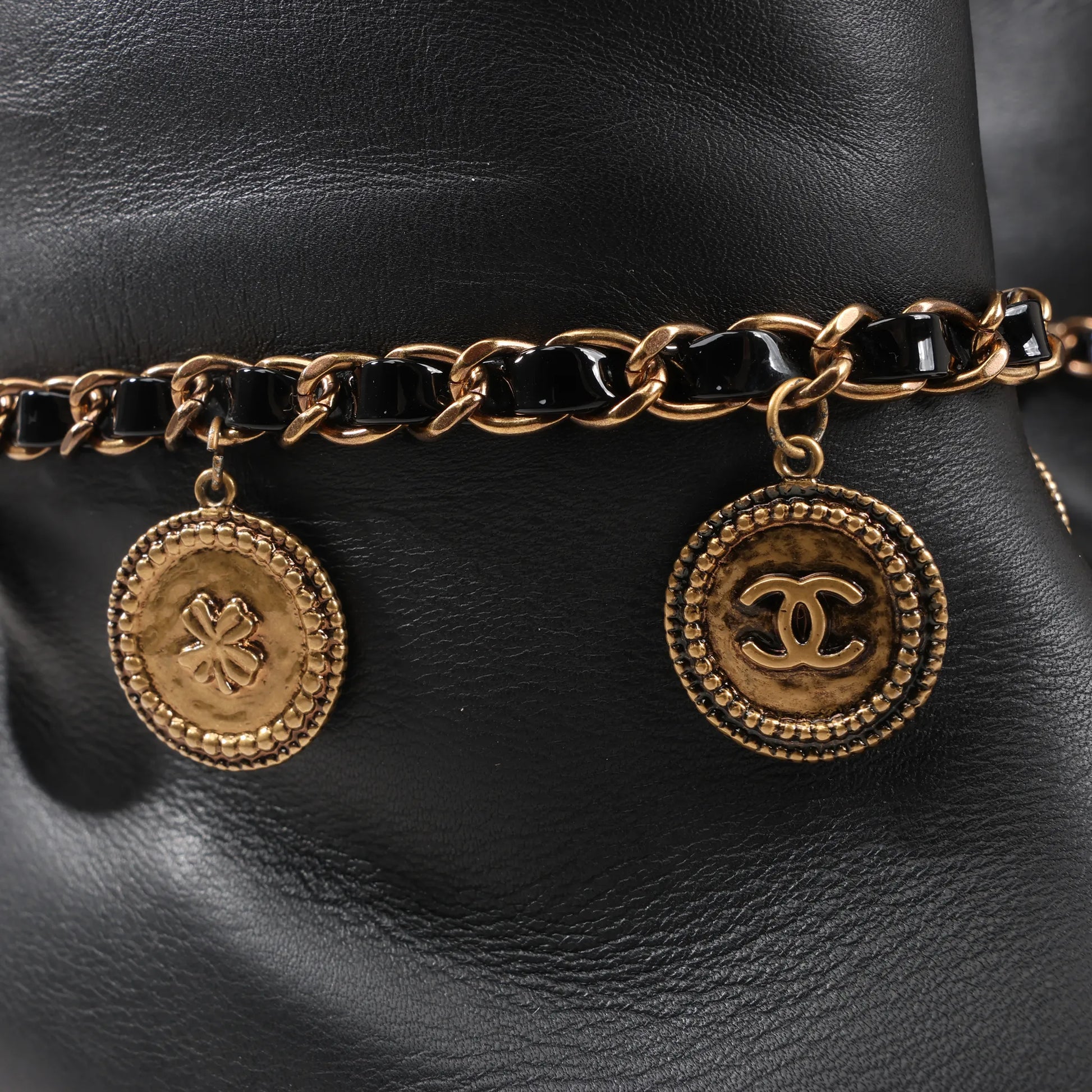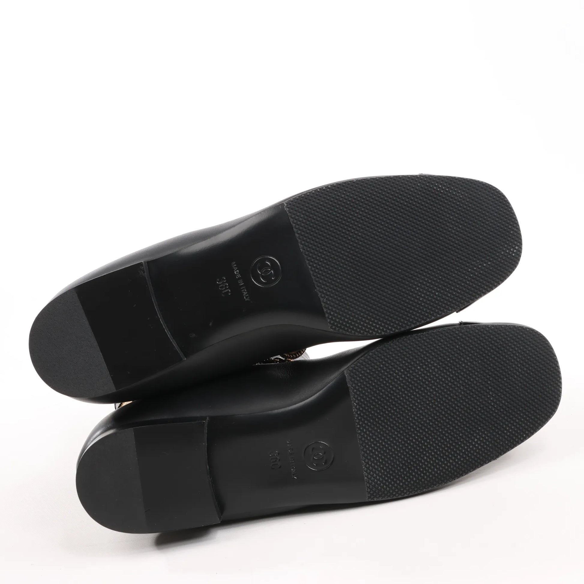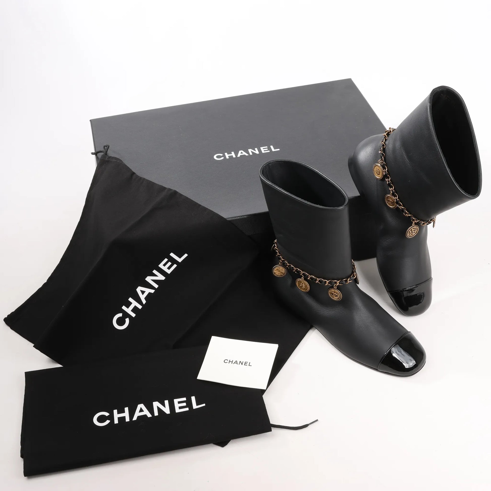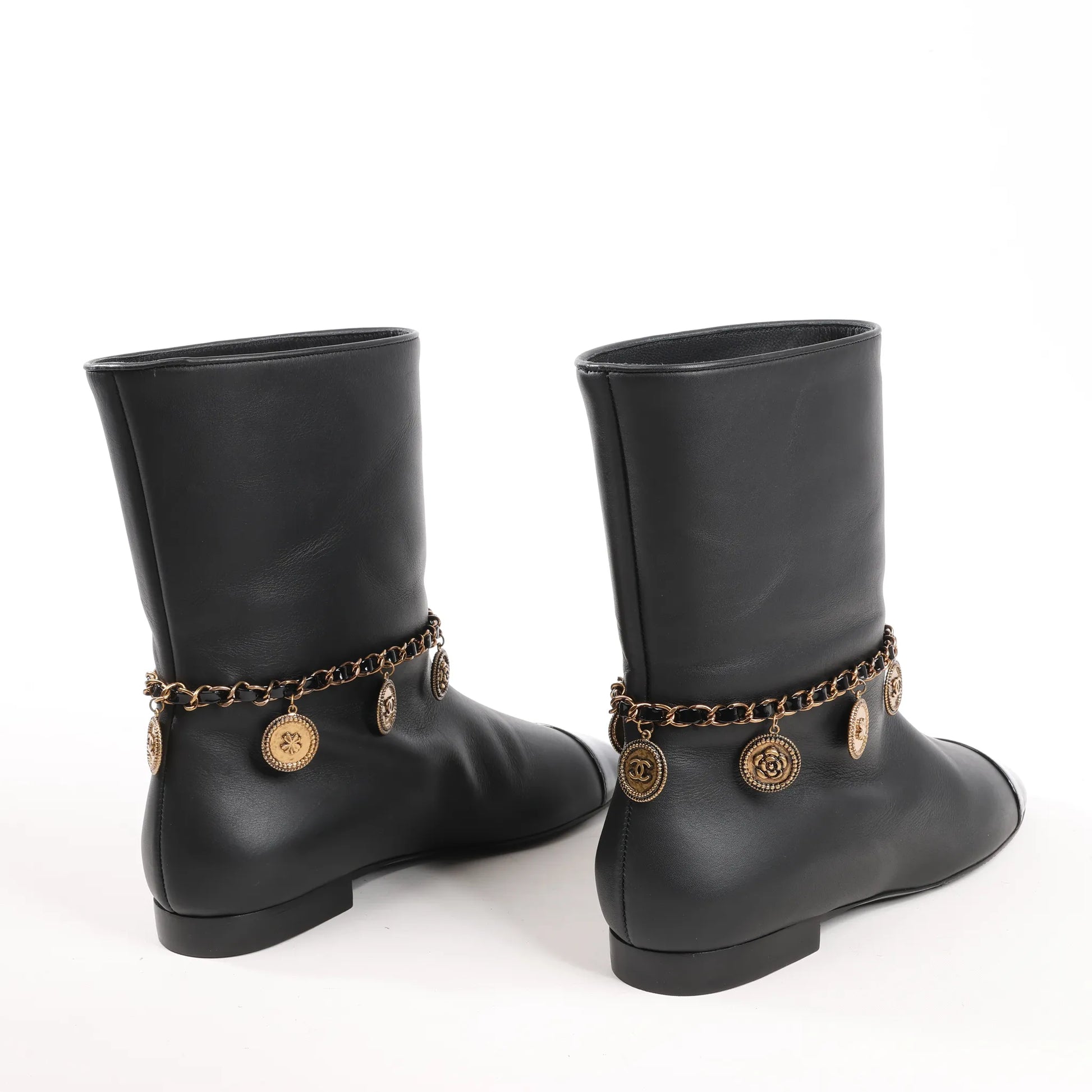 Add a touch of glamour to your step with the Chanel Coco Mark Camelia 17A Ankle Boots in black leather. Featuring gold-tone charm chain detailing, glossy cap toe, and refined elegance, these size 36 EU boots are a statement in luxury.