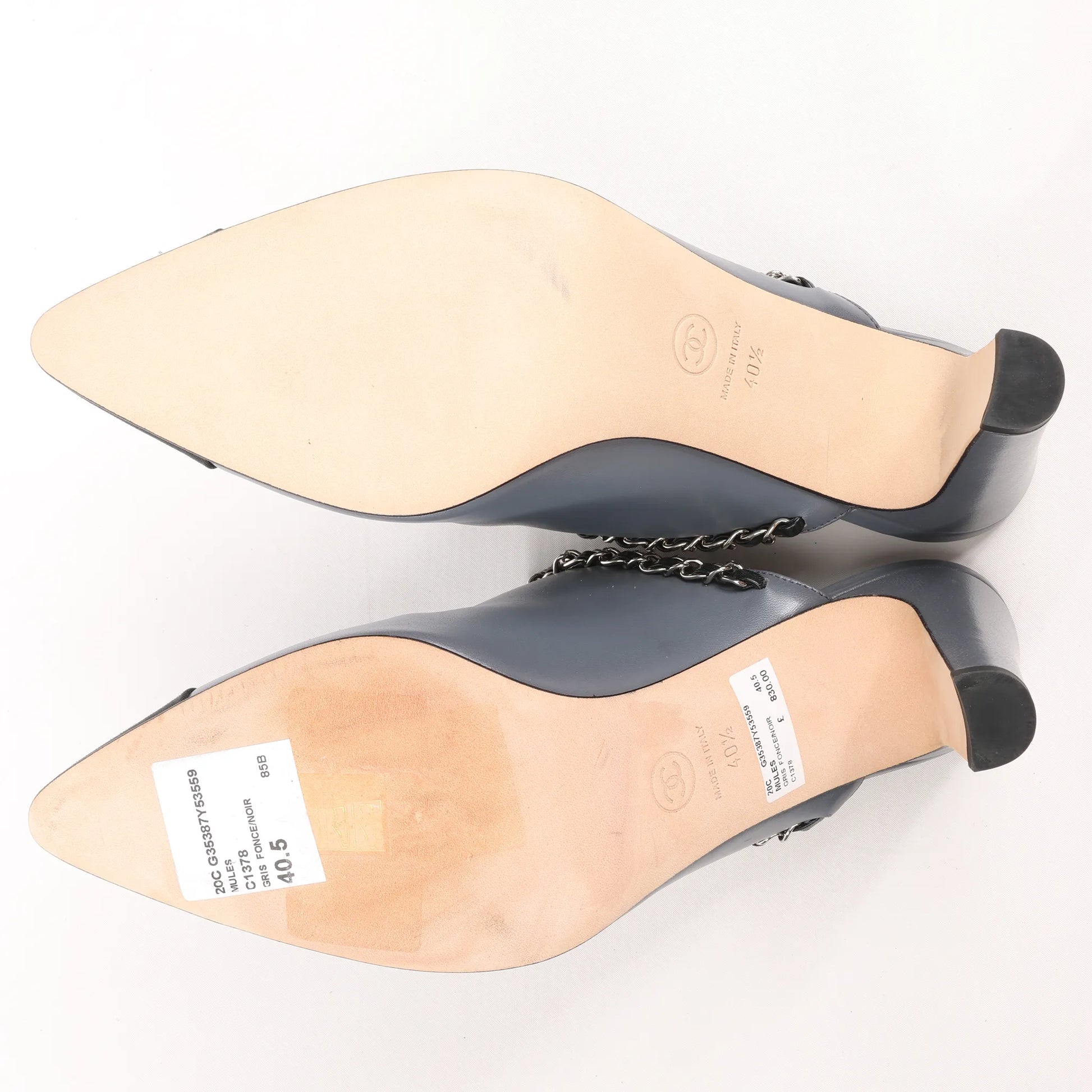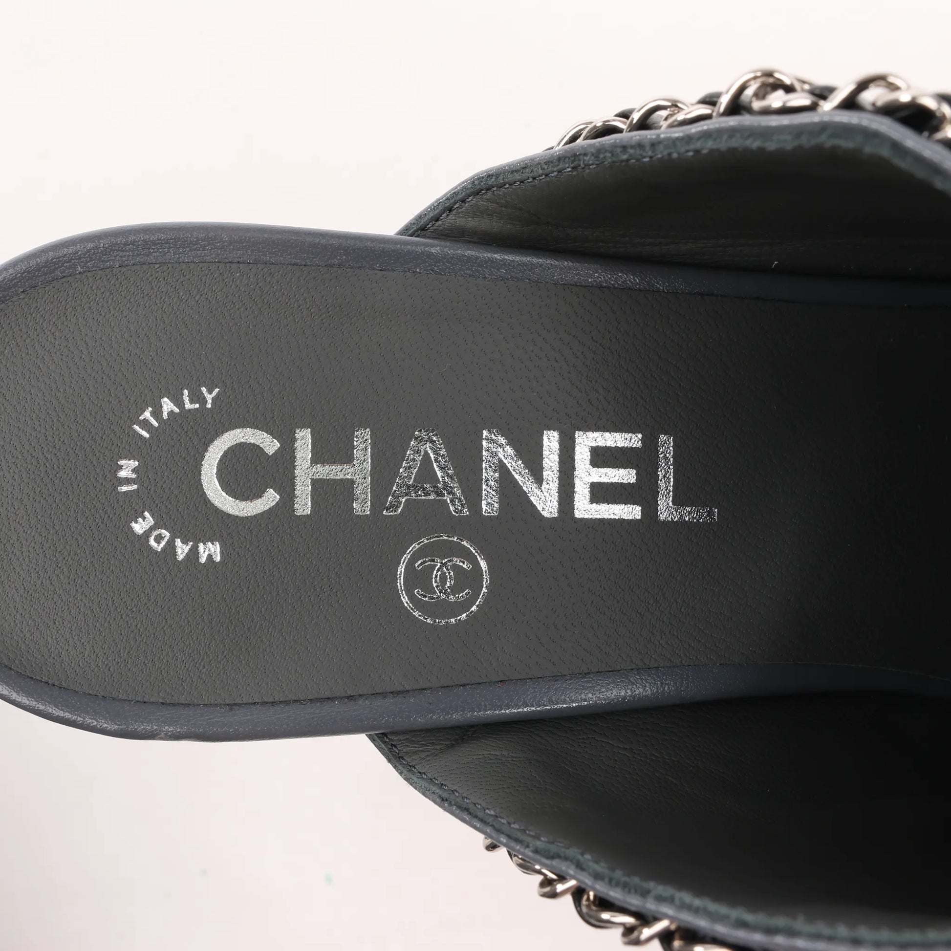 CHANEL Coco Mark Chain Leather Mule Sandals in Gray G35387, Size 40.5 EU