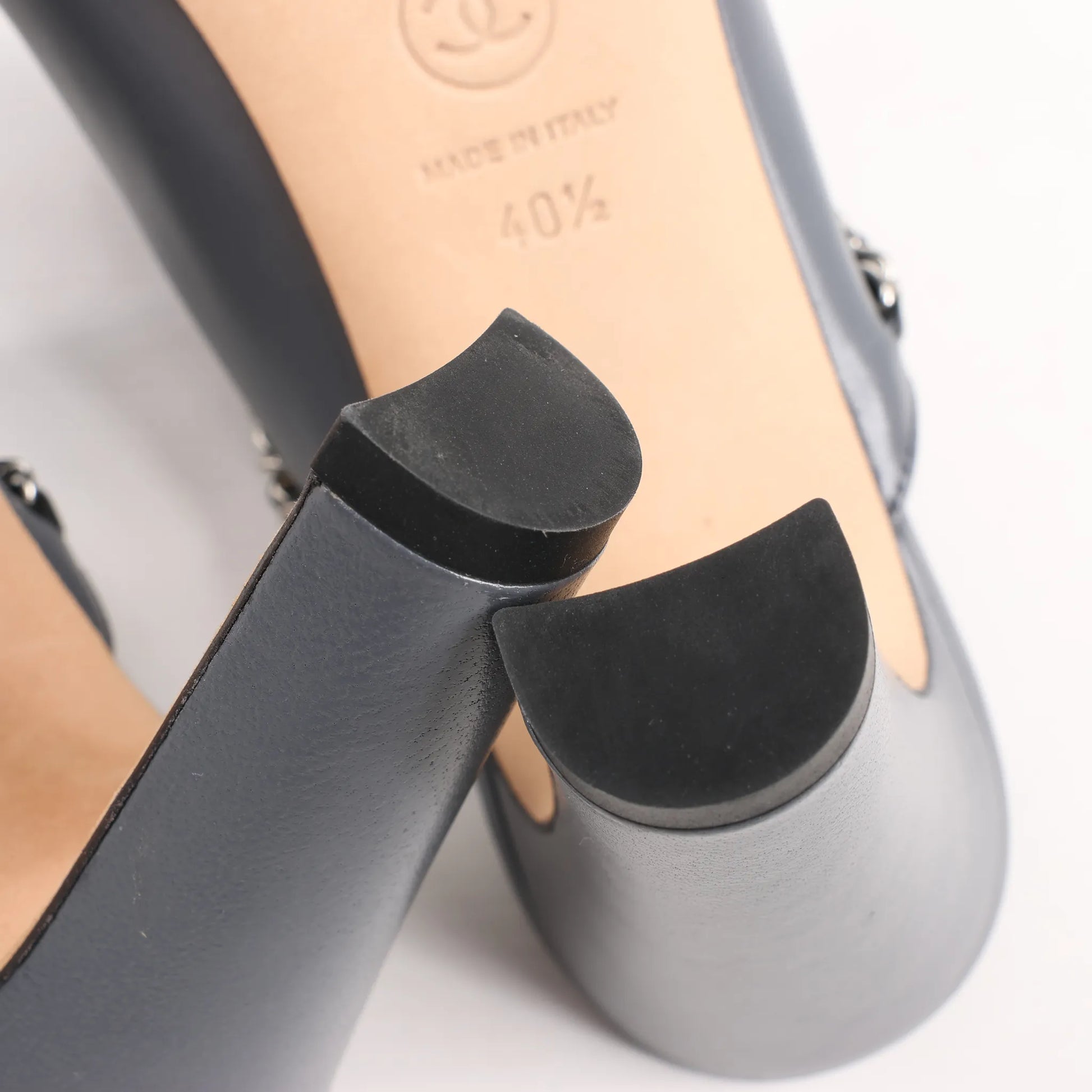 Step into elegance with the CHANEL Coco Mark Chain Mule Sandals in gray leather. Featuring the signature CC logo, chain trim, and contrasting black cap toe, these size 40.5 EU heels exude timeless sophistication and chic appeal.