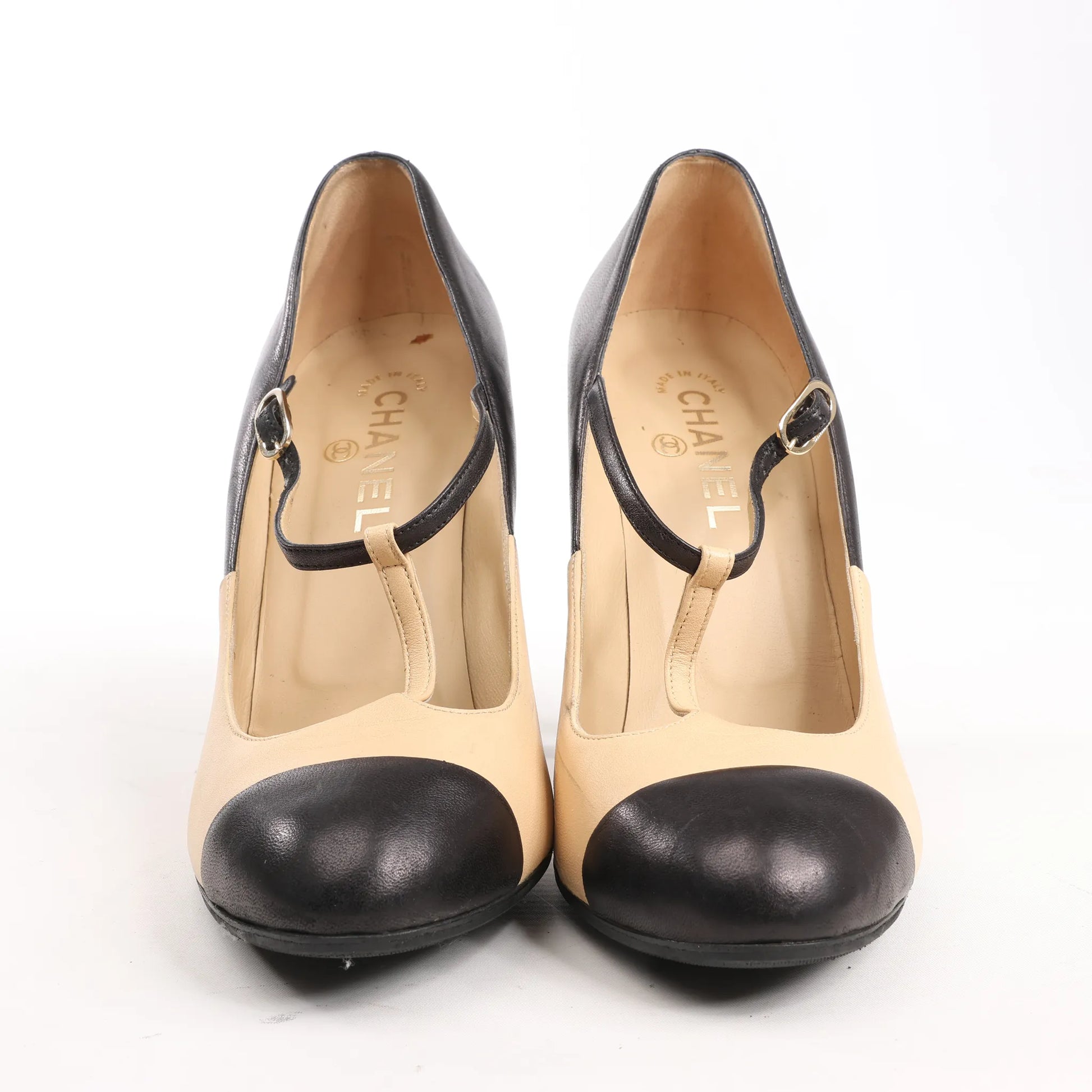 Classic meets chic in these Chanel Coco Mark Leather Heels, style G26228. Featuring a beige and black color block design with a T-strap silhouette and the signature Coco Mark logo at the heel, these size 40 EU pumps embody timeless elegance.