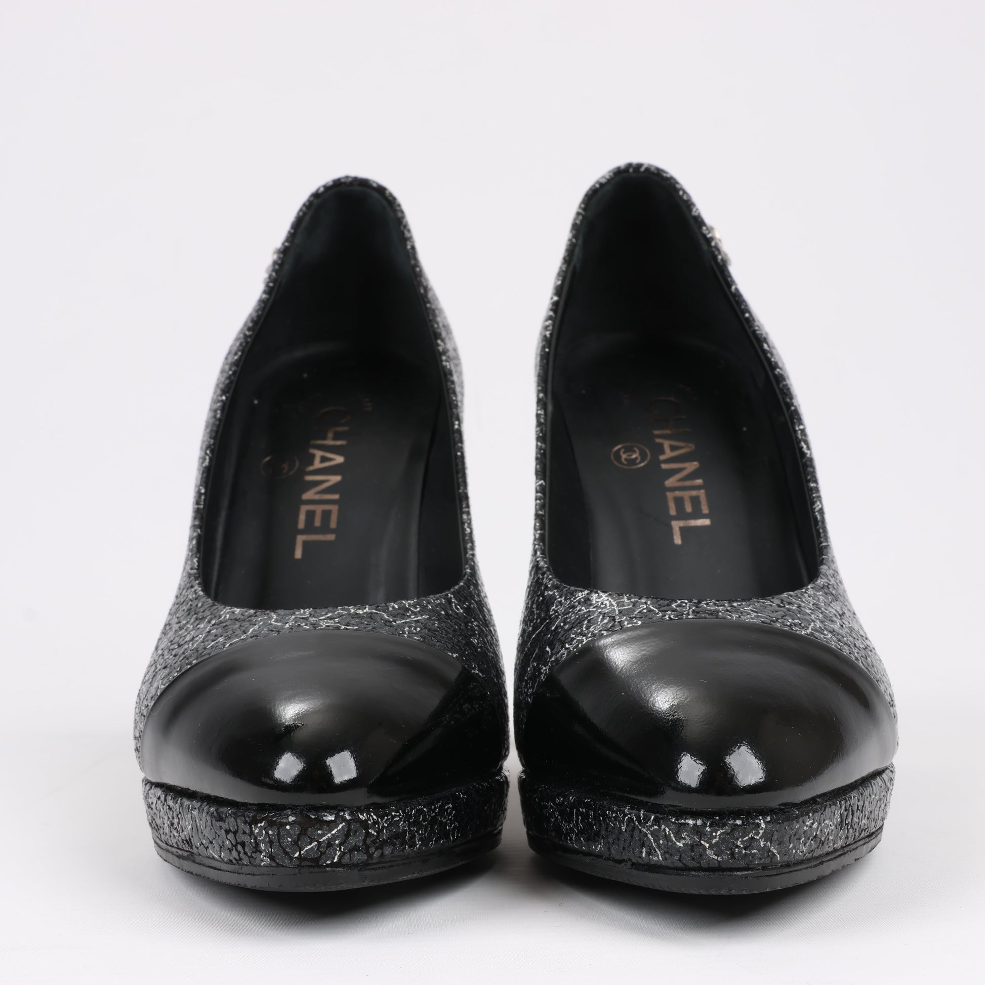 Chanel Coco Mark leather heels in black and silver, size 36 EU. Featuring a striking cracked metallic finish, signature cap toe, and elegant silhouette, these pumps exude timeless sophistication. A perfect blend of classic Chanel style and modern edge.