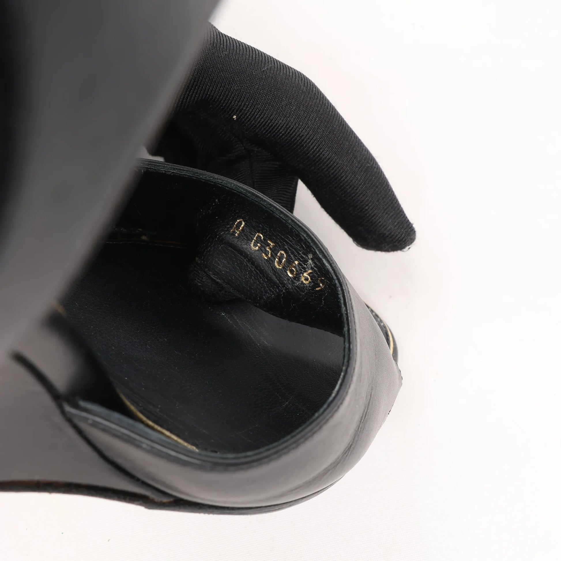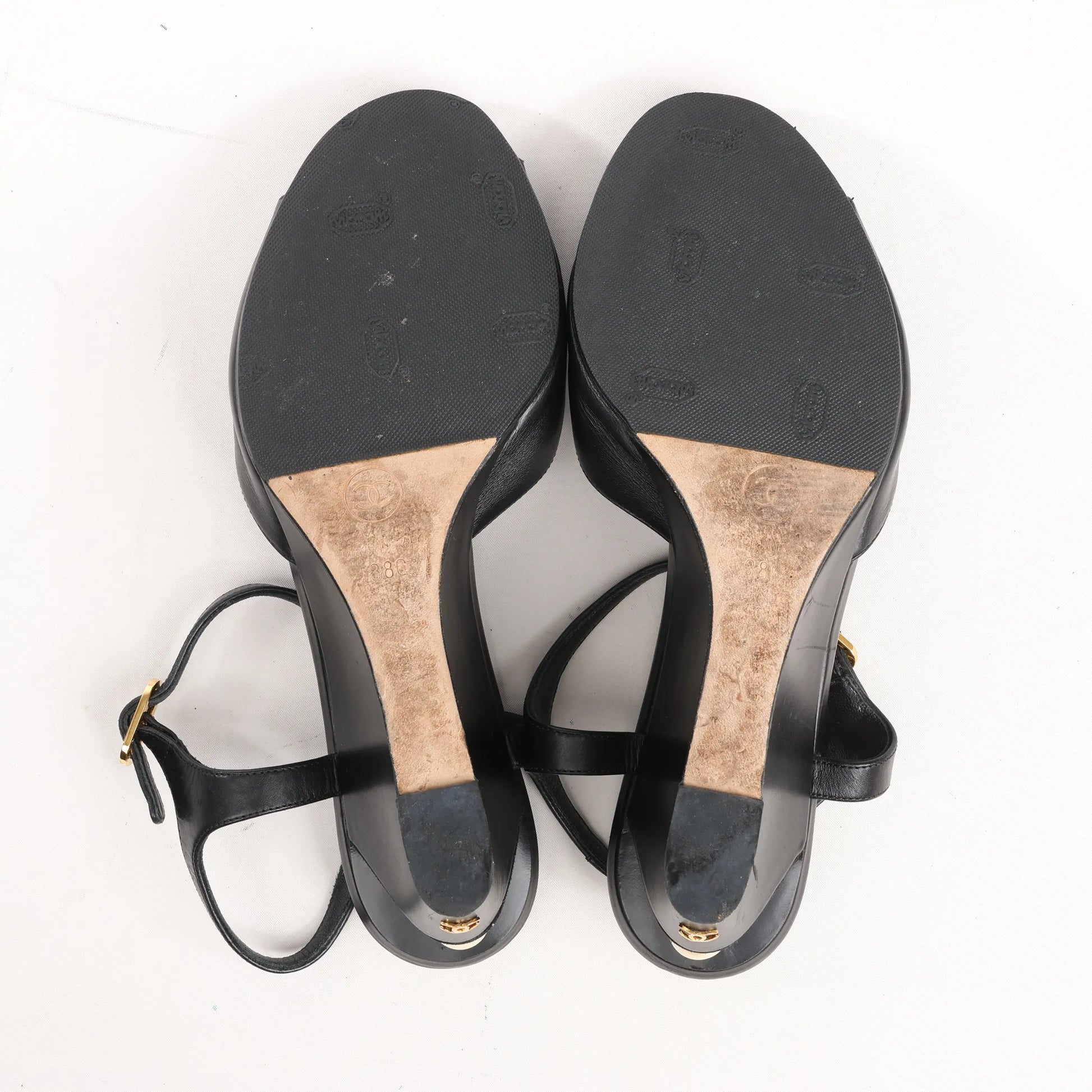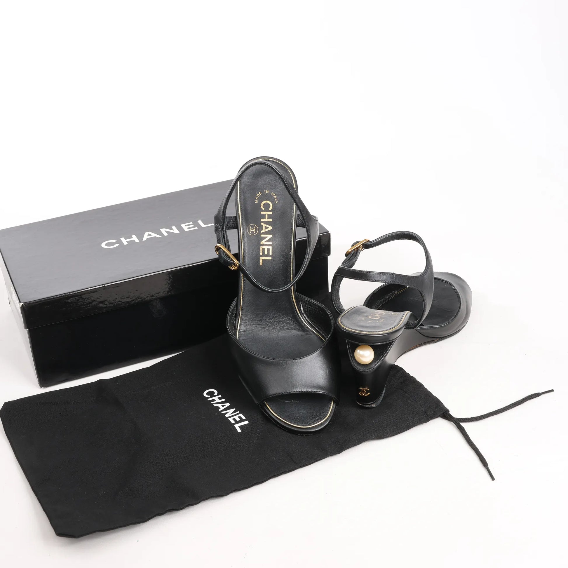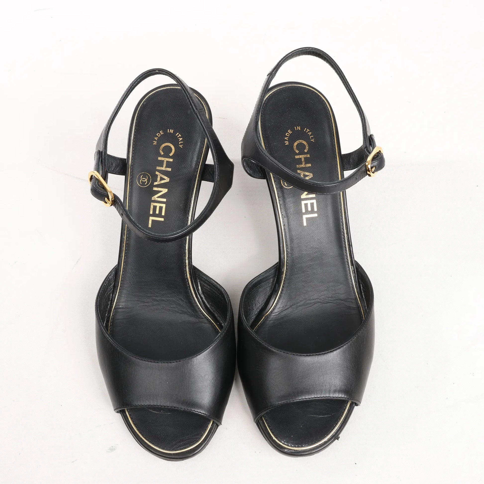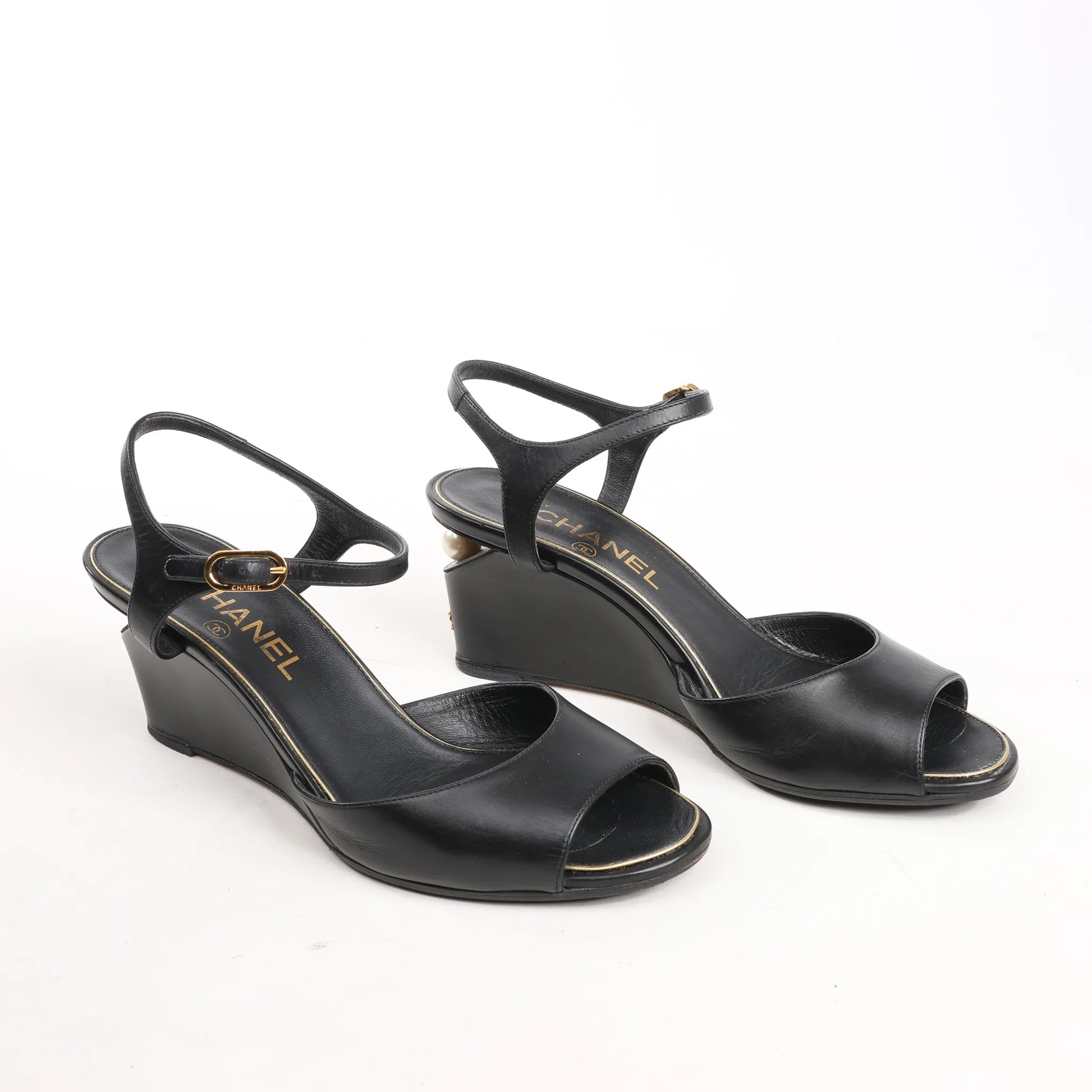 Step into timeless elegance with these CHANEL Coco Mark leather sandals in black. Featuring a sleek wedge heel accented with the signature pearl and gold-tone buckle, these size 38 EU sandals are a sophisticated choice for any occasion.
