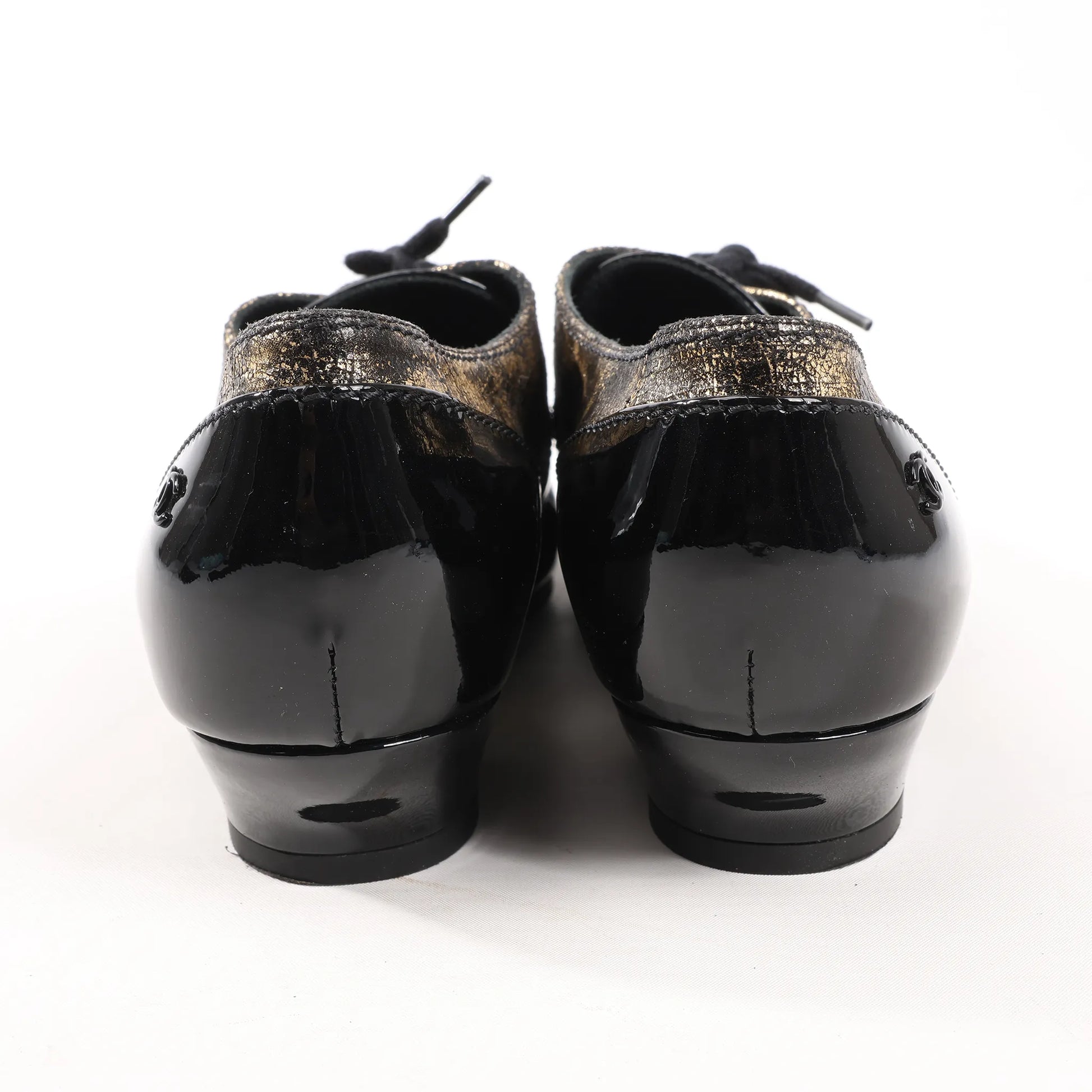 Chanel Coco Mark loafers in black and gold patent leather (G34275) blend artistic flair with timeless elegance. Featuring a lace-up front and low heel, these EU size 37 shoes are bold yet refined.