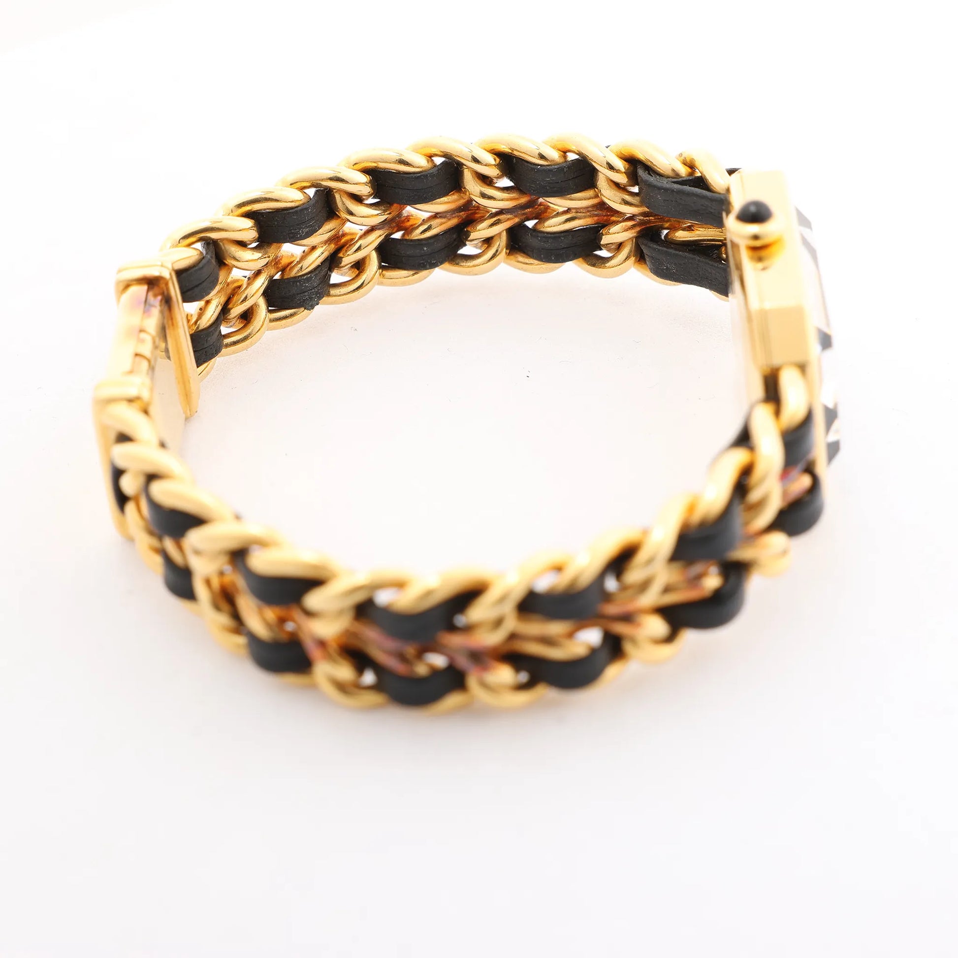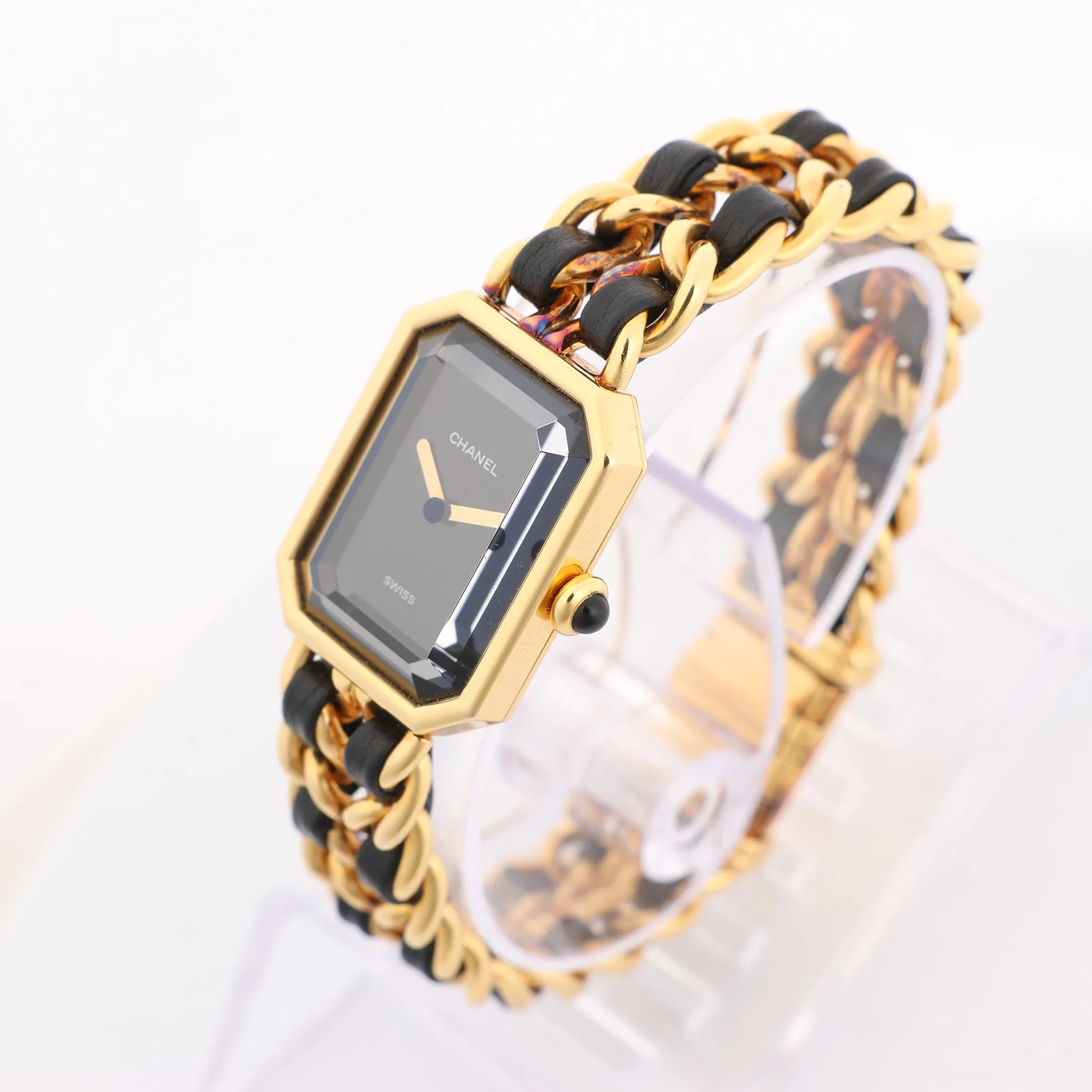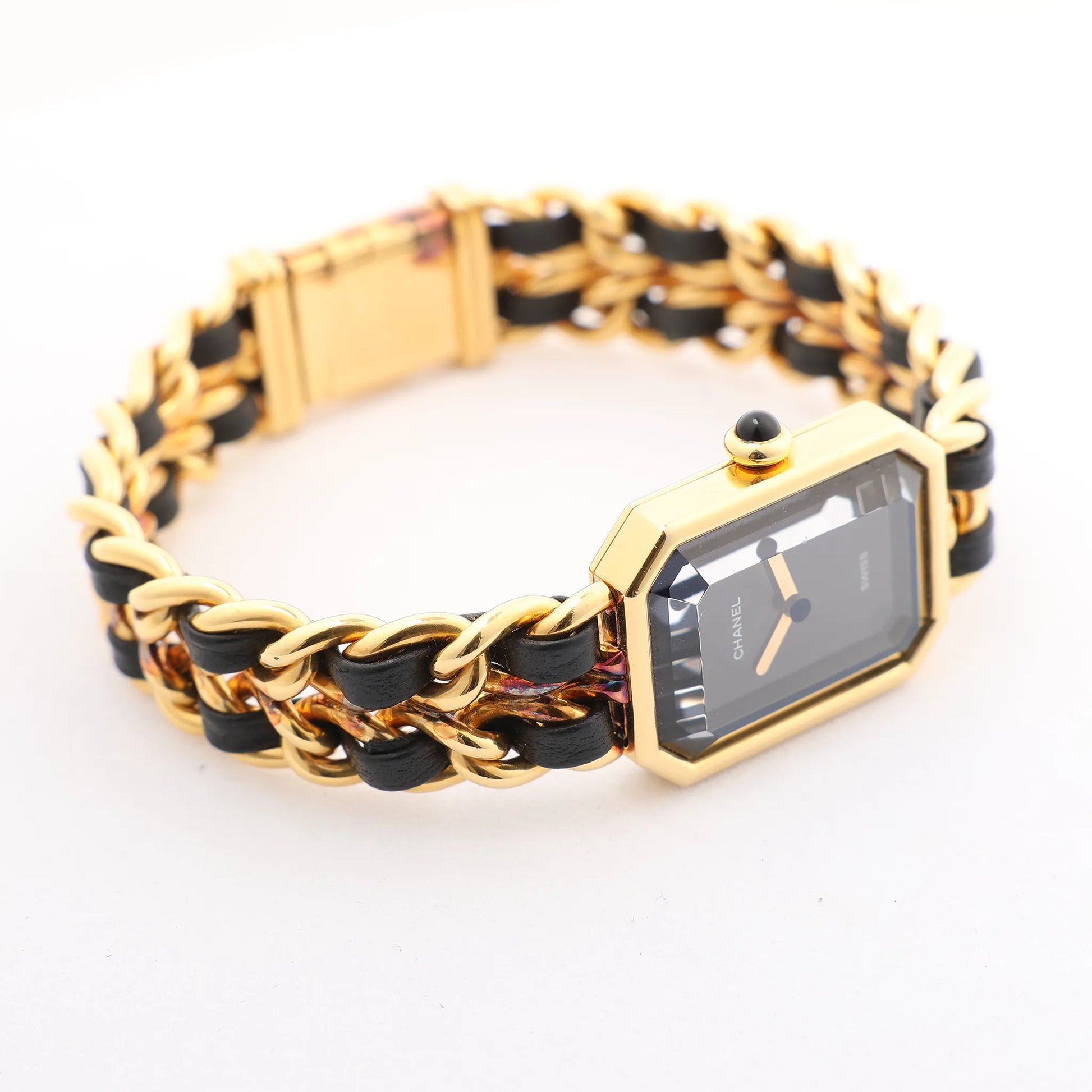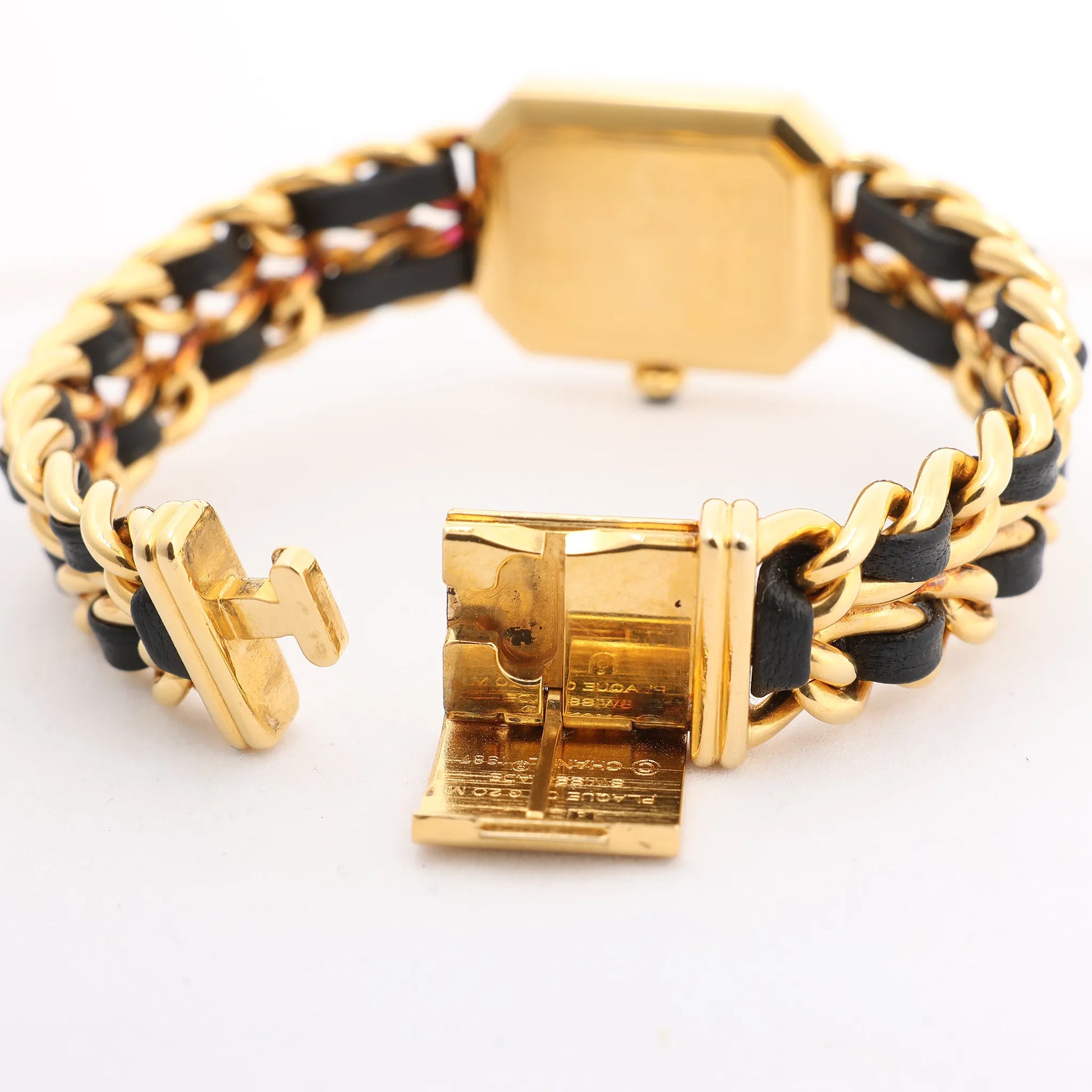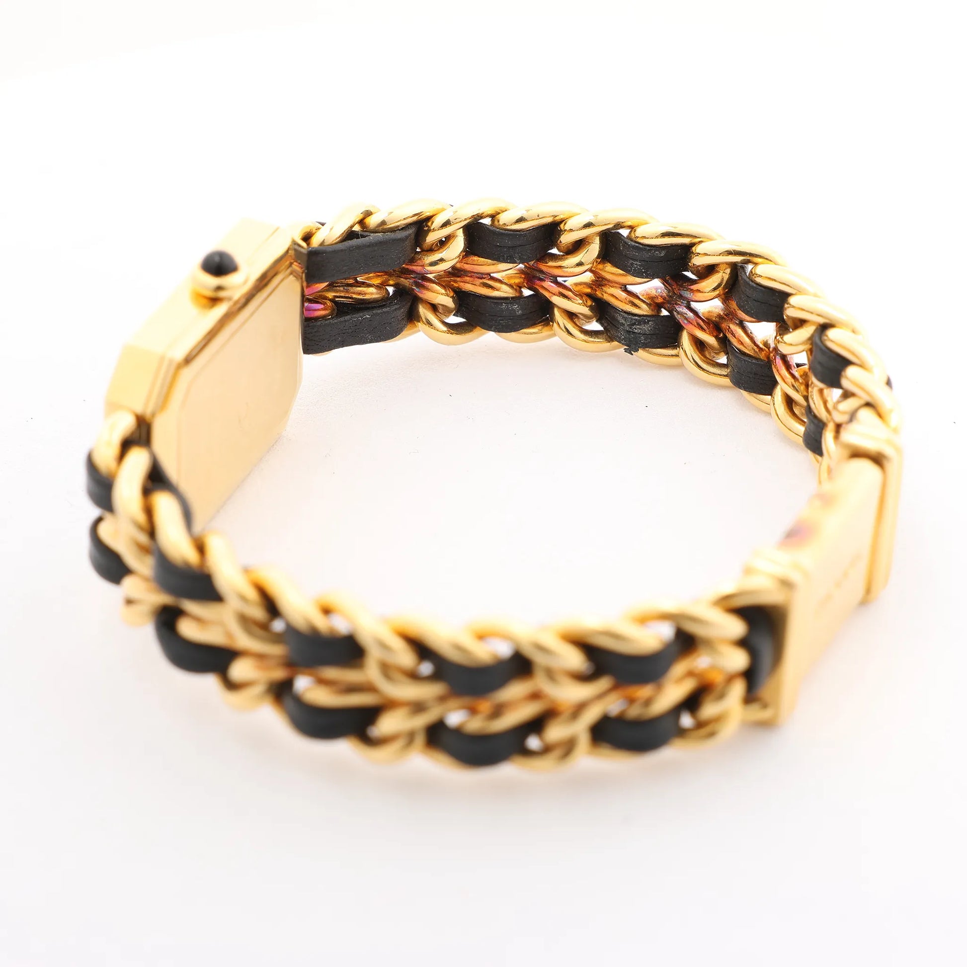 The Chanel Première M H6951 is a timeless icon of elegance, featuring a black lacquered dial, gold-plated case, and a signature chain-link bracelet interwoven with black leather. A refined statement of Parisian luxury.