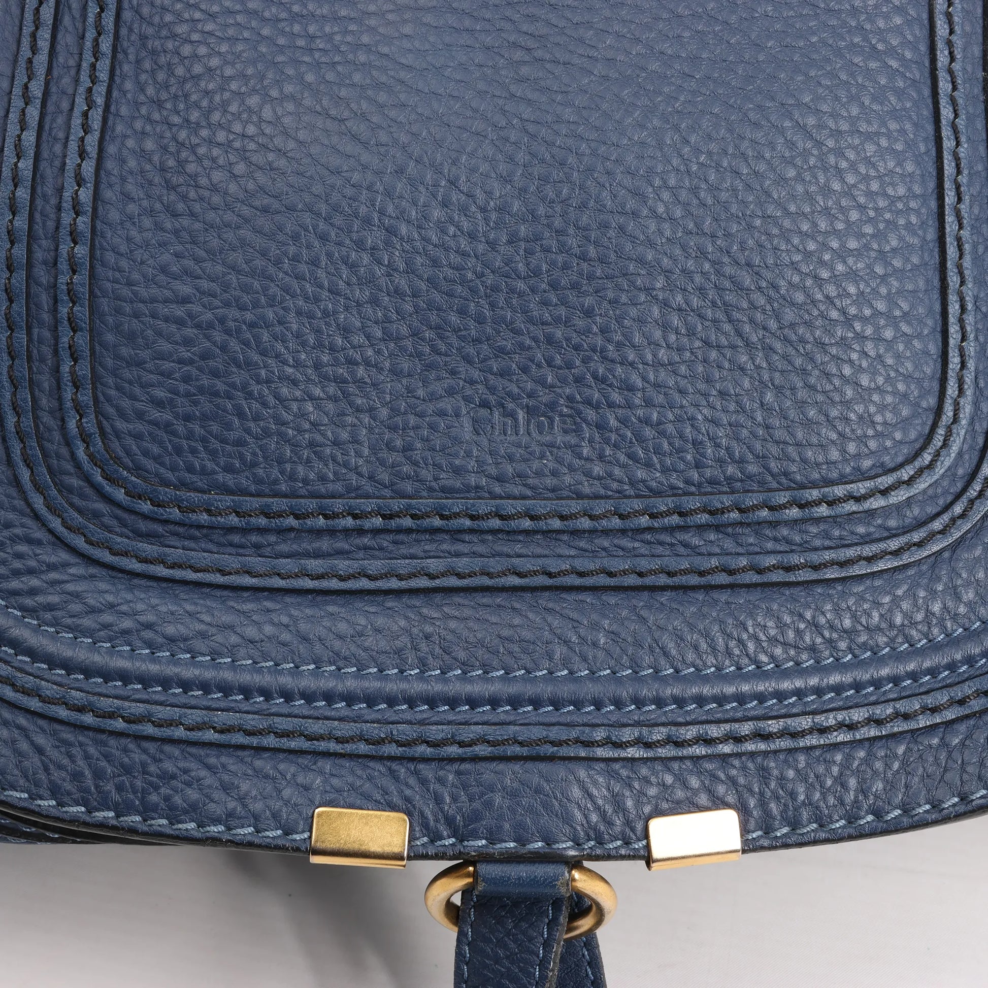 Effortlessly chic, the Chloé Marcie Medium 2-Way Handbag in navy blue grained leather features curved stitching, gold-tone hardware, and dual carry options. A perfect balance of bohemian charm and everyday functionality.