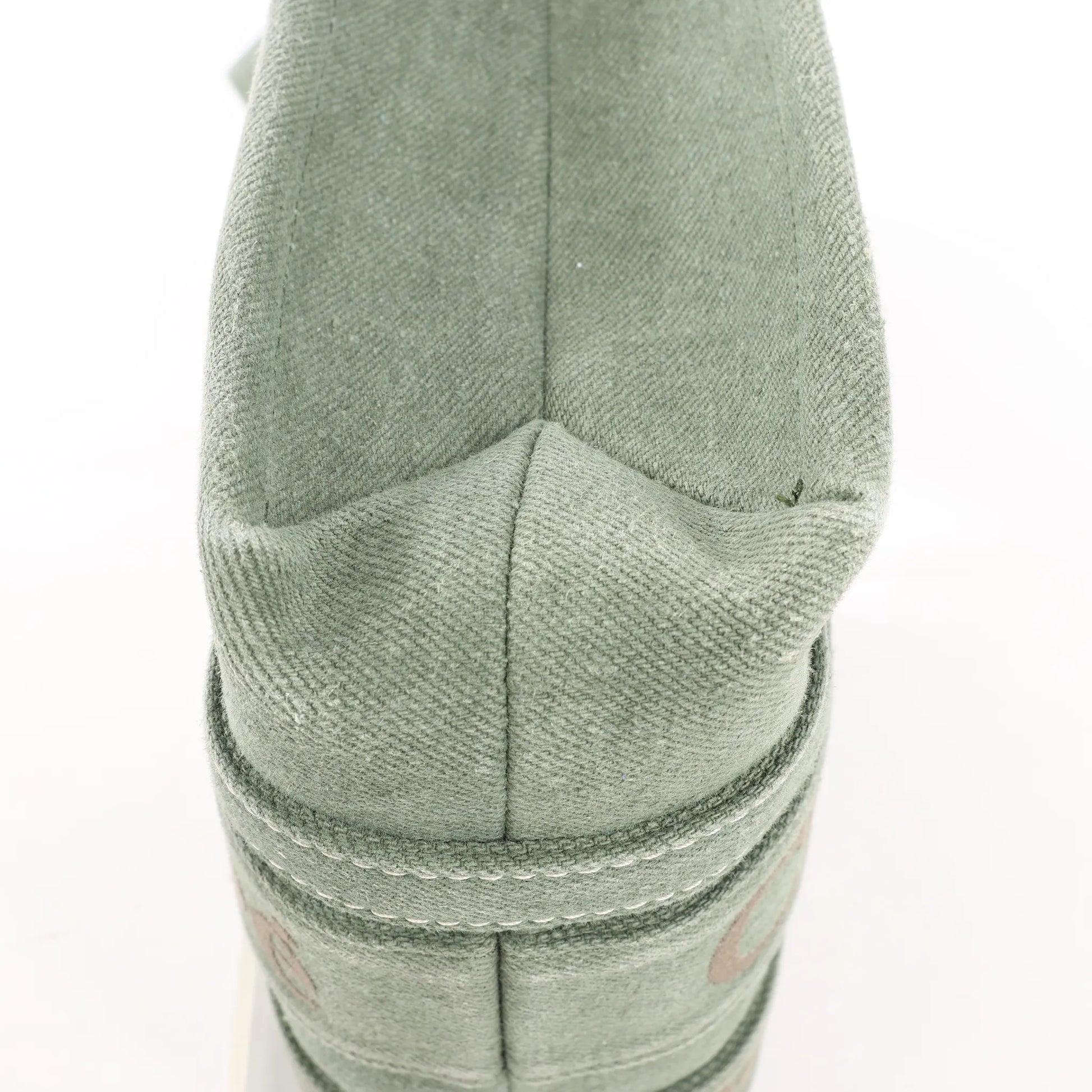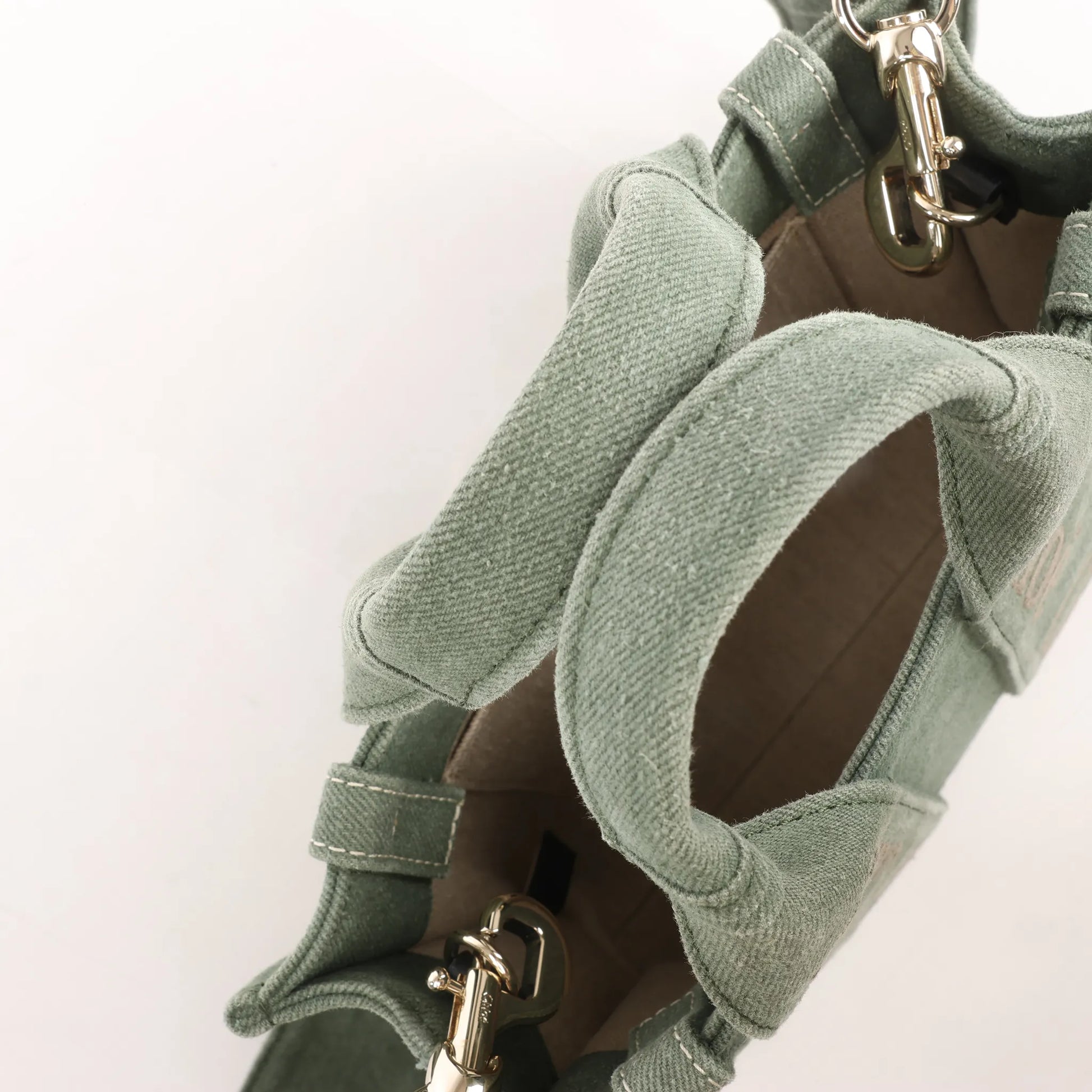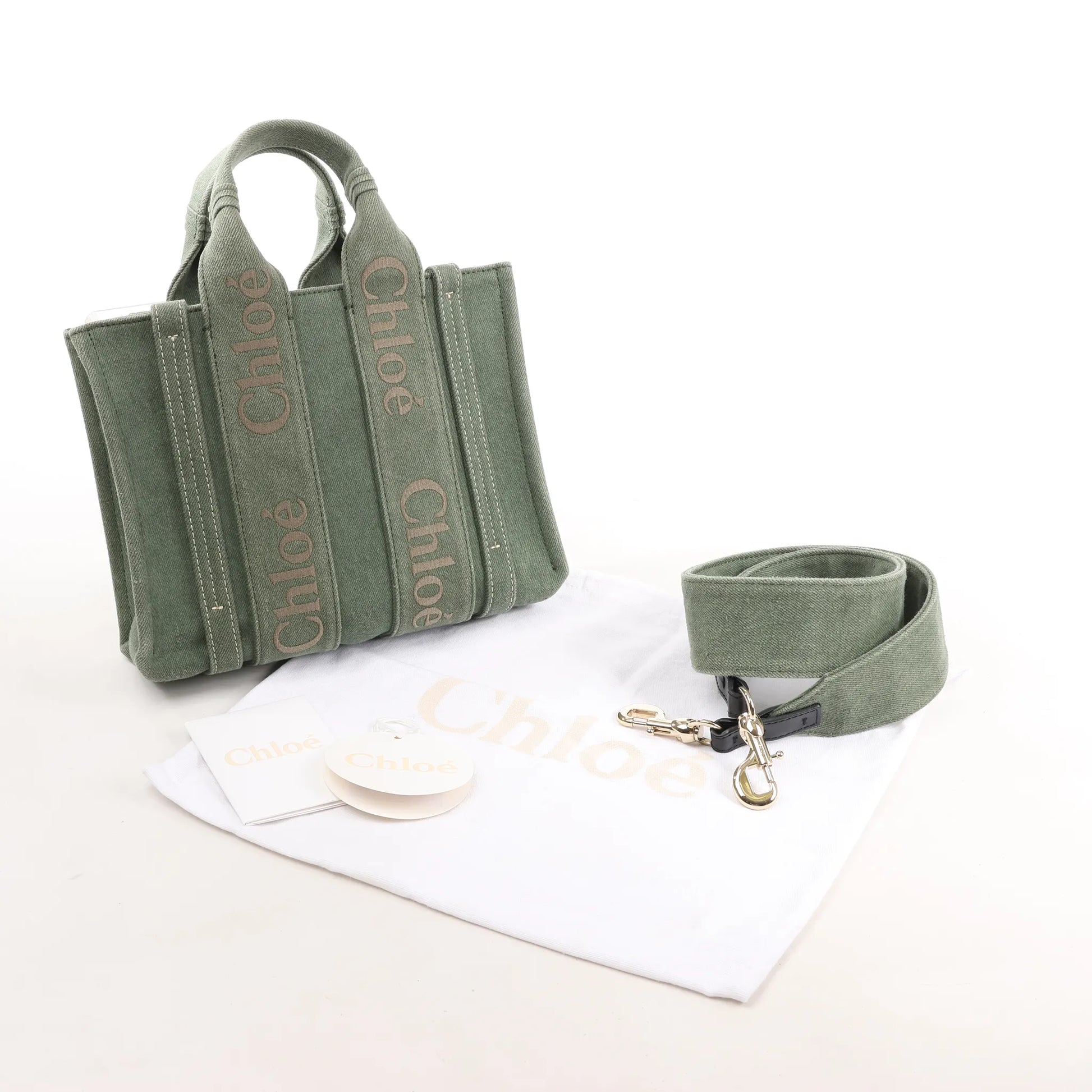 The Chloé Woody Small Handbag in green canvas blends casual elegance with utility, featuring logo-embroidered handles and a versatile 2-way carry design.