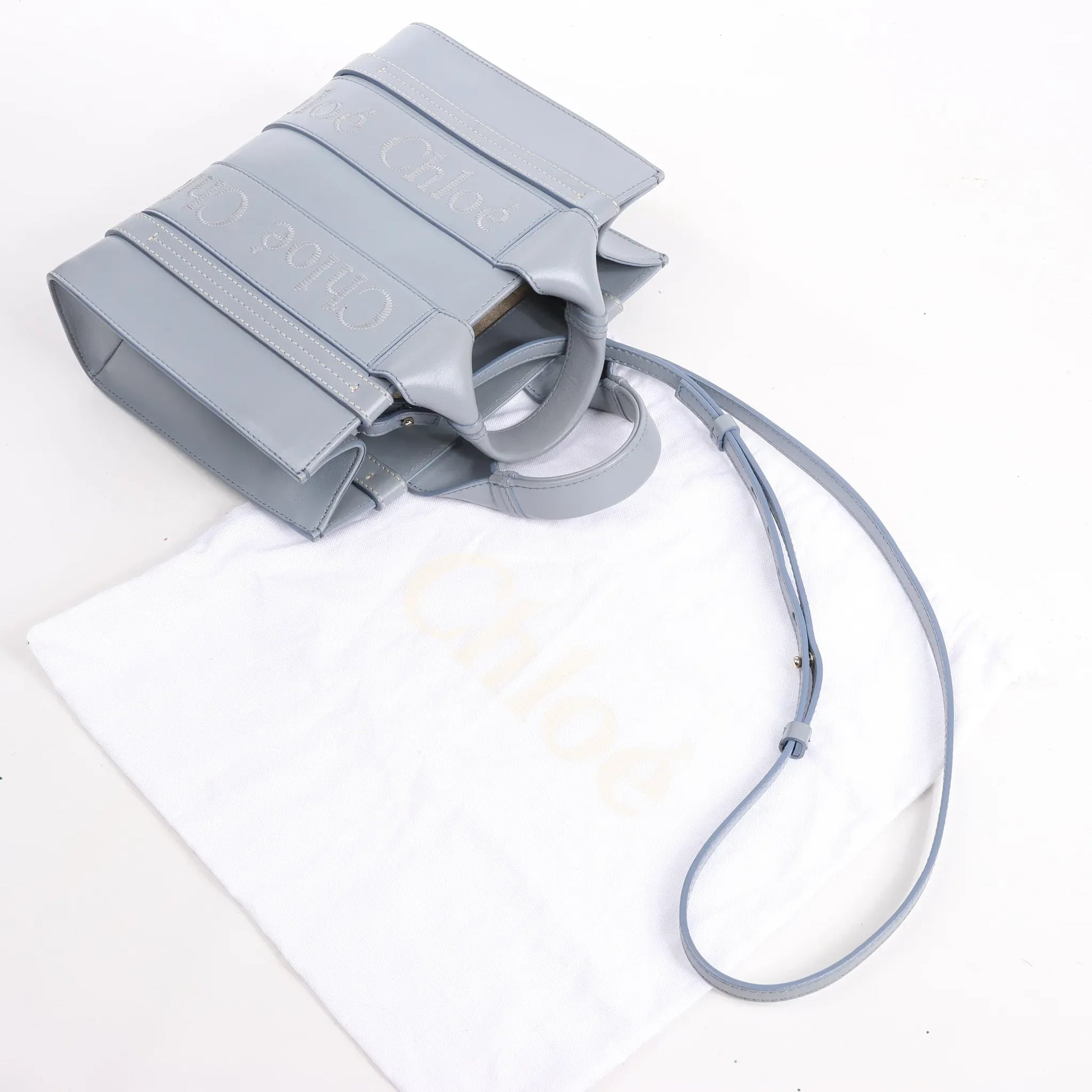 The Chloé Woody Small 2Way Handbag in Blue showcases refined elegance with smooth leather and signature logo-embroidered straps. Featuring top handles and a detachable shoulder strap, it’s the perfect mix of chic versatility and modern sophistication.