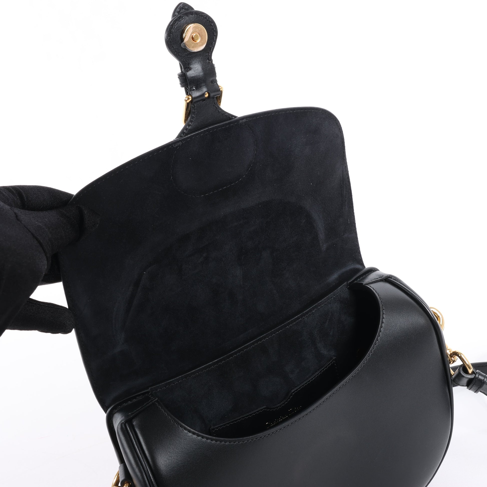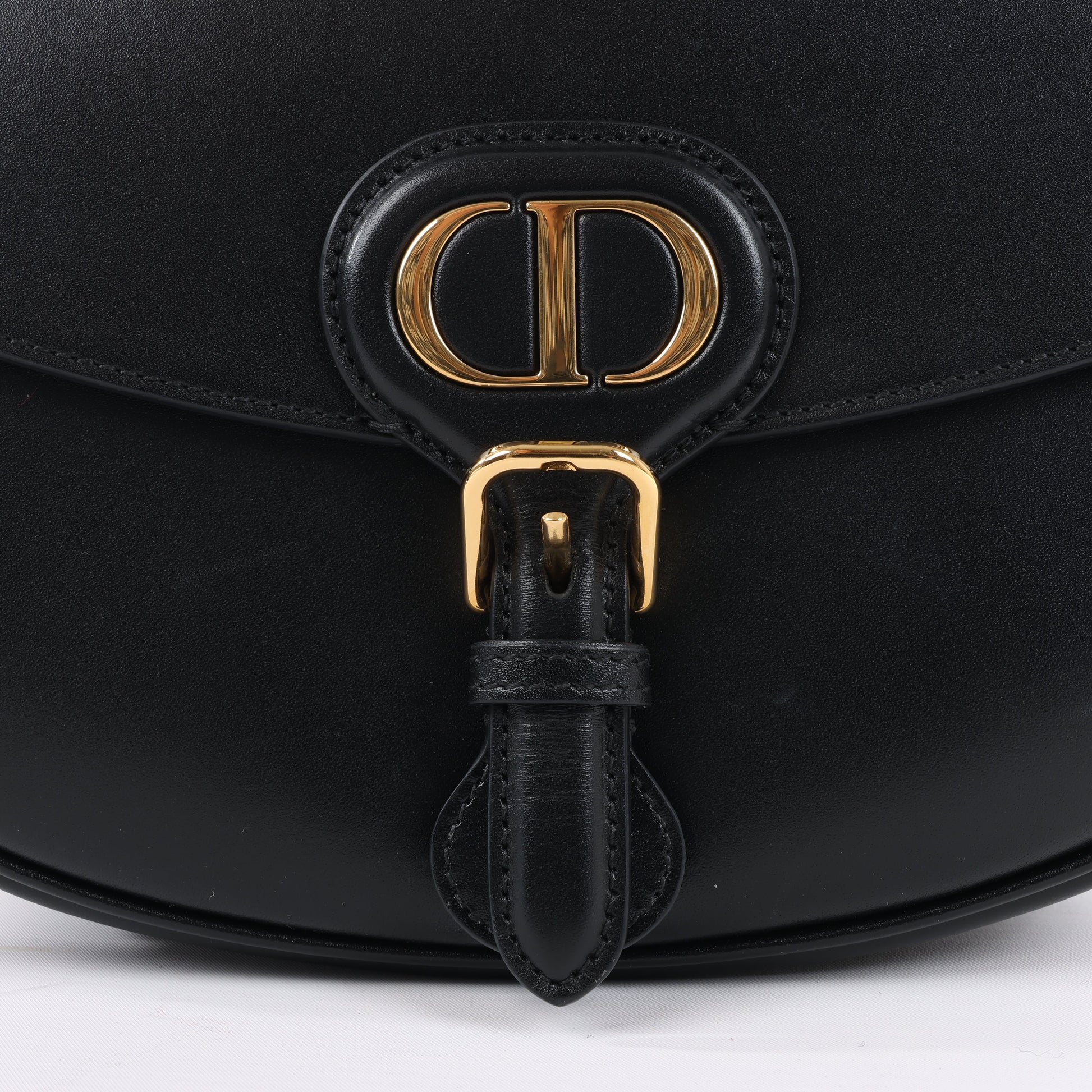 Dior Bobby Medium Shoulder Bag in black calfskin with gold-tone CD buckle. A refined flap silhouette and adjustable strap make this an effortlessly elegant everyday icon.